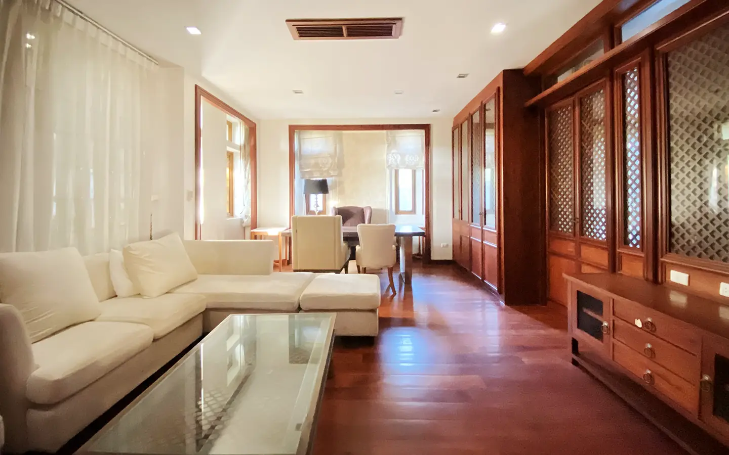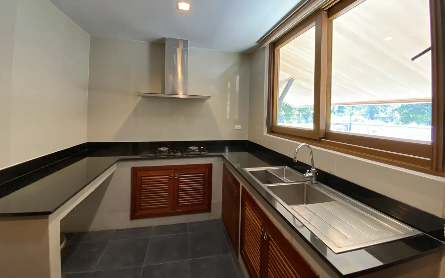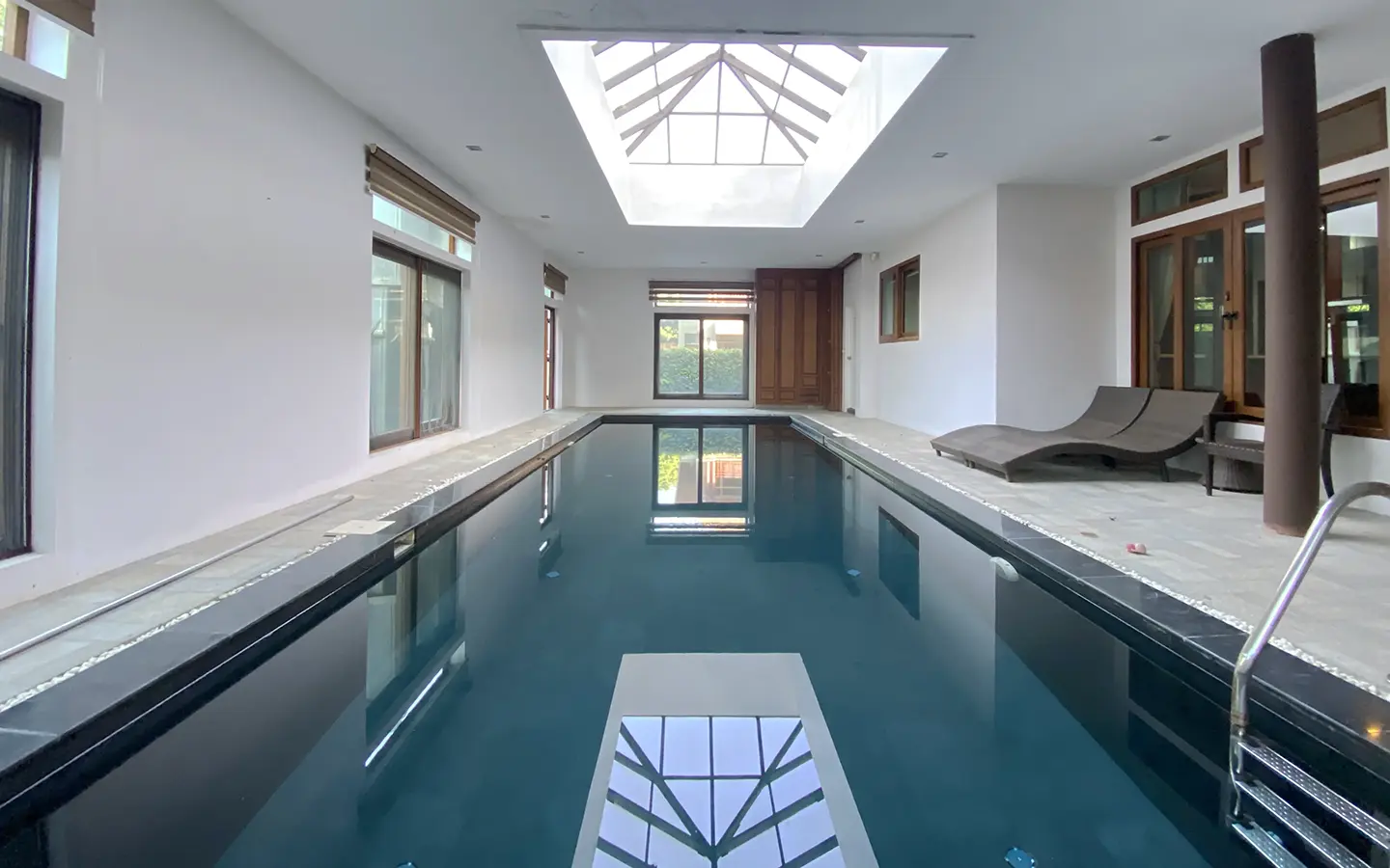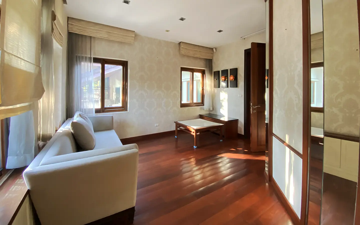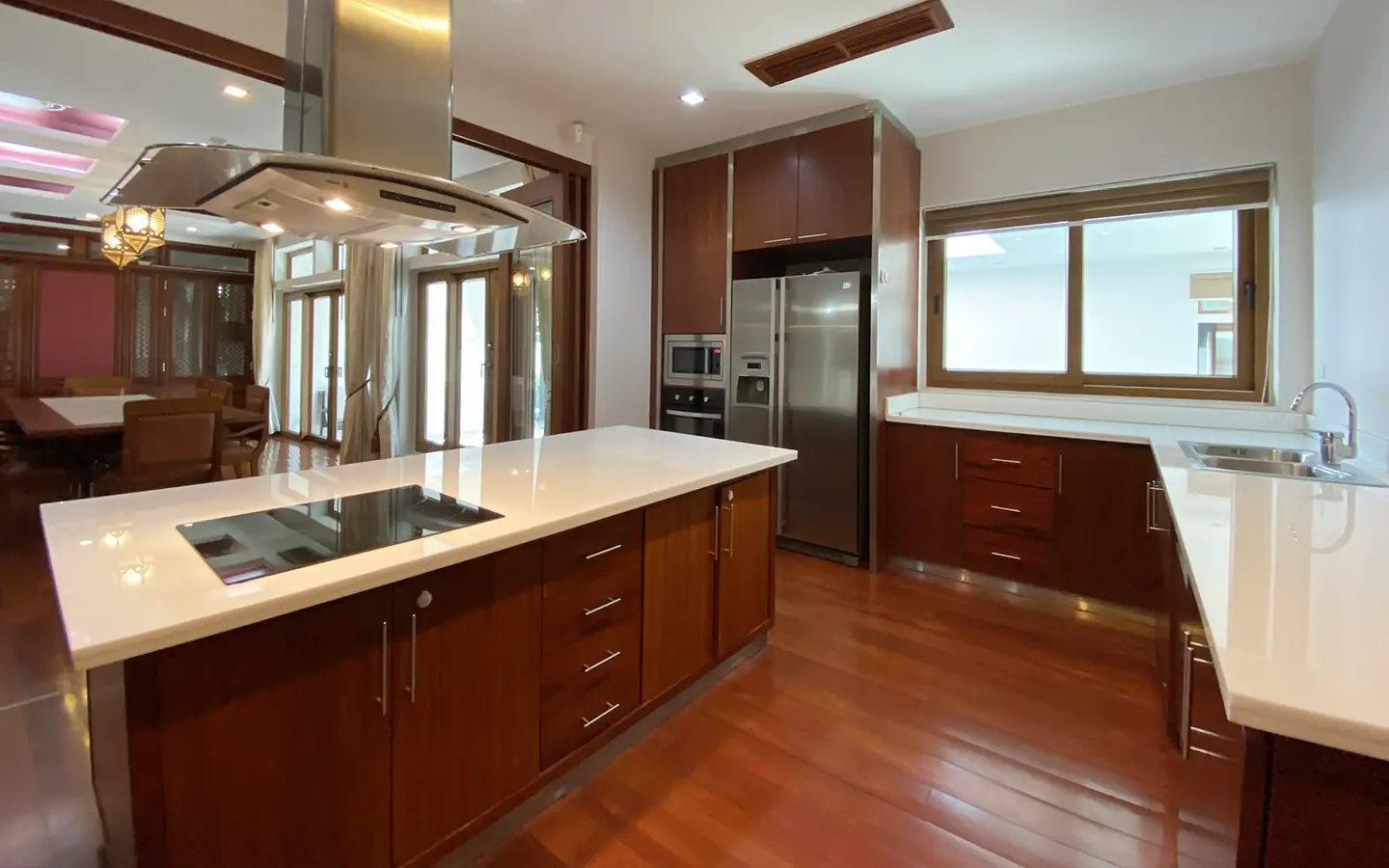 Being one of the very few properties in this exclusive and private state, the house occupies over half a rai of land, and has a lovely landscaped garden with a koi pond and a 4-car garage with storage room. The ensuite maid's quarter is attached here with access to the storage room and Thai kitchen. All fittings and trimmings in the house are of absolute high quality. The sitting room has a double ceiling featuring wood beams and a wood floor. The open-plan dining/kitchen room is spacious and has access to the covered saltwater swimming pool and the sitting deck by the garden. The beautiful open fully fitted Western kitchen comes with built-in appliances and a cooking island, great for entertaining. In addition, still on the ground floor, there is a study which could be used as a guest bedroom or a playroom, an ensuite guest bedroom with its own access to the front garden and a guest bathroom. All the rooms are neatly decorated and all feature beautiful wood trimmings.