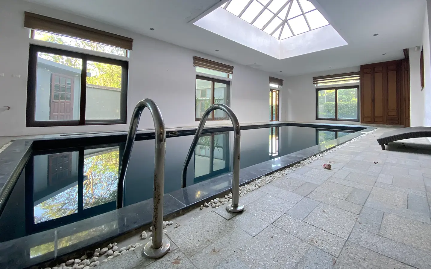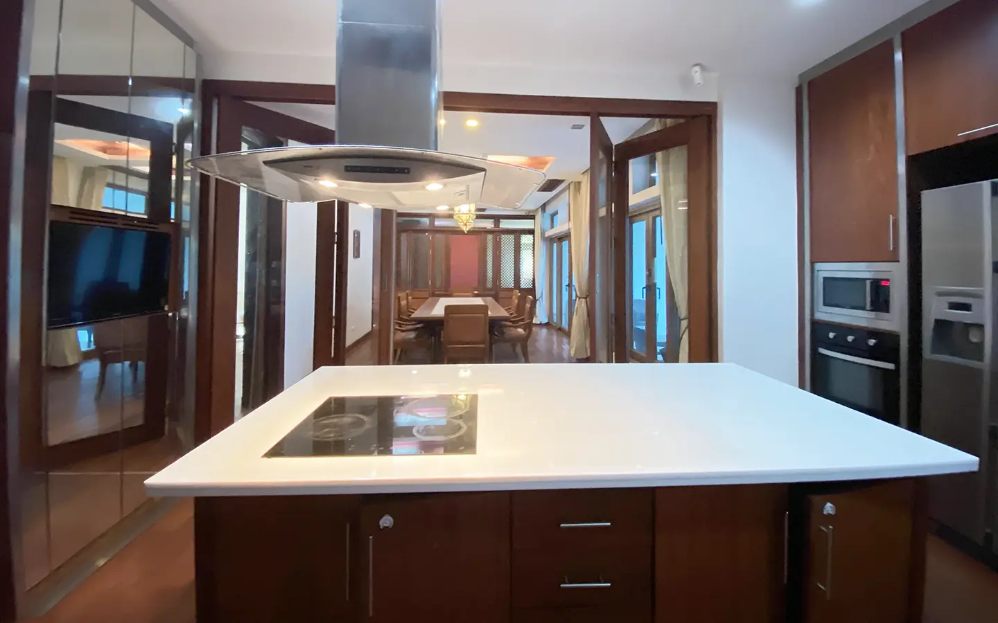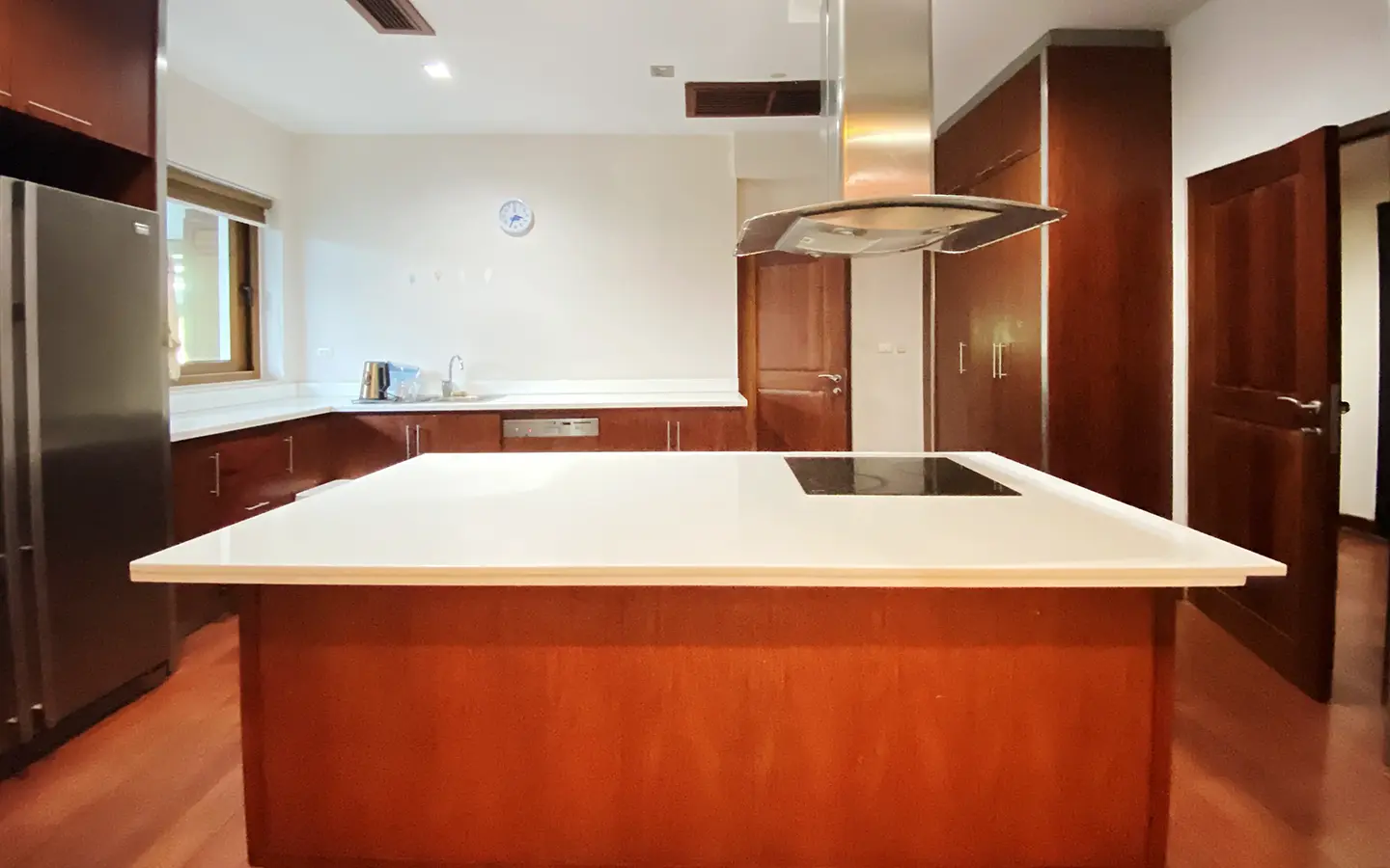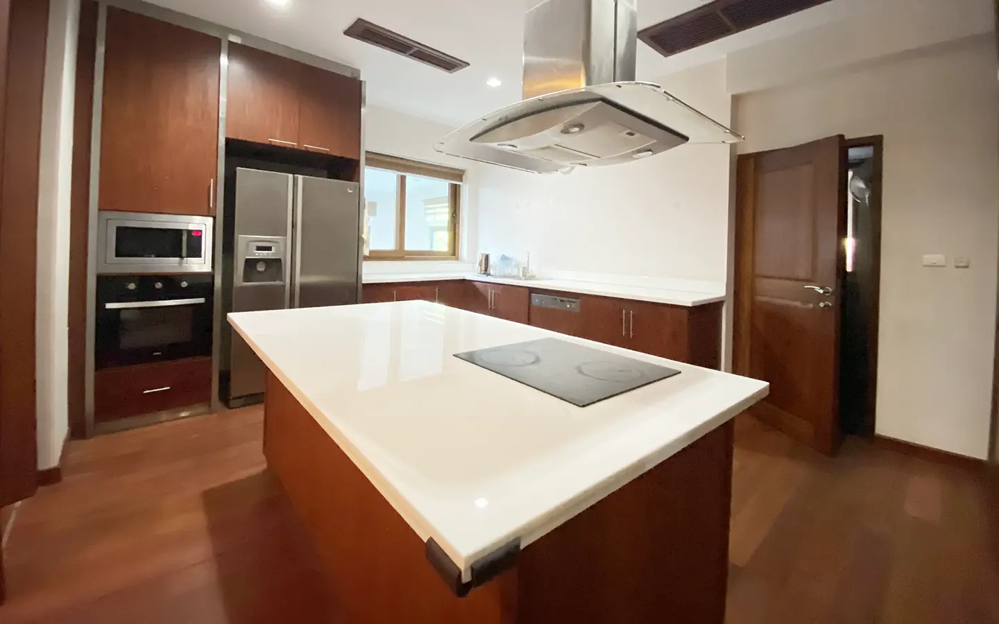 Being one of the very few properties in this exclusive and private state, the house occupies over half a rai of land, and has a lovely landscaped garden with a koi pond and a 4-car garage with storage room. The ensuite maid's quarter is attached here with access to the storage room and Thai kitchen. All fittings and trimmings in the house are of absolute high quality. The sitting room has a double ceiling featuring wood beams and a wood floor. The open-plan dining/kitchen room is spacious and has access to the covered saltwater swimming pool and the sitting deck by the garden. The beautiful open fully fitted Western kitchen comes with built-in appliances and a cooking island, great for entertaining. In addition, still on the ground floor, there is a study which could be used as a guest bedroom or a playroom, an ensuite guest bedroom with its own access to the front garden and a guest bathroom. All the rooms are neatly decorated and all feature beautiful wood trimmings.