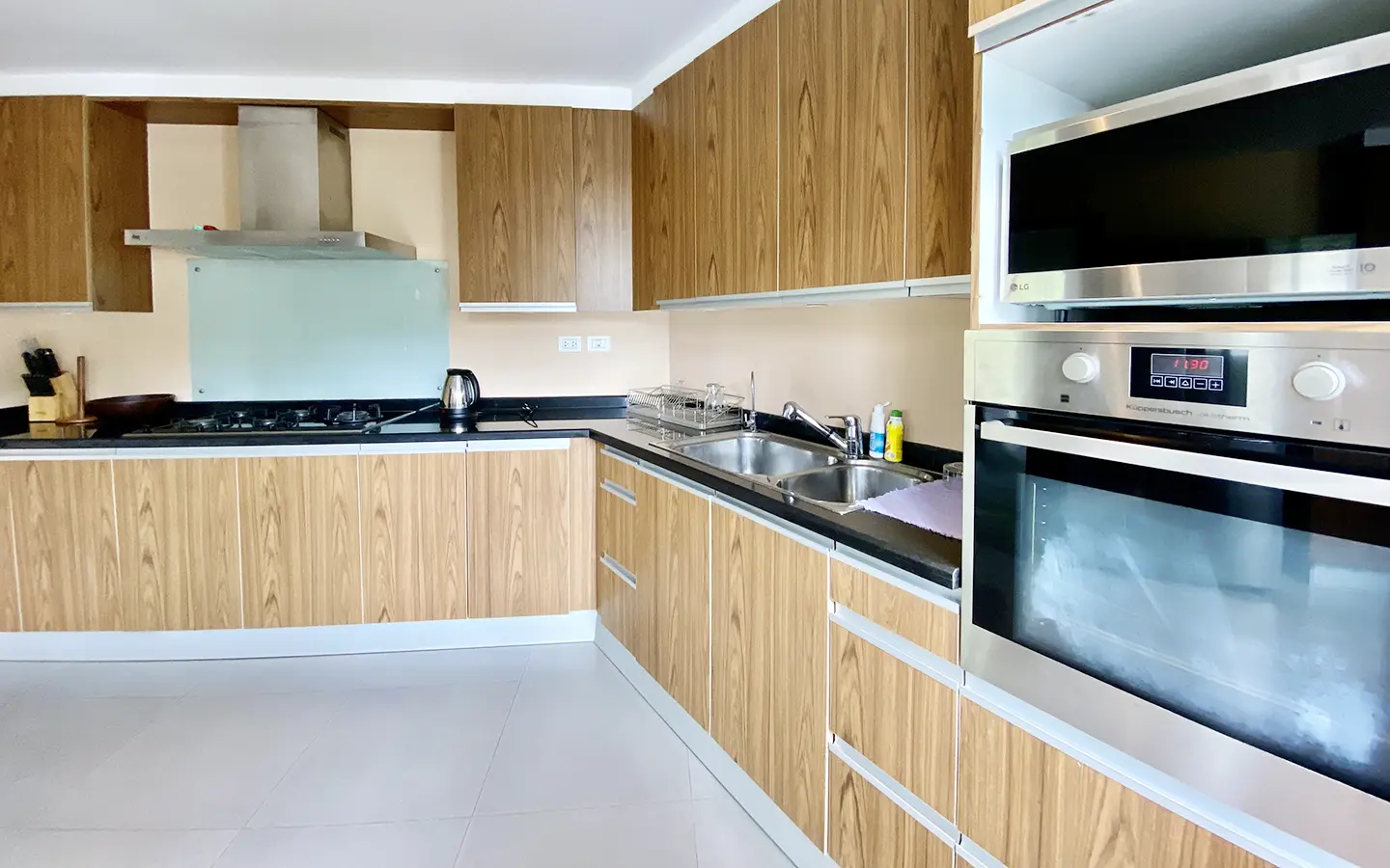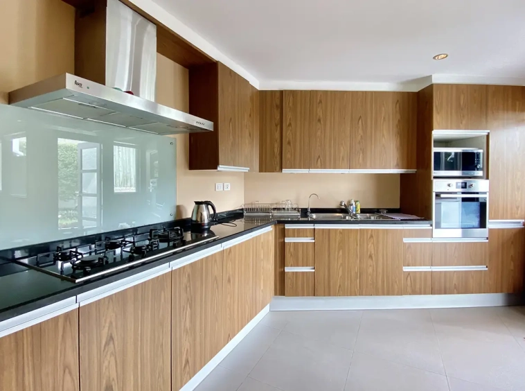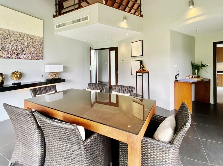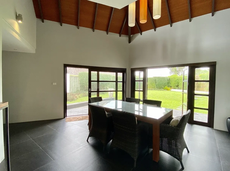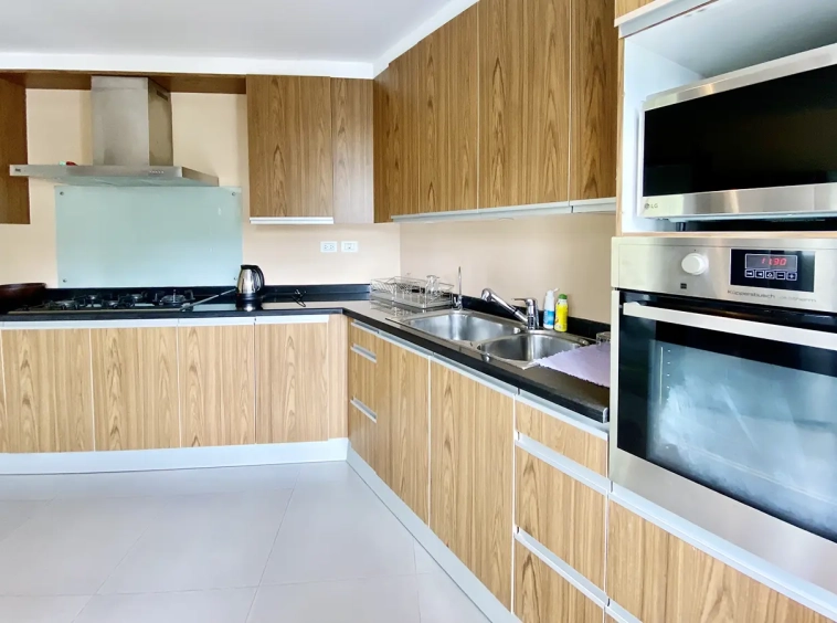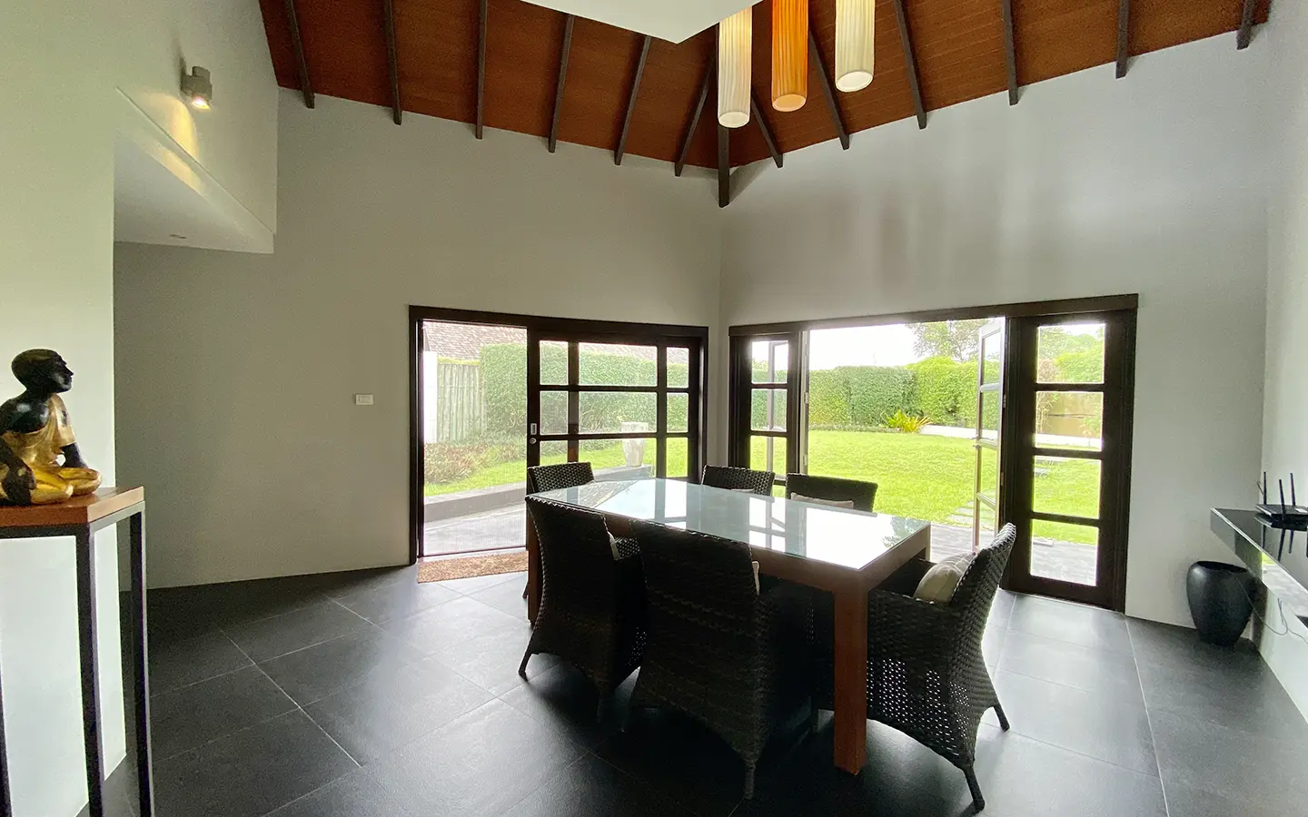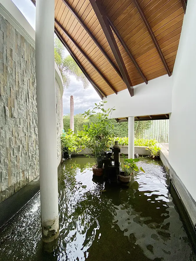 All fenced in with well-maintained hedges, the house sits away from the main gate and covered parking surrounded by beautiful lawn and flowery trees. At the main entrance, there is a koi pond and doors open to a foyer then some steps to the main living room where there is wall to ceiling windows giving panoramic views of the swimming pool and door access to a covered sitting deck area outside. Back to the foyer, there is a staircase leading to another loft-style sitting area, a shared guest bathroom and access to the balcony with a gorgeous mountain view. Back to the foyer again and going a few steps down, there is a dining room, storage room, and large separate fully fitted Western kitchen with built-in appliances completed with a washer and dryer. Just outside the kitchen at the rear is the maid's room.