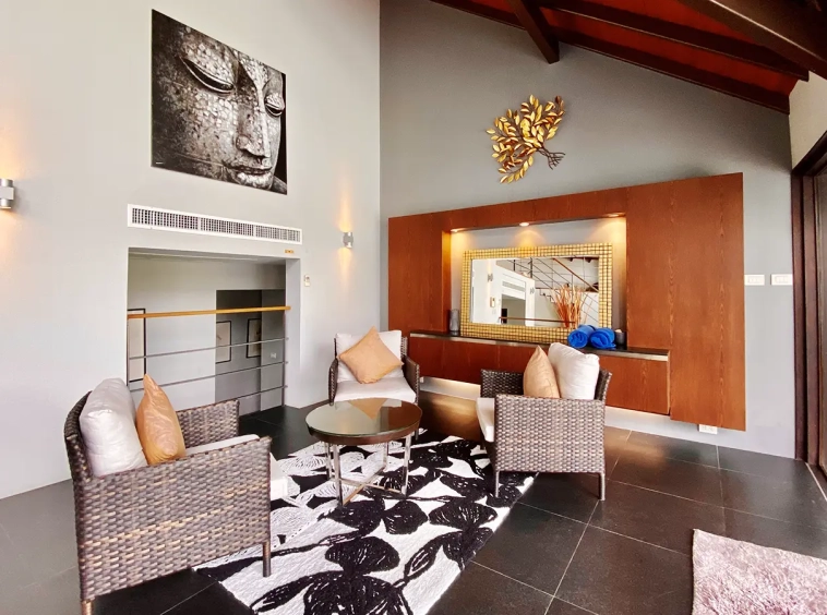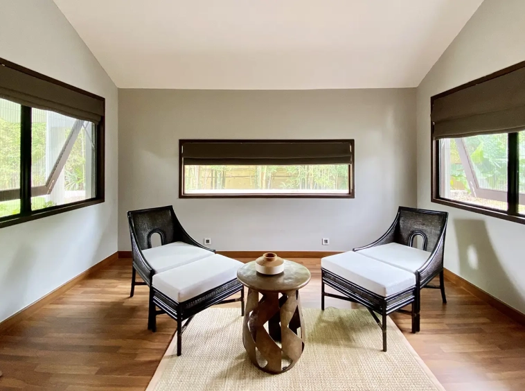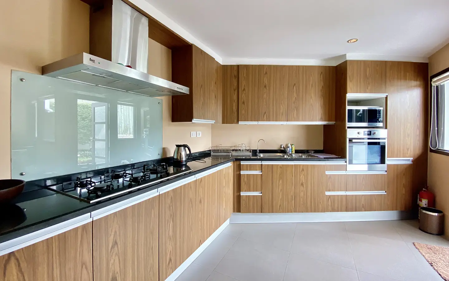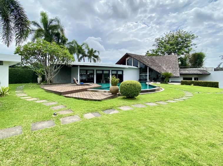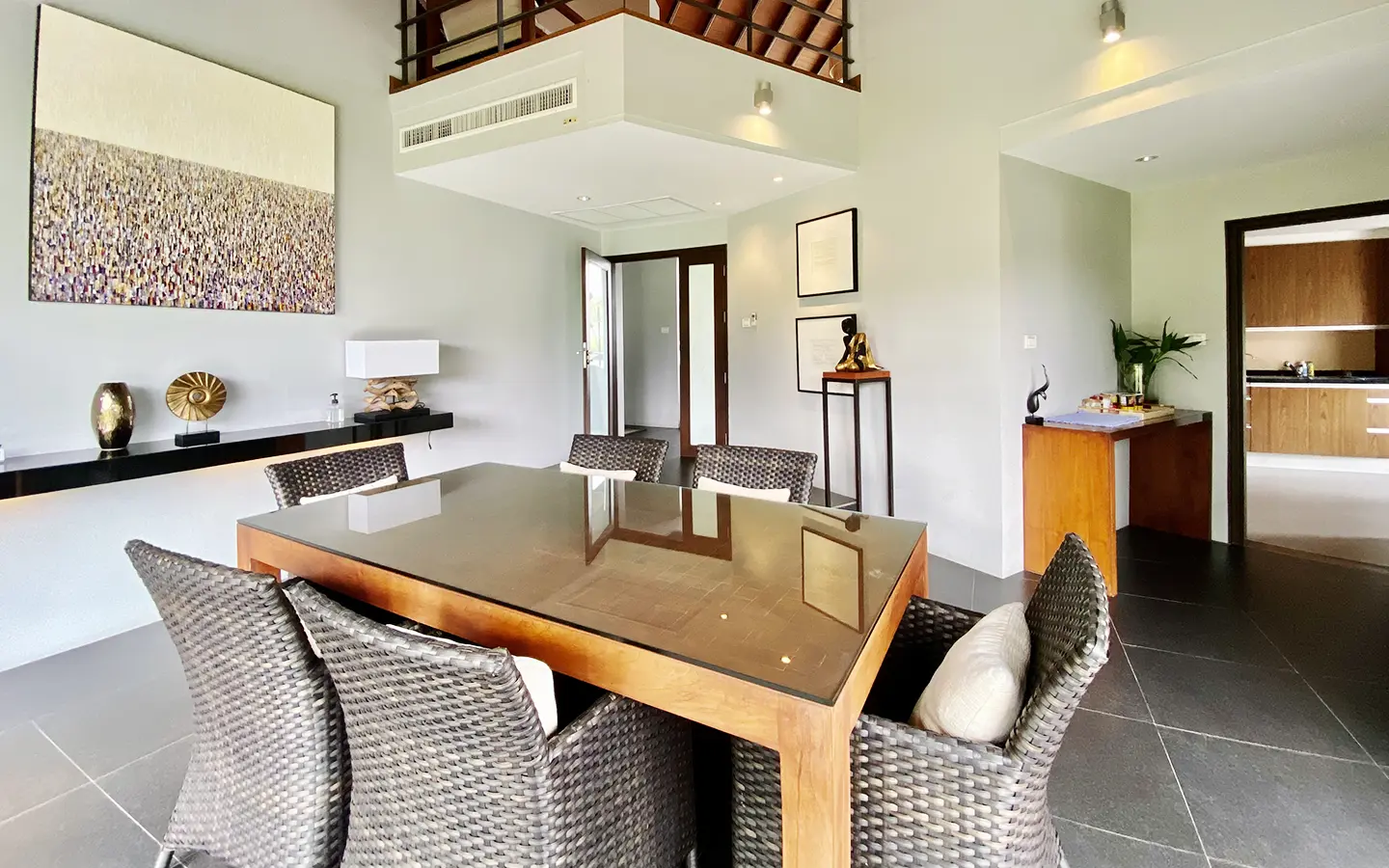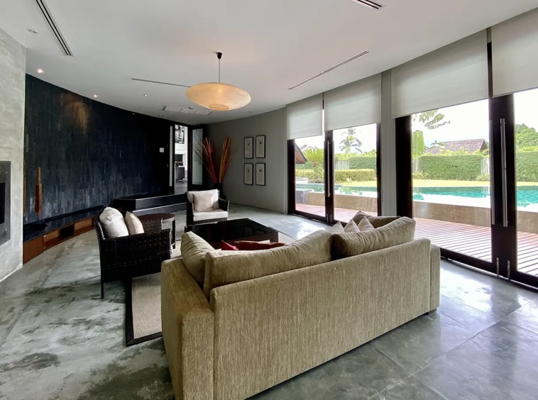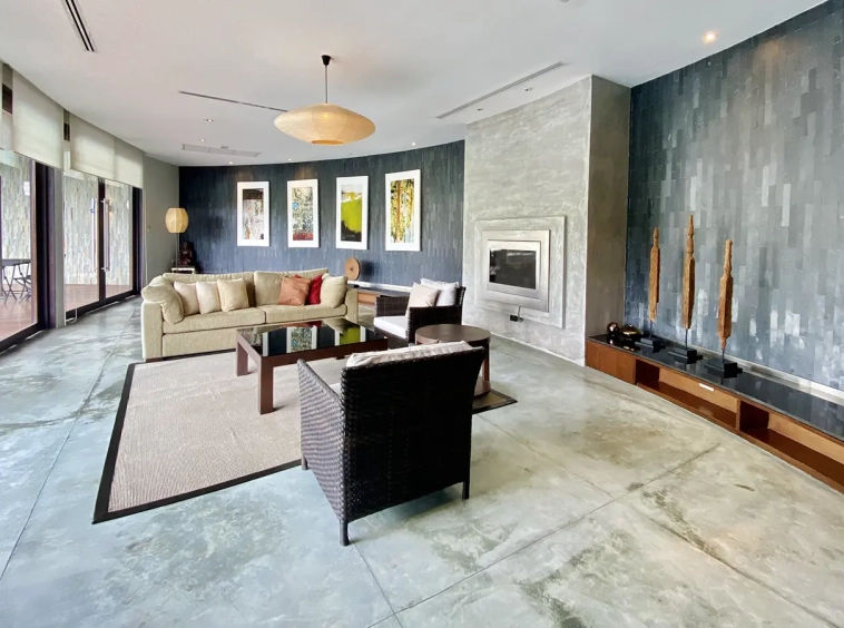 All fenced in with well-maintained hedges, the house sits away from the main gate and covered parking surrounded by beautiful lawn and flowery trees. At the main entrance, there is a koi pond and doors open to a foyer then some steps to the main living room where there is wall to ceiling windows giving panoramic views of the swimming pool and door access to a covered sitting deck area outside. Back to the foyer, there is a staircase leading to another loft-style sitting area, a shared guest bathroom and access to the balcony with a gorgeous mountain view. Back to the foyer again and going a few steps down, there is a dining room, storage room, and large separate fully fitted Western kitchen with built-in appliances completed with a washer and dryer. Just outside the kitchen at the rear is the maid's room.