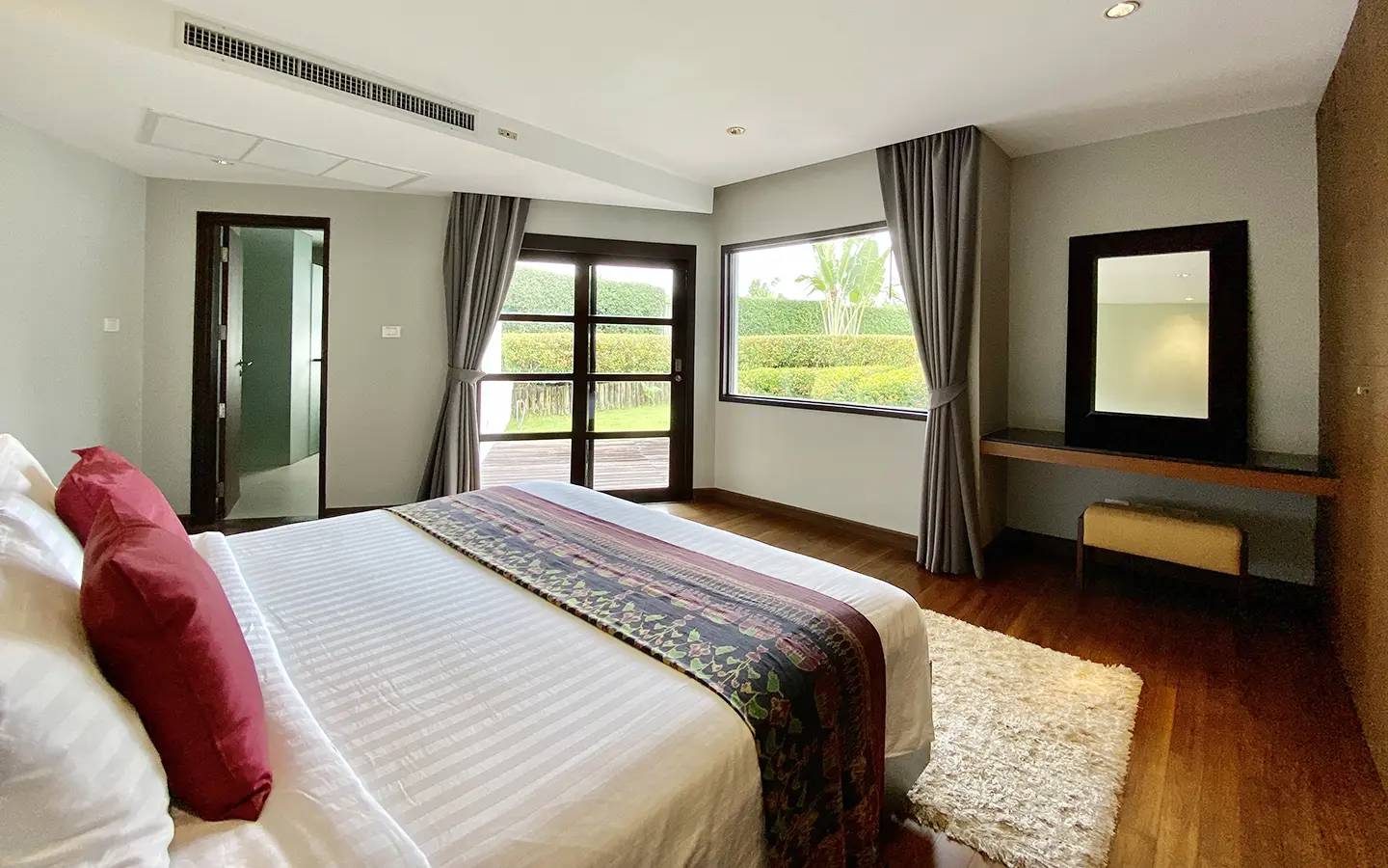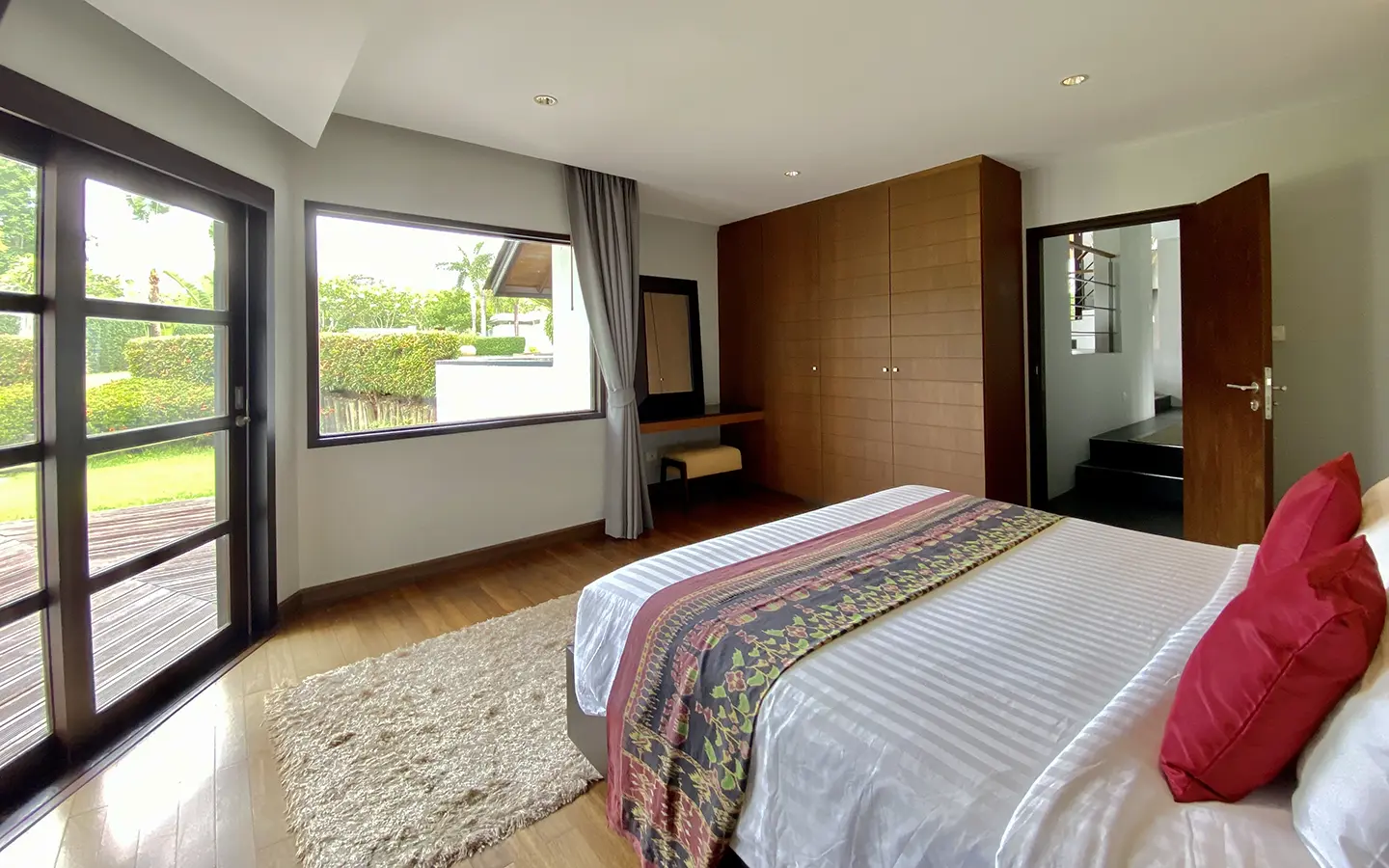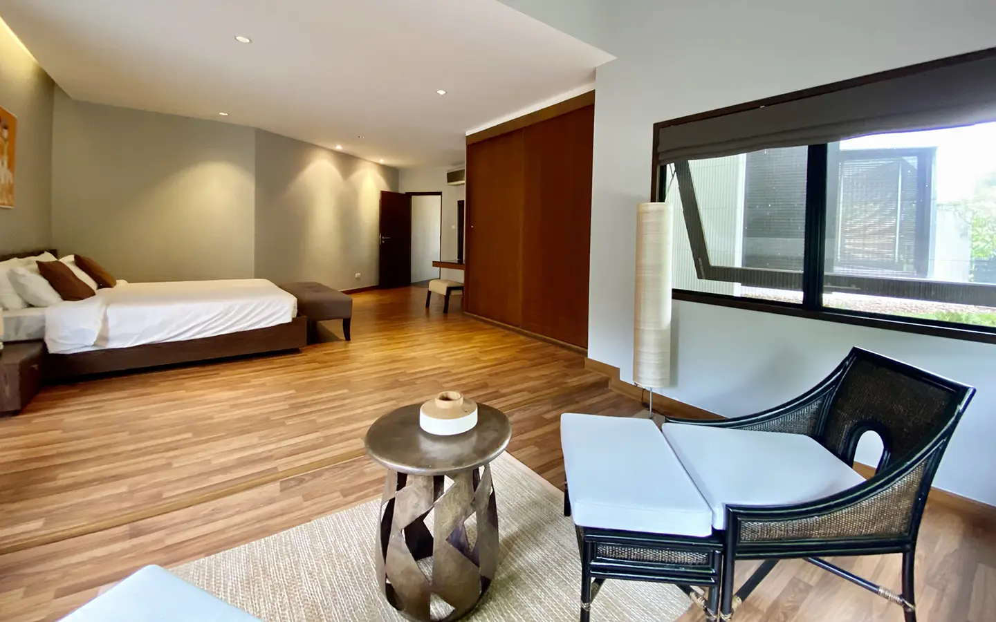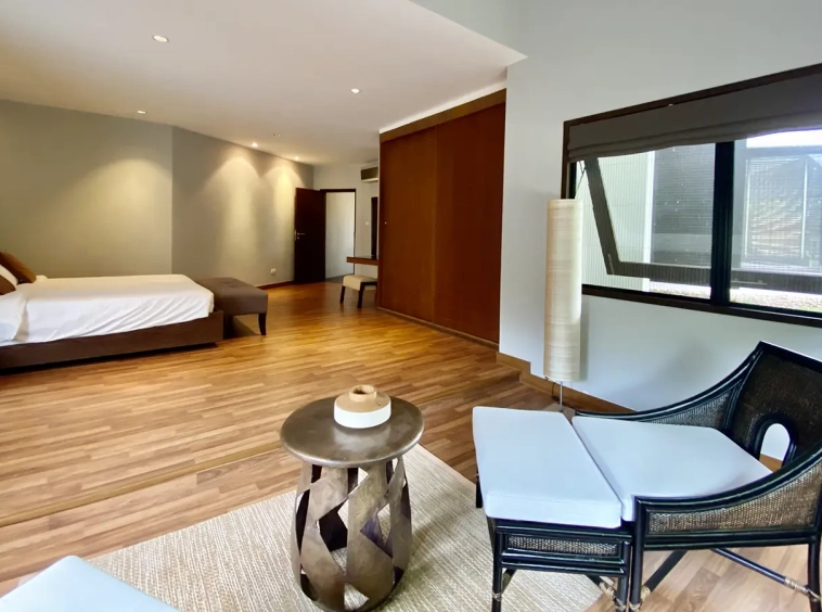 There are 3 bedrooms, all ensuite with the master bedroom having a sitting area and a jacuzzi and all with built-in wardrobes. One of the bedrooms also features an outdoor shower. All rooms are furnished with high-quality furniture and tastefully decorated. Very luxurious, very discreet. Best value for money at the moment.