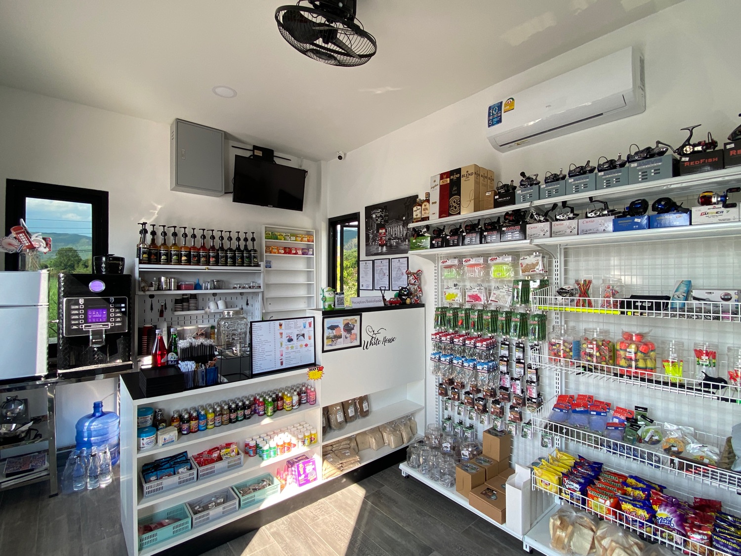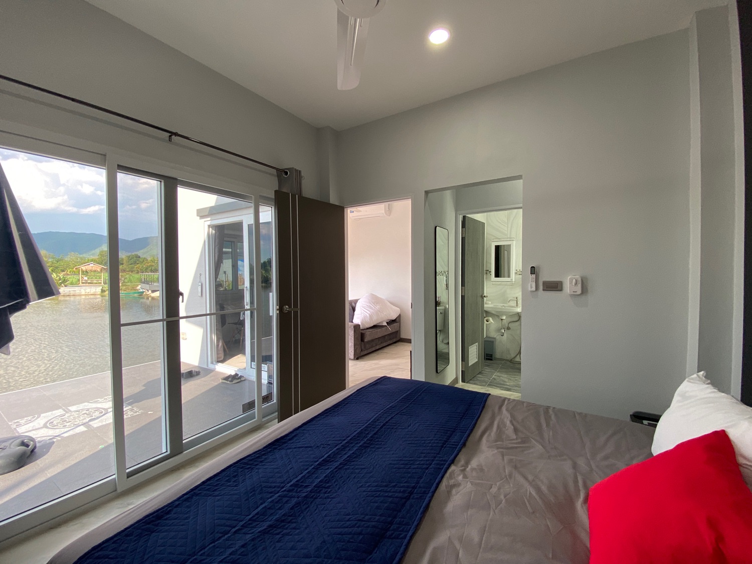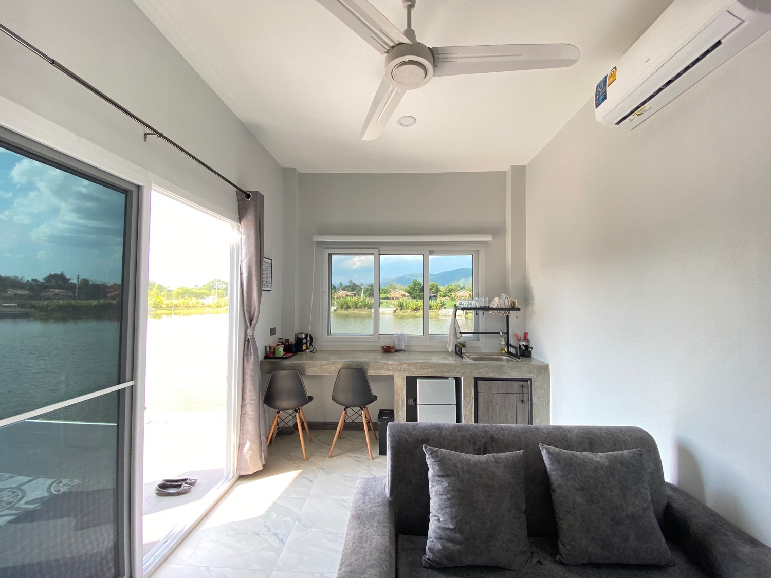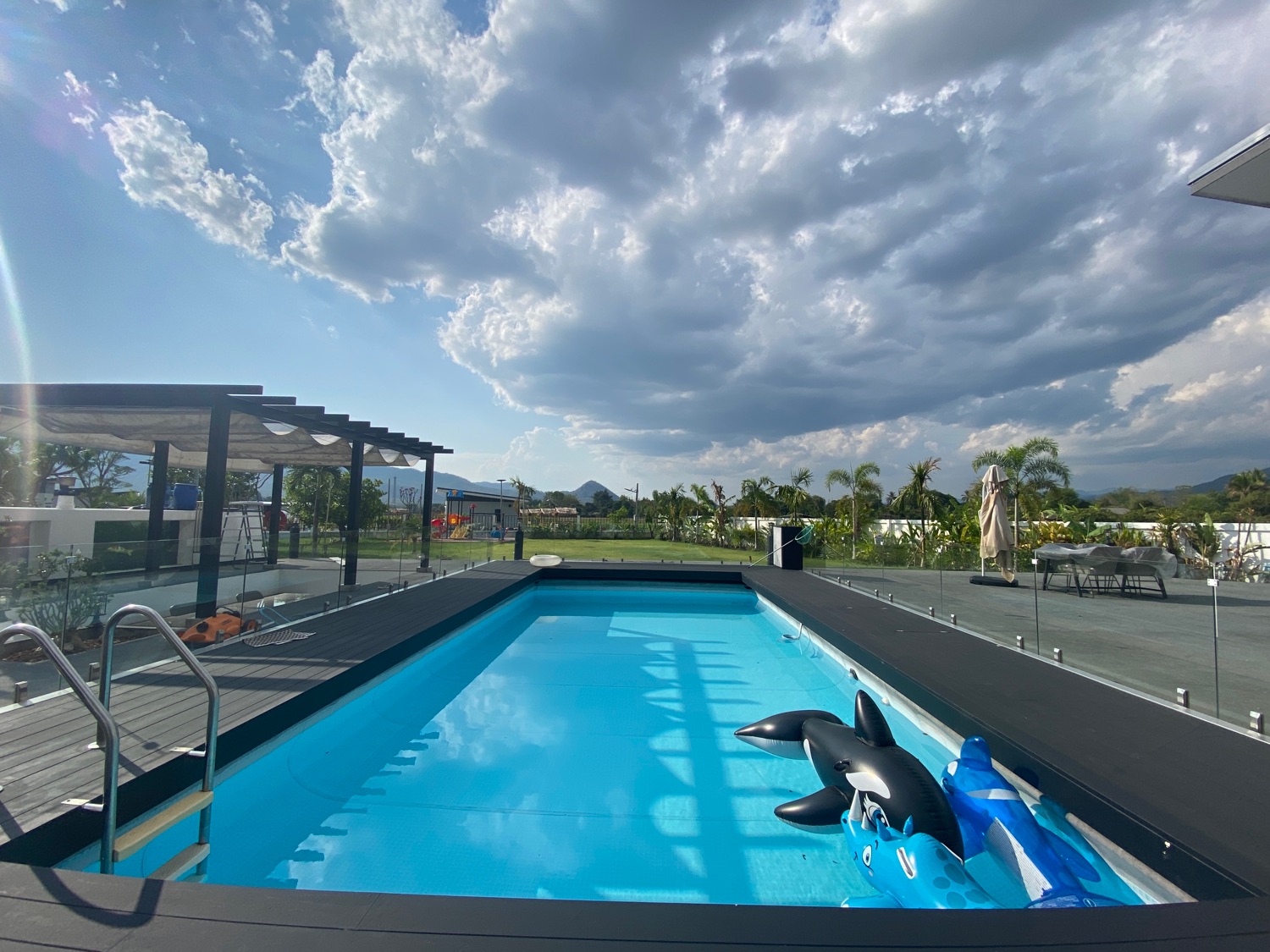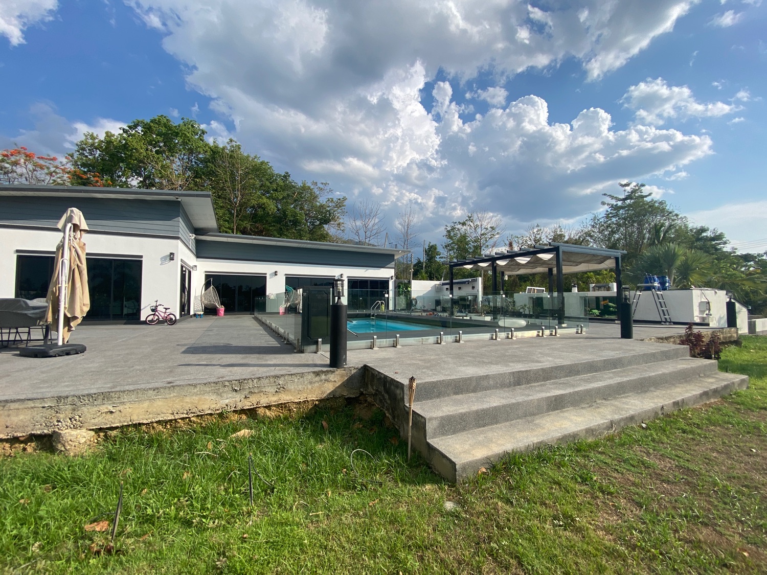 The property sits on over 5 rais of land with neatly paved roads, a playground and a large lake filled with fish. There is a main house with 4 bedrooms, 3 bathrooms, a private pool, a workshop and a large terrace with a big koi glass tank. There is also a separate one-bedroom guesthouse in a more private setting. Around the lake there are 3 bungalows, all have one bedroom and are fully equipped with a small pantry with a fridge, a TV, a living room and an ensuite bathroom. The bedroom has direct access to the terrace facing the lake and all have stunning views of the lake and mountains. There is also a small convenience store with a terrace on the property. There is solar power, well water as well as public water on the land. Really must be seen to appreciate the views and the ambience.