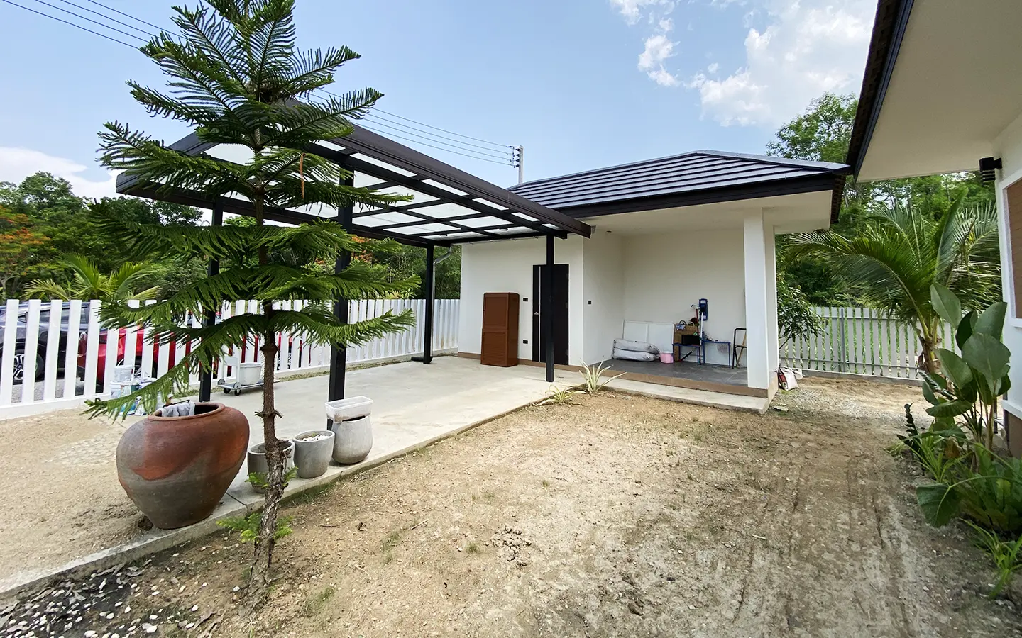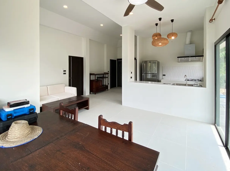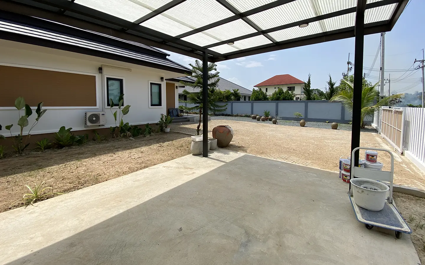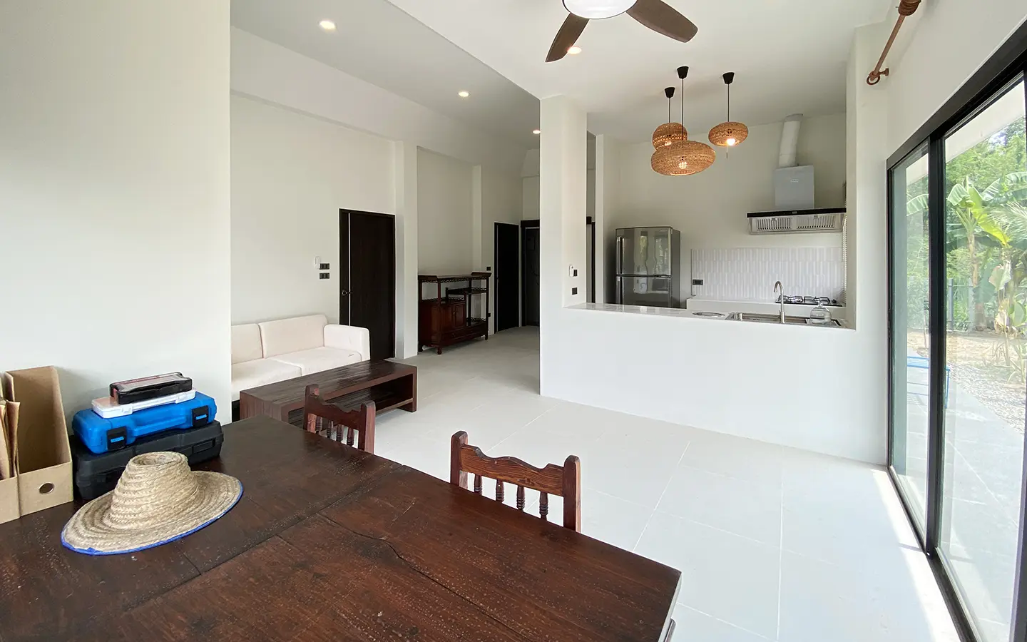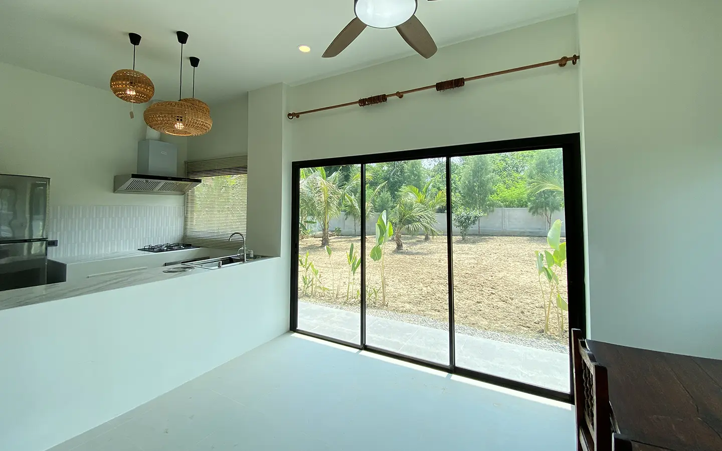 The property is on a cul de sac and has its own gate with a driveway that leads to the house. To the left is a covered carport with a storage room and multipurpose area. The house has a small fish pond with a fountain attached to the terrace. Inside, the living area has a tall ceiling, ceiling fan, and glass doors to the garden and the terrace. Open plan Western kitchen with stove, hood, fridge and breakfast counter bar. Adjacent to the kitchen is a pantry room with a washing machine.