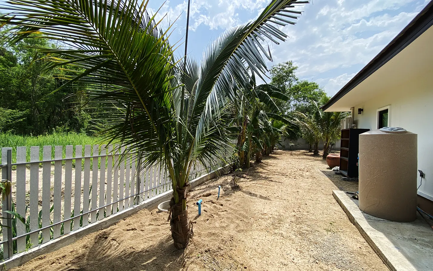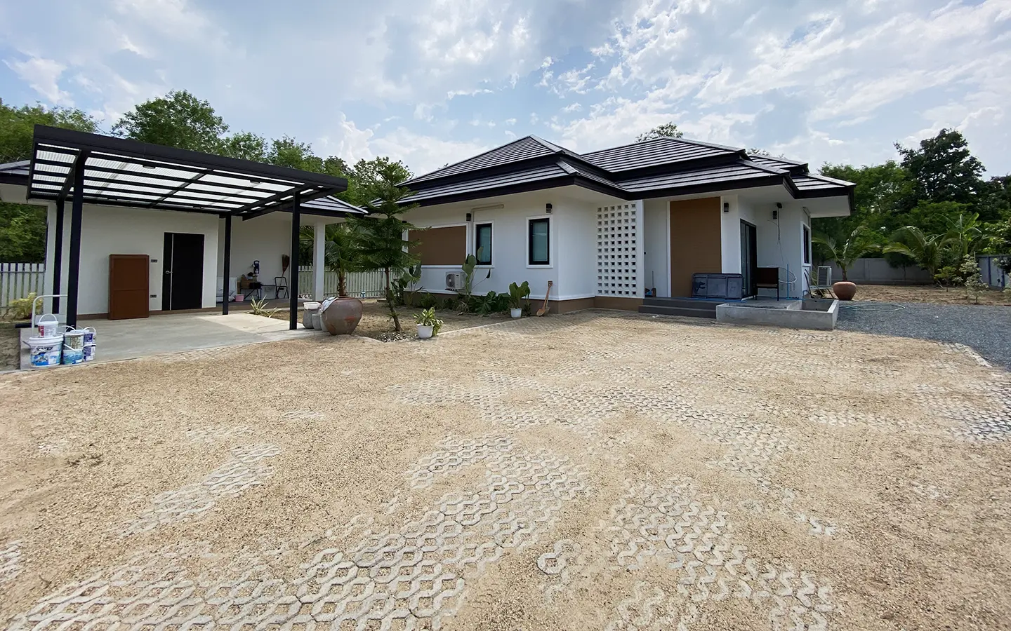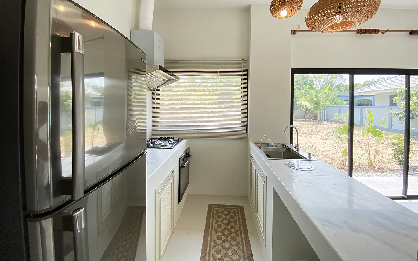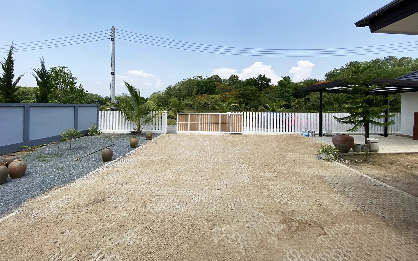 The property is on a cul de sac and has its own gate with a driveway that leads to the house. To the left is a covered carport with a storage room and multipurpose area. The house has a small fish pond with a fountain attached to the terrace. Inside, the living area has a tall ceiling, ceiling fan, and glass doors to the garden and the terrace. Open plan Western kitchen with stove, hood, fridge and breakfast counter bar. Adjacent to the kitchen is a pantry room with a washing machine.