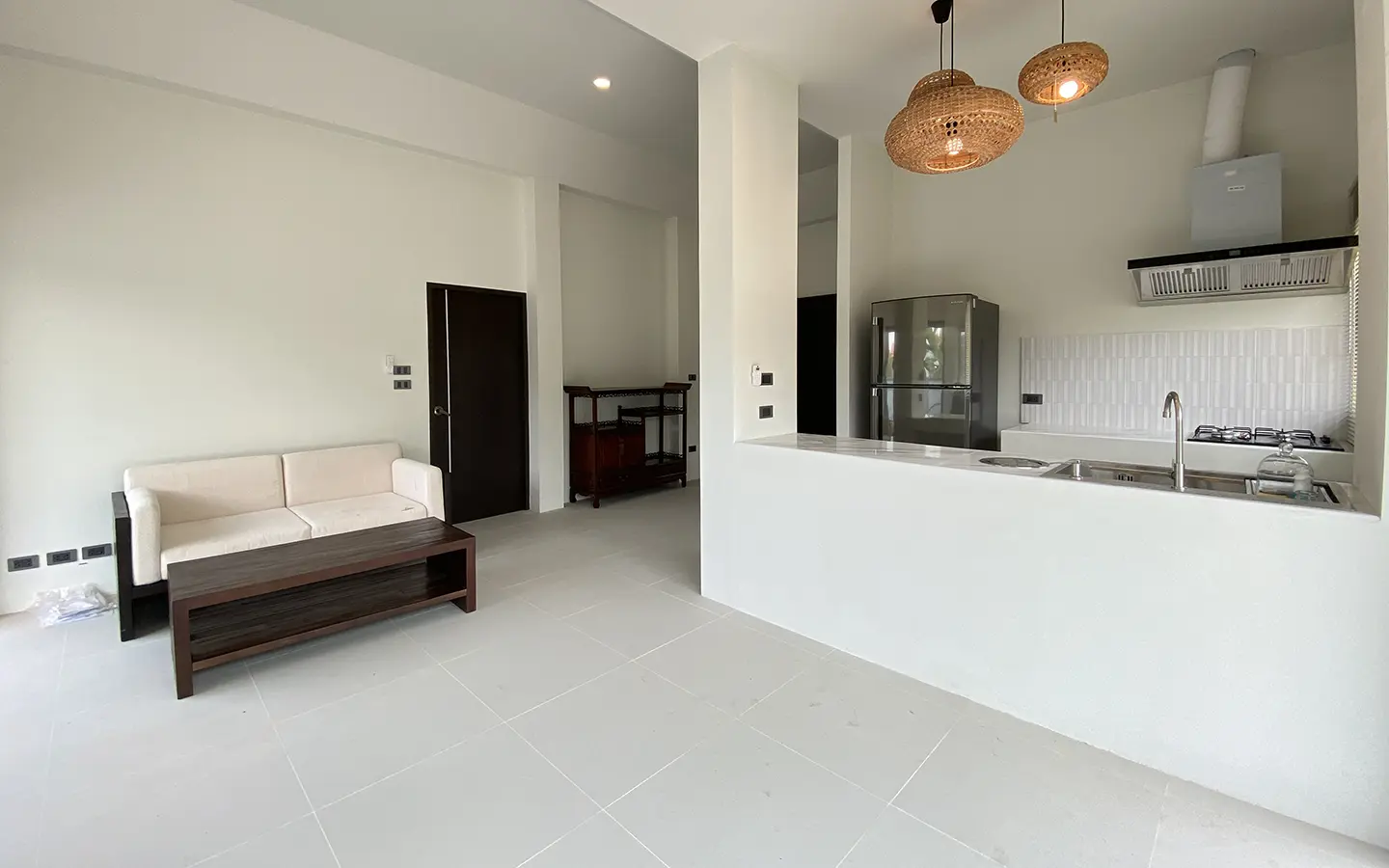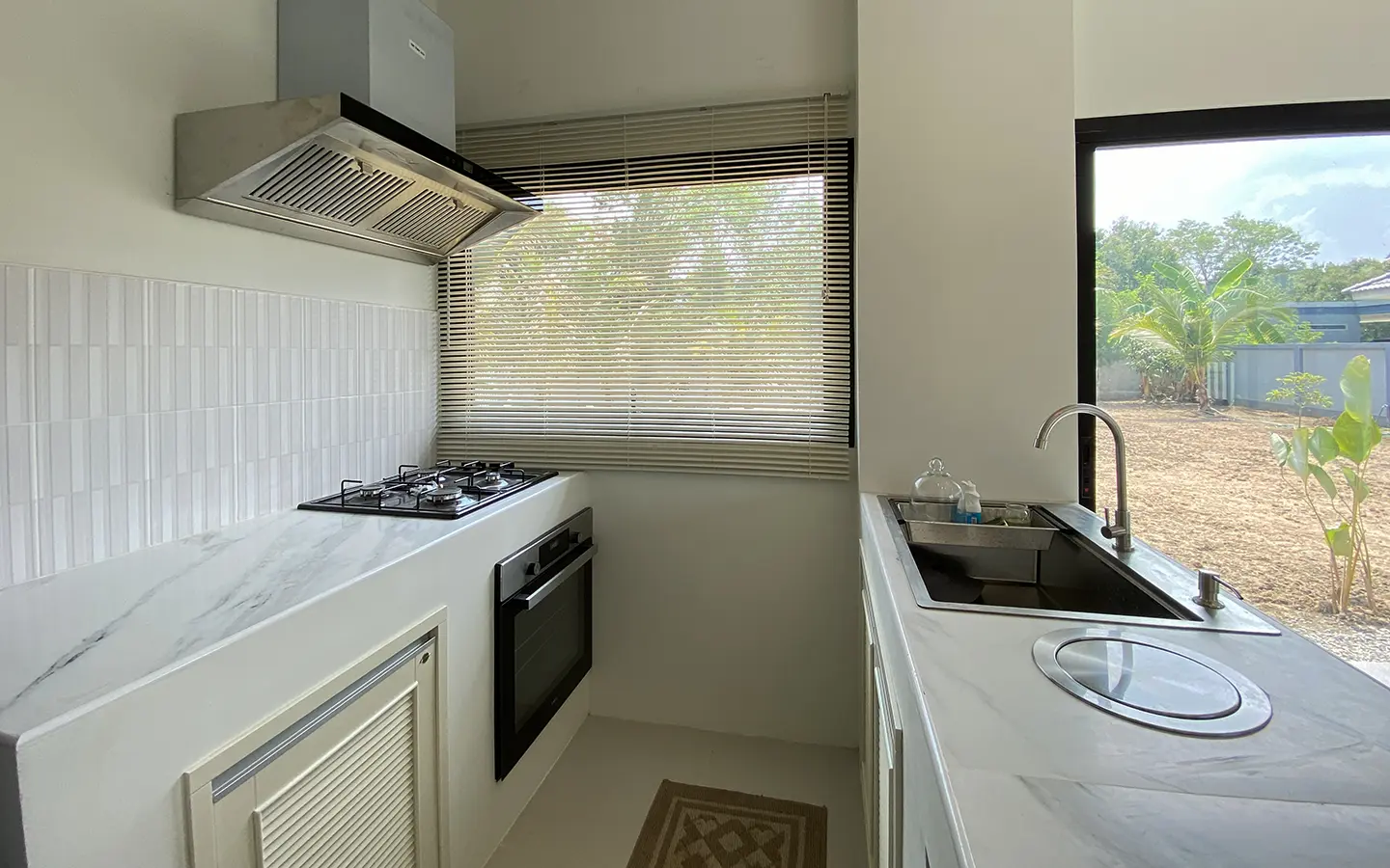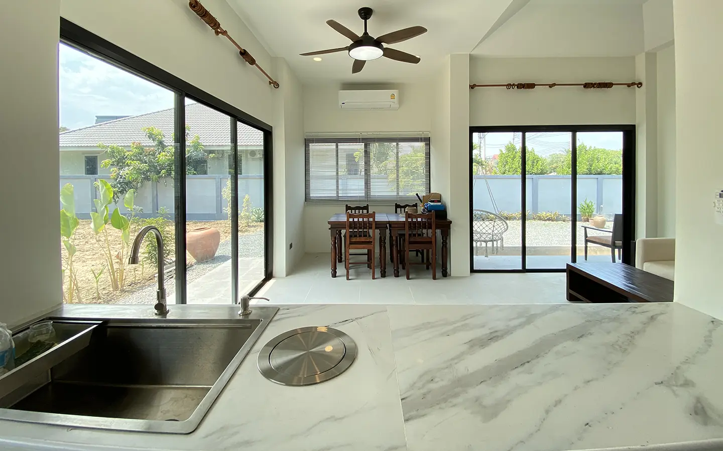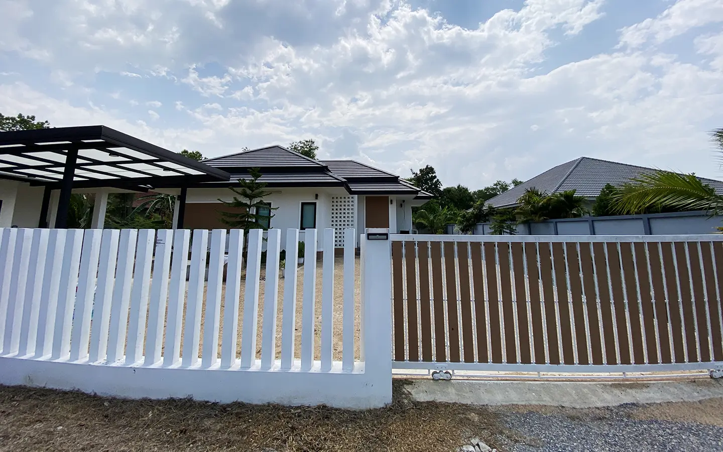 The property is on a cul de sac and has its own gate with a driveway that leads to the house. To the left is a covered carport with a storage room and multipurpose area. The house has a small fish pond with a fountain attached to the terrace. Inside, the living area has a tall ceiling, ceiling fan, and glass doors to the garden and the terrace. Open plan Western kitchen with stove, hood, fridge and breakfast counter bar. Adjacent to the kitchen is a pantry room with a washing machine.