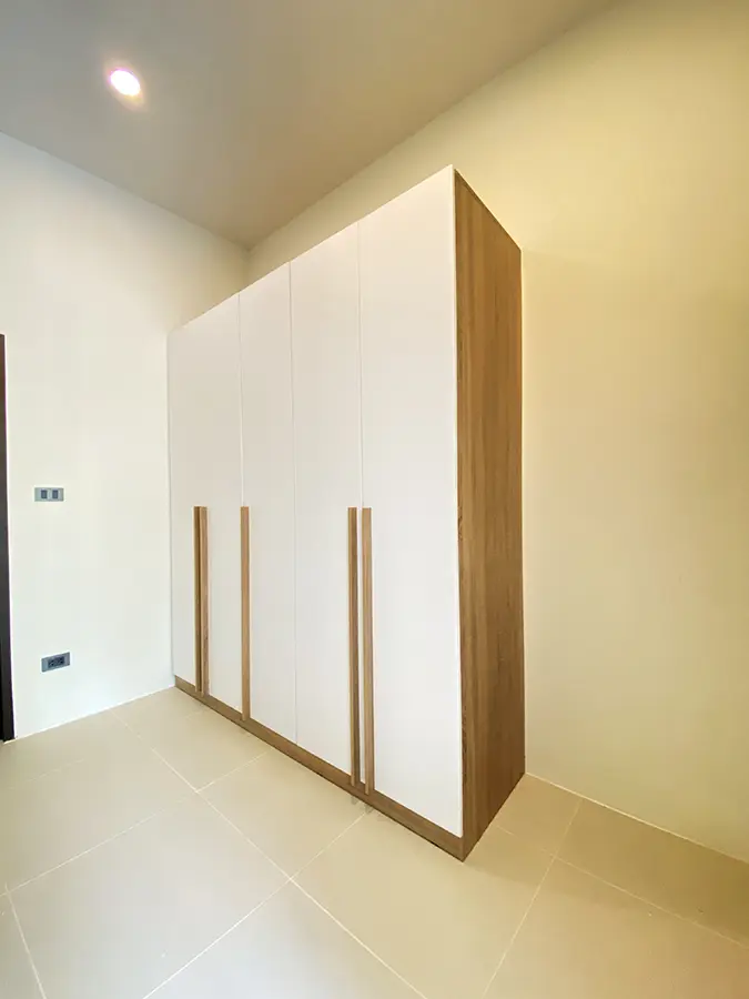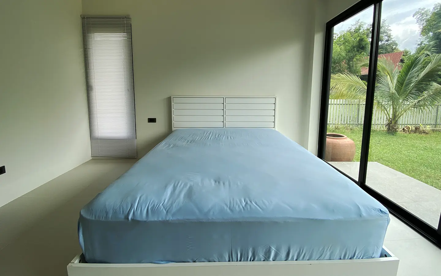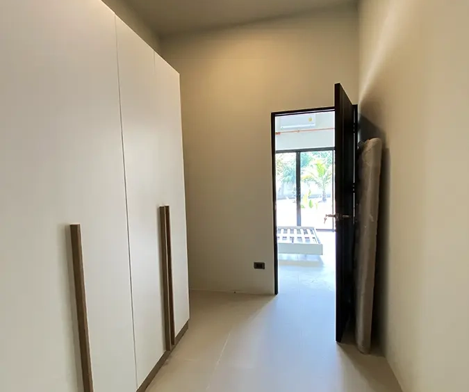The second bedroom is currently a study and the guest bathroom comes with a shower. The master bedroom has a queen size bed, a glass door access to the garden, a walk-through dressing room with a closet and an ensuite with a shower.