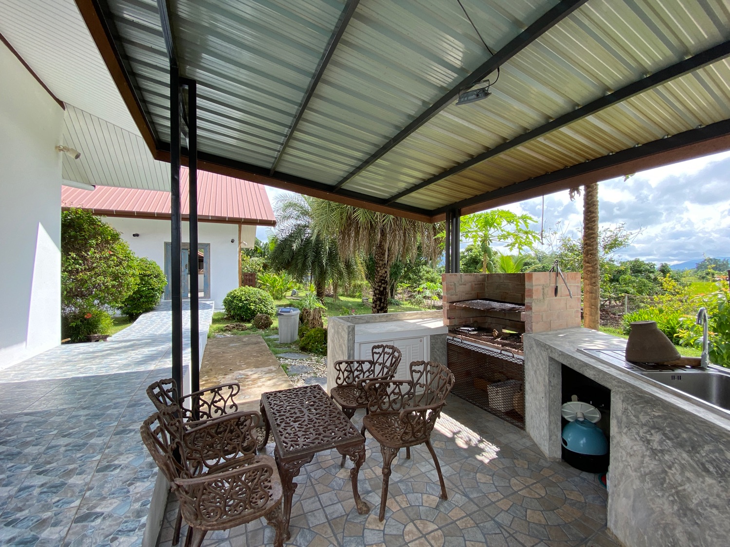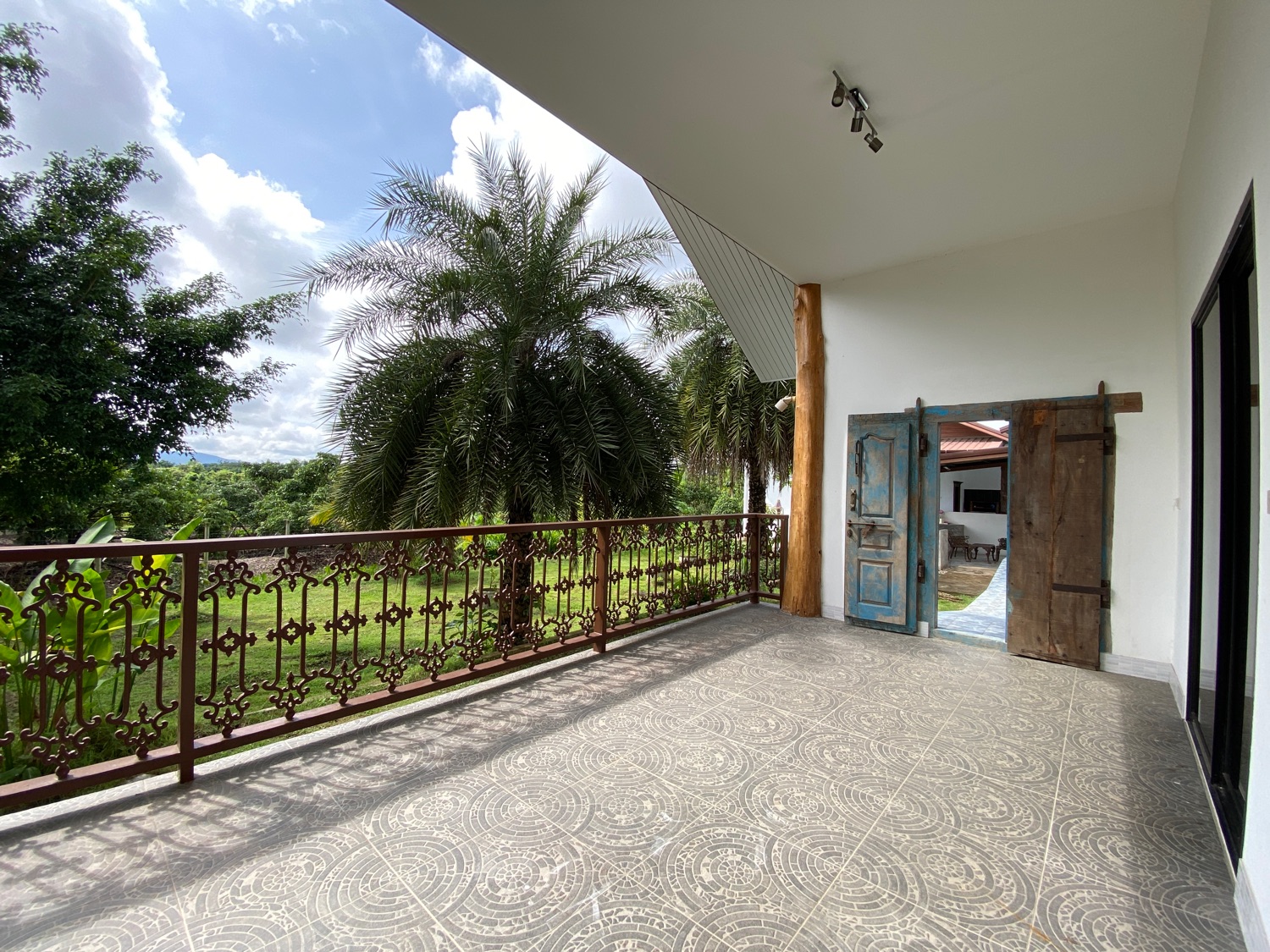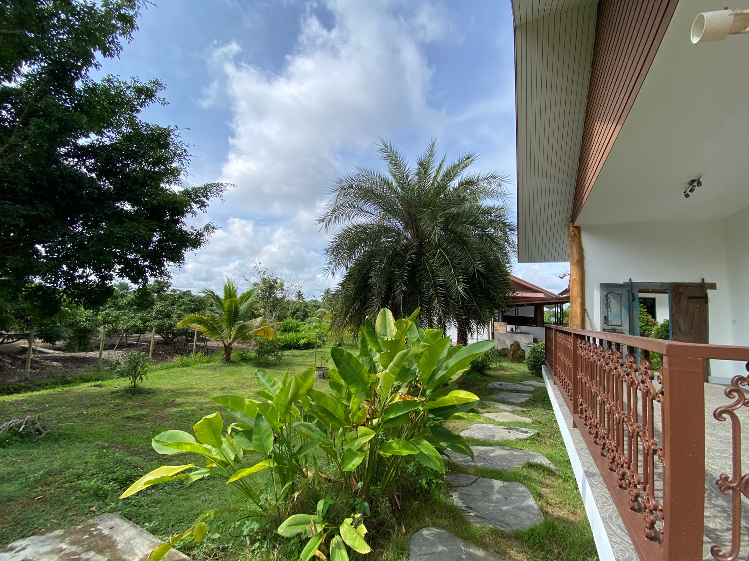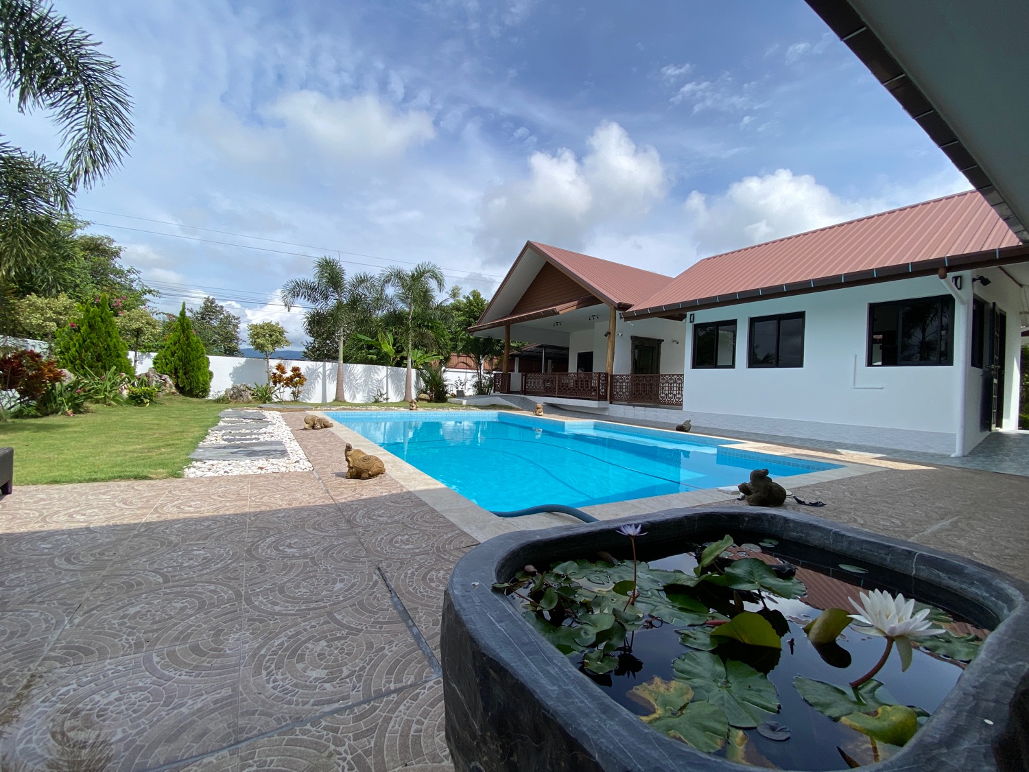 The over 5 rais property has road access and is situated in the countryside surrounded by orchards and rice paddy. The covered parking is by the entrance, then walking through the orchard towards the house there is a fish and lotus pond and then wheelchair access to the first building. The first bedroom is ensuite and has a sitting area and a spacious terrace. Next is a building containing a fitted Western kitchen with a built-in oven, breakfast bar and BBQ area by the pool. Then another building with a second bedroom which is also ensuite and comes with a terrace to sit and enjoy the mountain, pool and rice paddy views. The last building contains an ensuite third bedroom, a guest bathroom, a study, and a storage room which easily can be turned into a fourth bedroom.