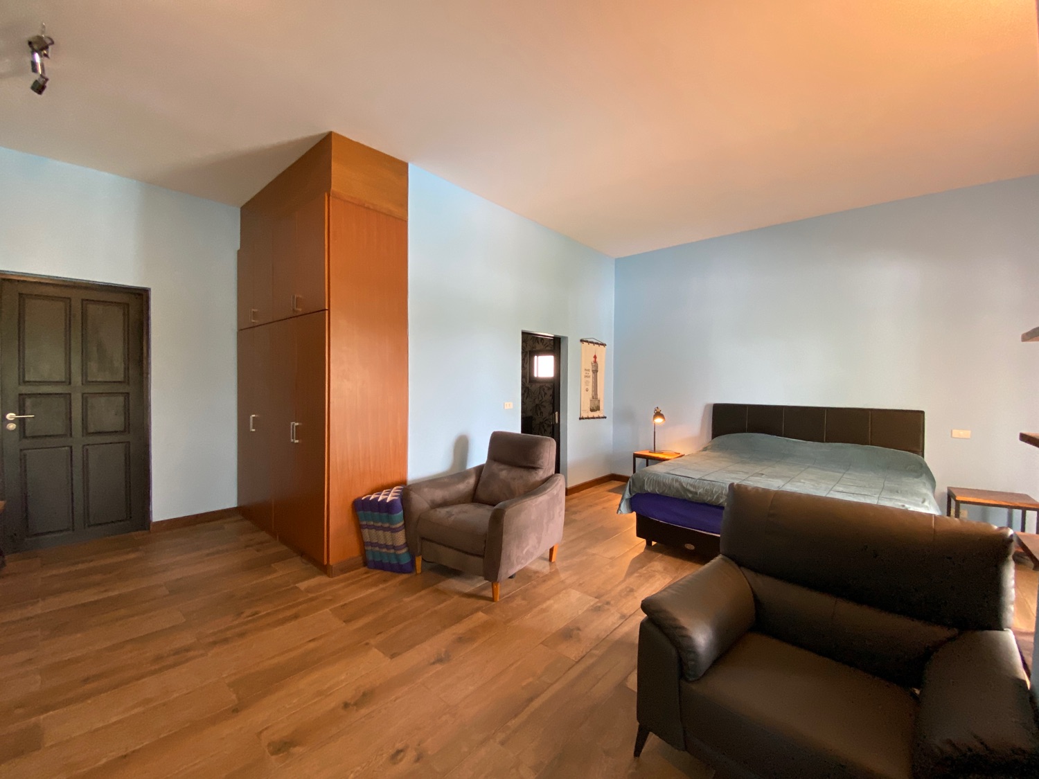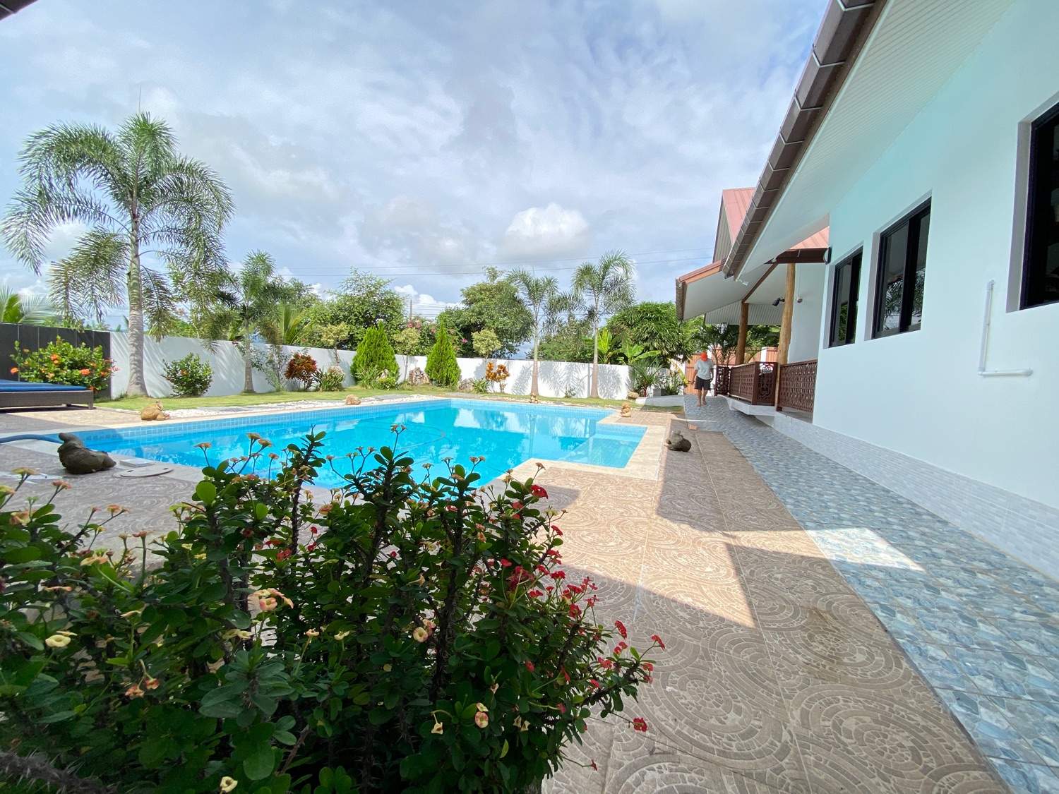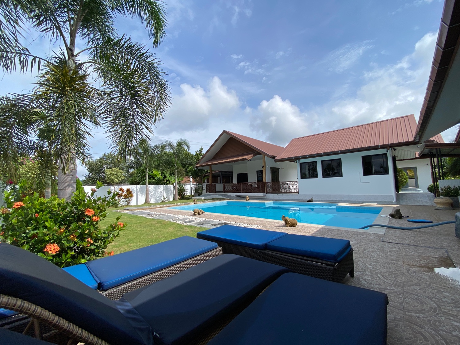 The over 5 rais property has road access and is situated in the countryside surrounded by orchards and rice paddy. The covered parking is by the entrance, then walking through the orchard towards the house there is a fish and lotus pond and then wheelchair access to the first building. The first bedroom is ensuite and has a sitting area and a spacious terrace. Next is a building containing a fitted Western kitchen with a built-in oven, breakfast bar and BBQ area by the pool. Then another building with a second bedroom which is also ensuite and comes with a terrace to sit and enjoy the mountain, pool and rice paddy views. The last building contains an ensuite third bedroom, a guest bathroom, a study, and a storage room which easily can be turned into a fourth bedroom.