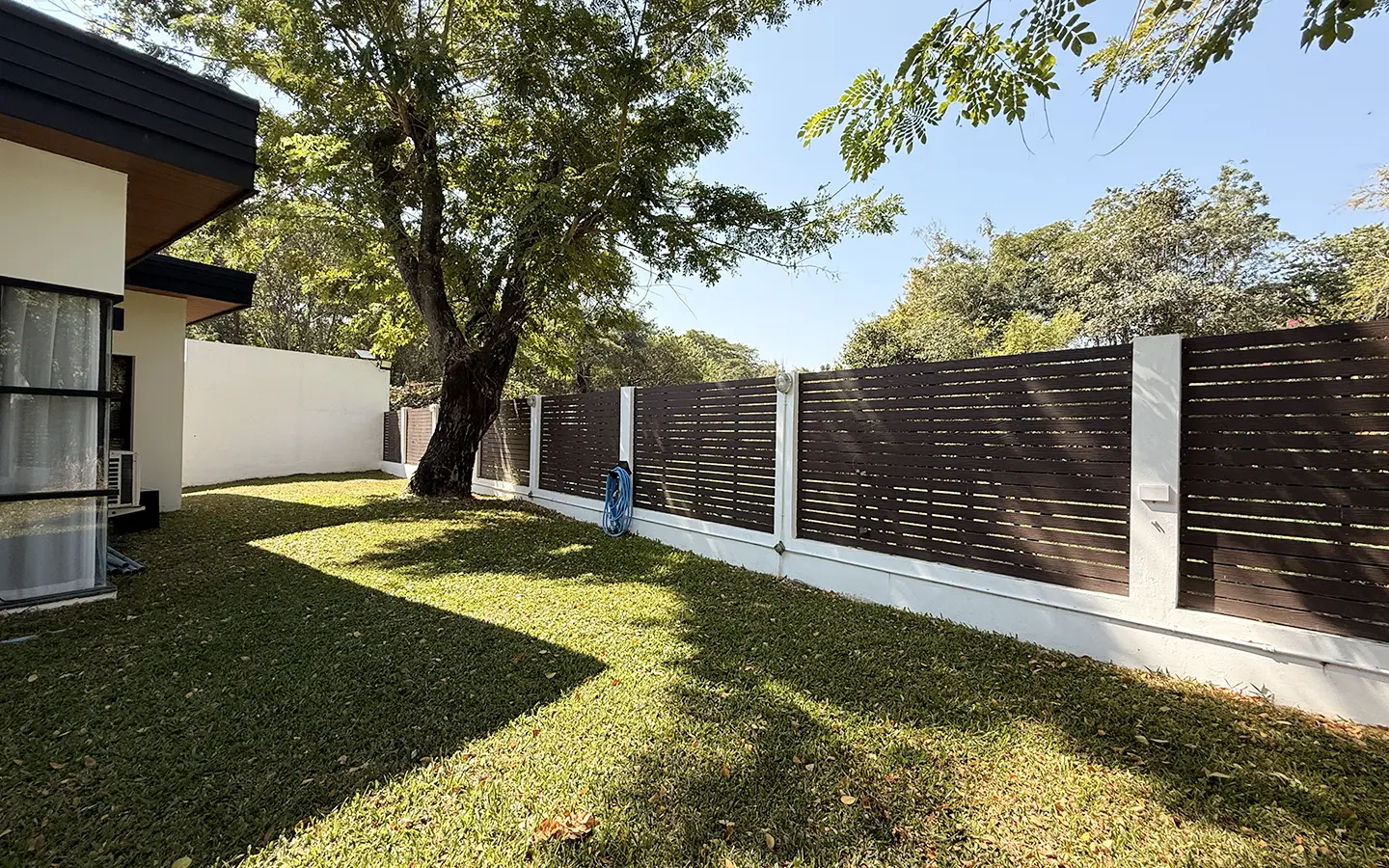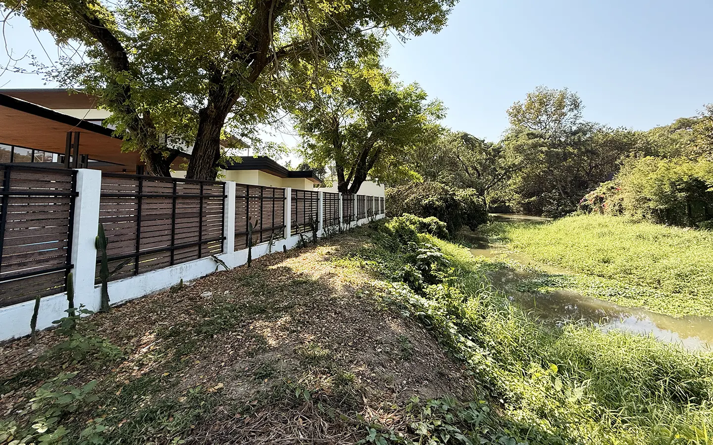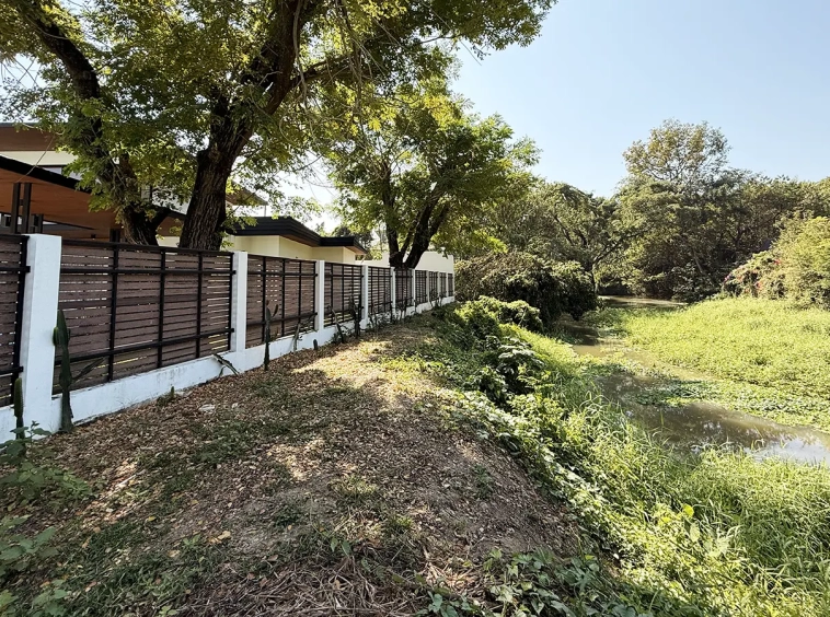 The garden area is easy to maintain. The swimming pool measures 5 x 11 meters. A natural canal runs alongside the property, enhancing the peaceful and natural surroundings. The house also offers parking space for two cars and an outdoor area suitable for dining or entertaining guests.
