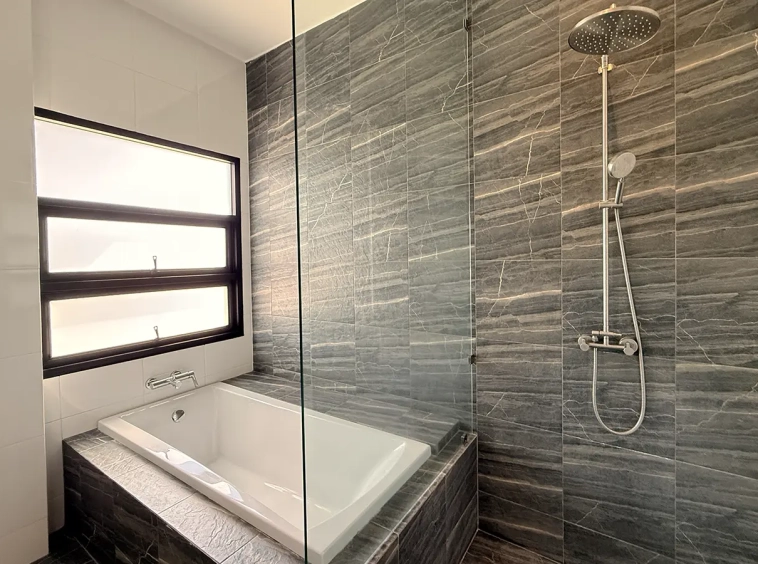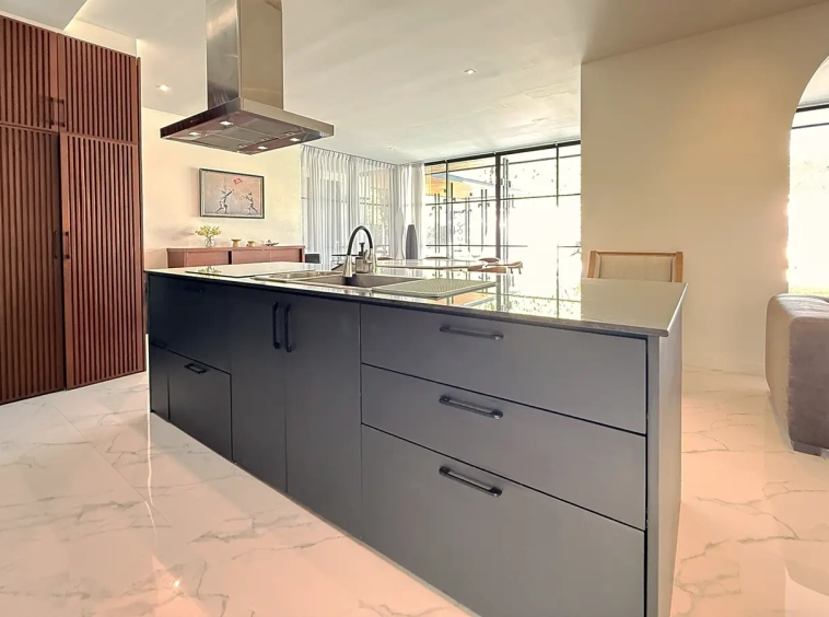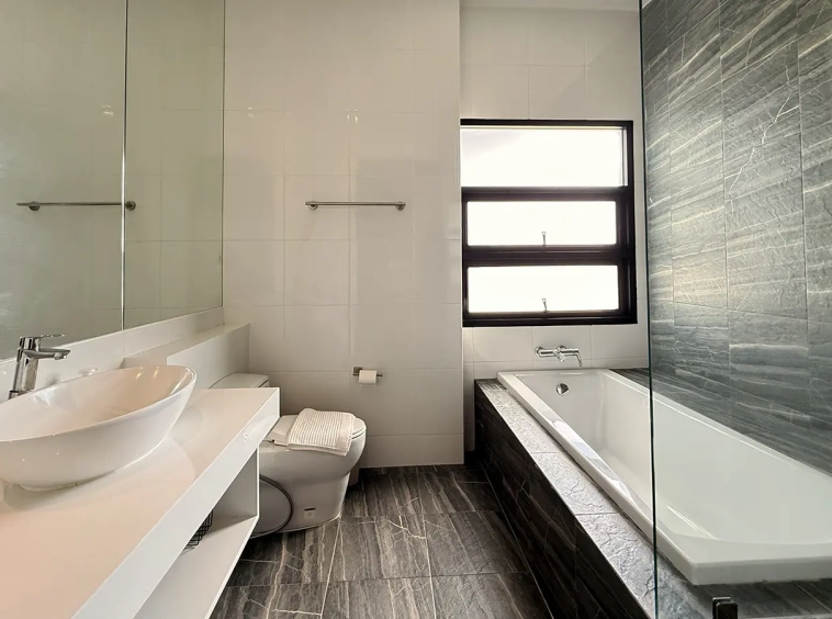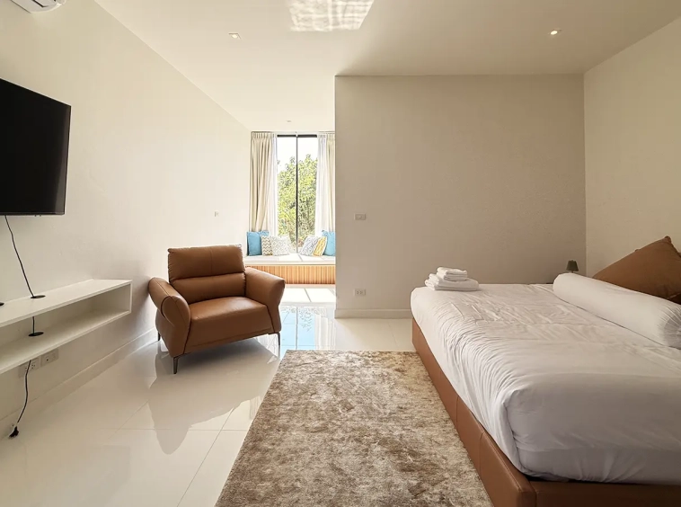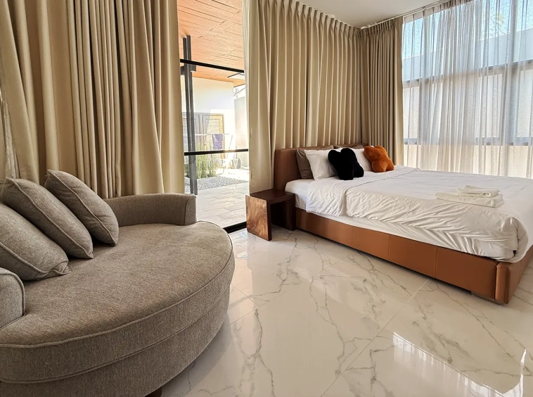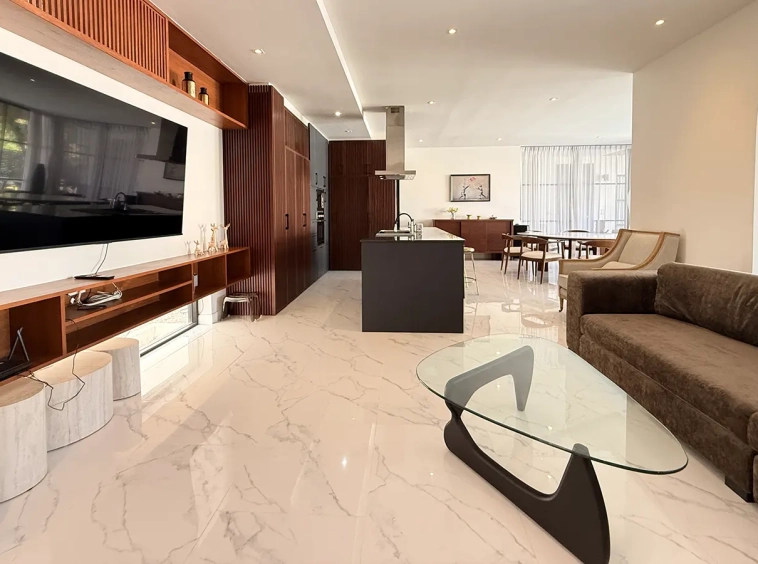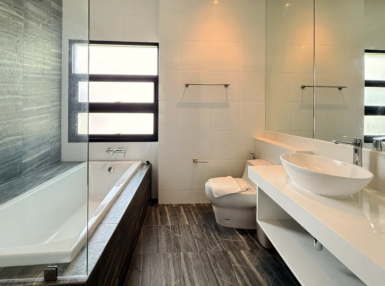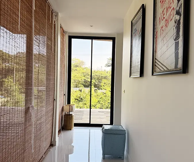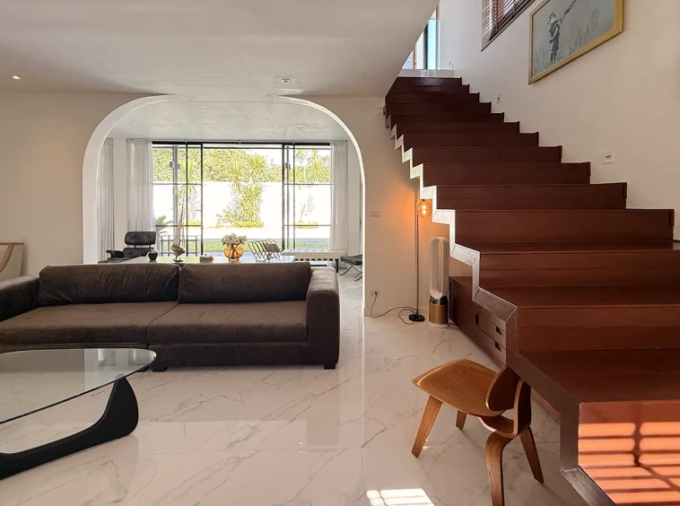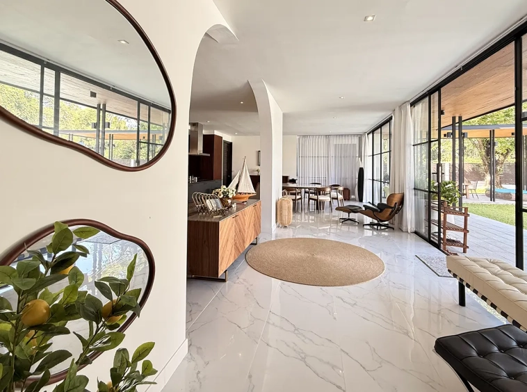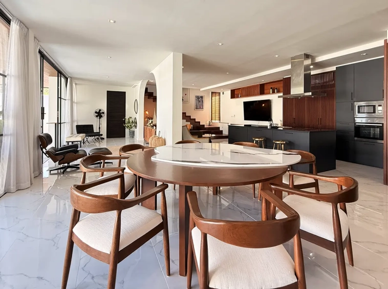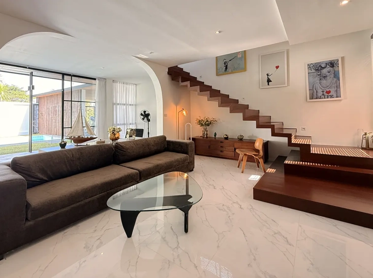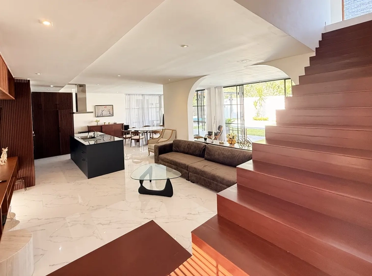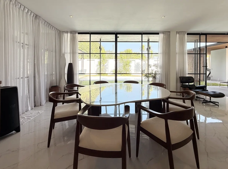 The house is designed with high ceilings and extensive use of glass walls to maximize natural light and provide views of the surrounding greenery. This design helps keep the house cool and comfortable. All furniture is of high quality with stylish and modern design.