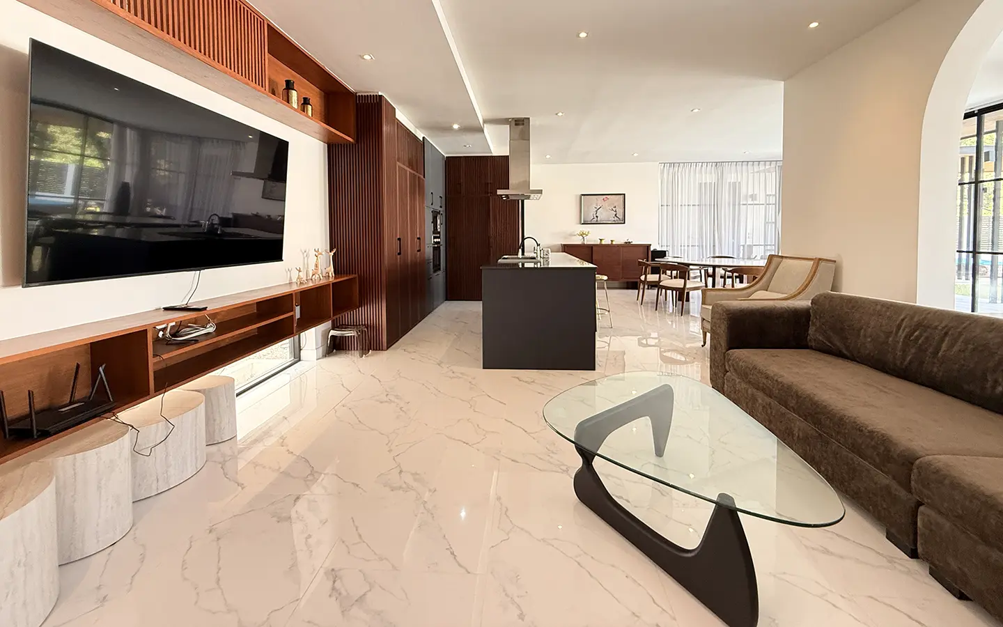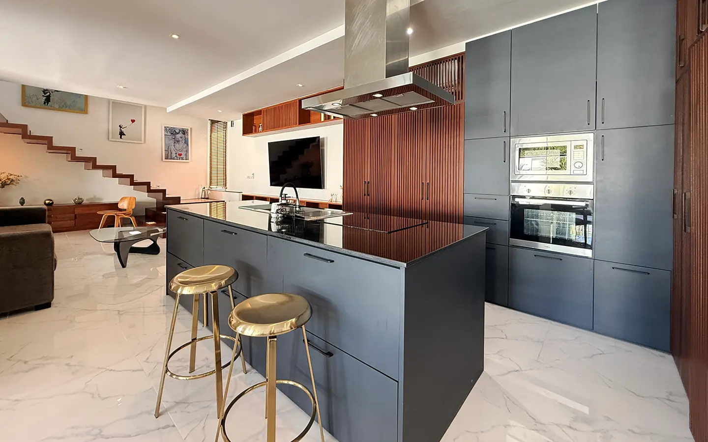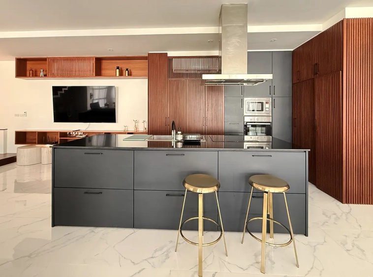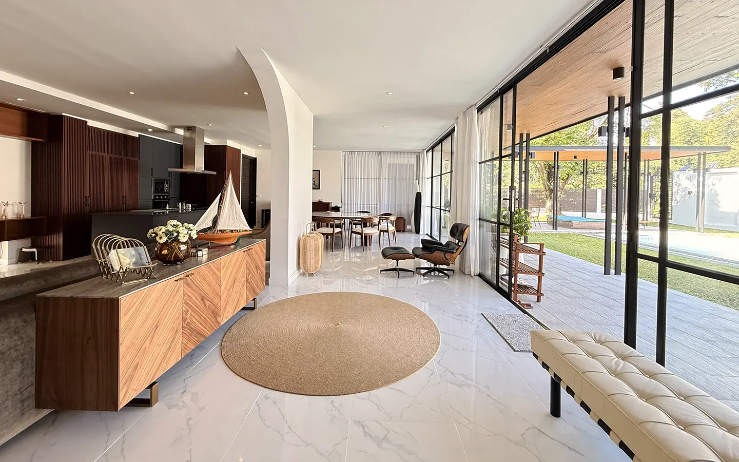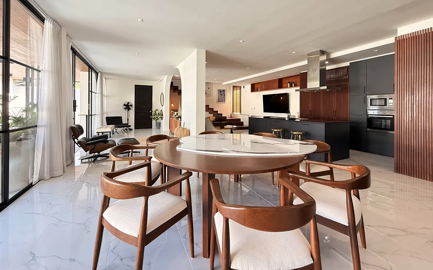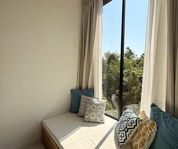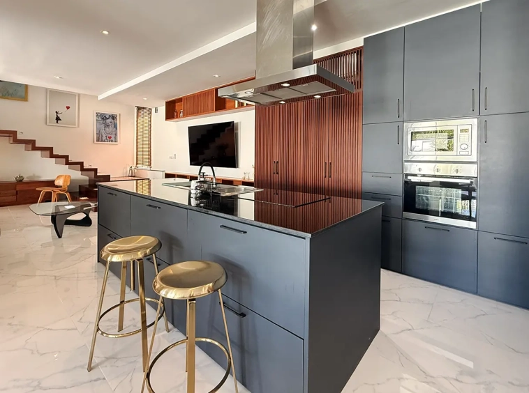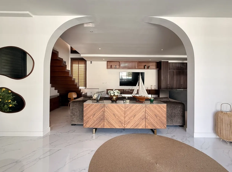 The house is designed with high ceilings and extensive use of glass walls to maximize natural light and provide views of the surrounding greenery. This design helps keep the house cool and comfortable. All furniture is of high quality with stylish and modern design.