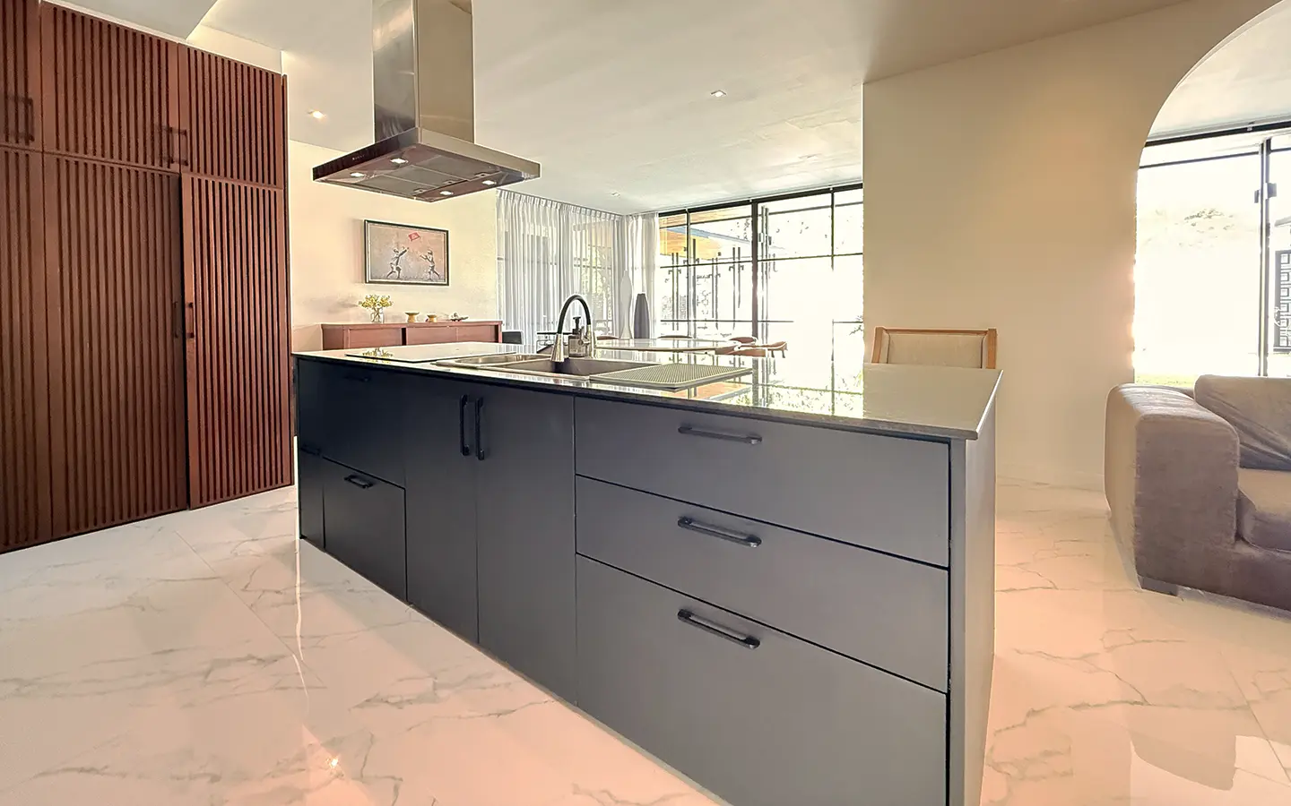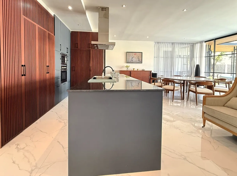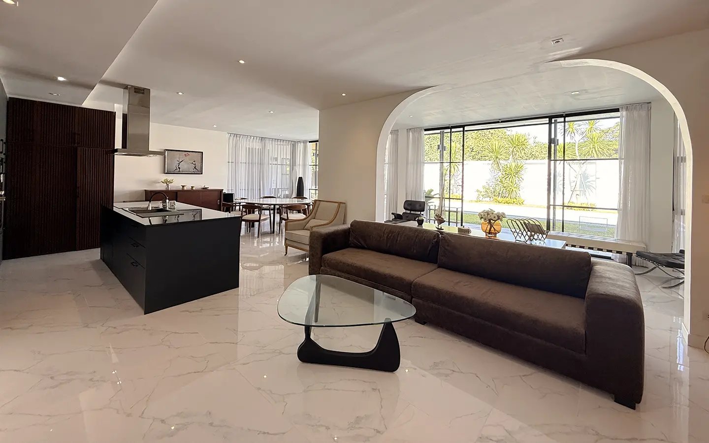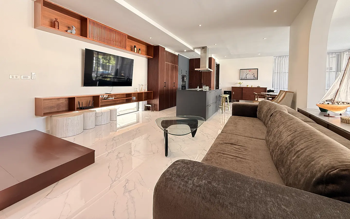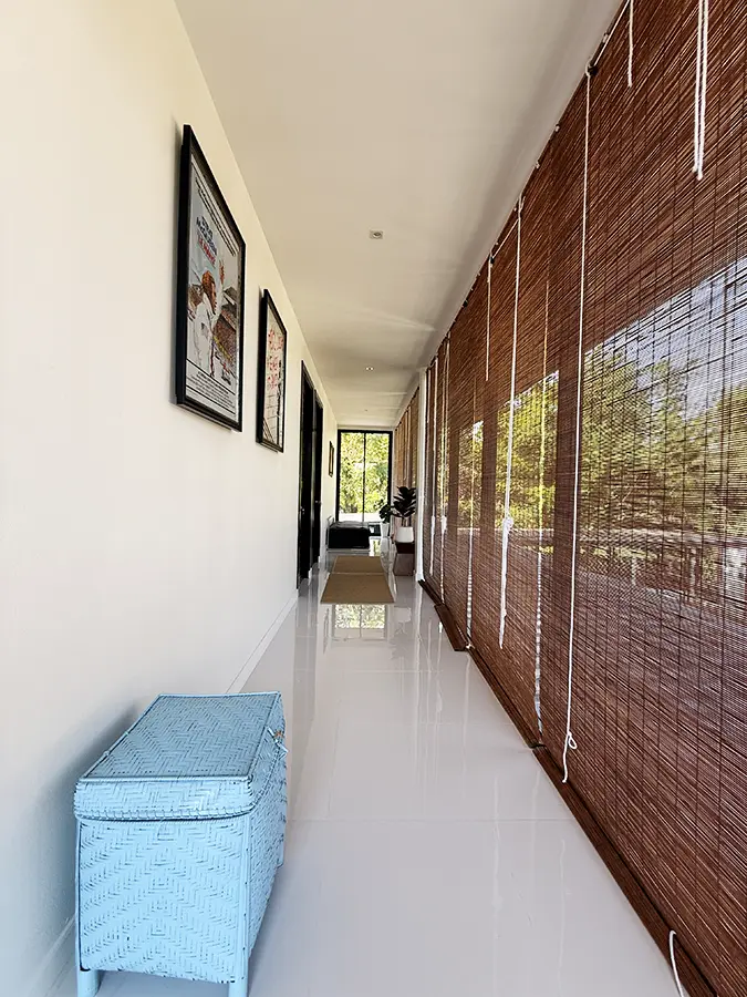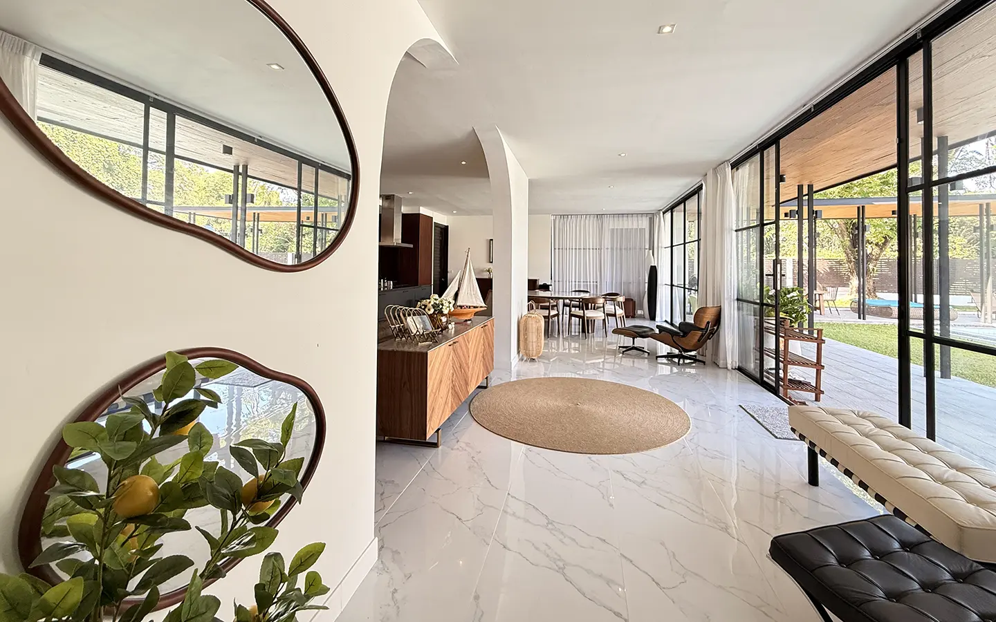 The house is designed with high ceilings and extensive use of glass walls to maximize natural light and provide views of the surrounding greenery. This design helps keep the house cool and comfortable. All furniture is of high quality with stylish and modern design.