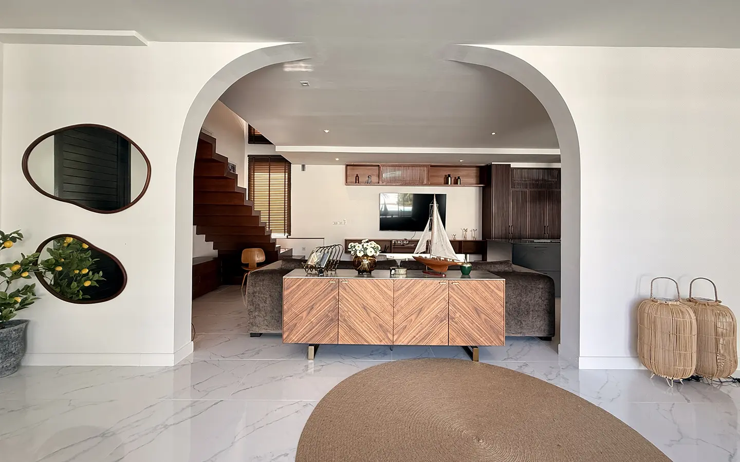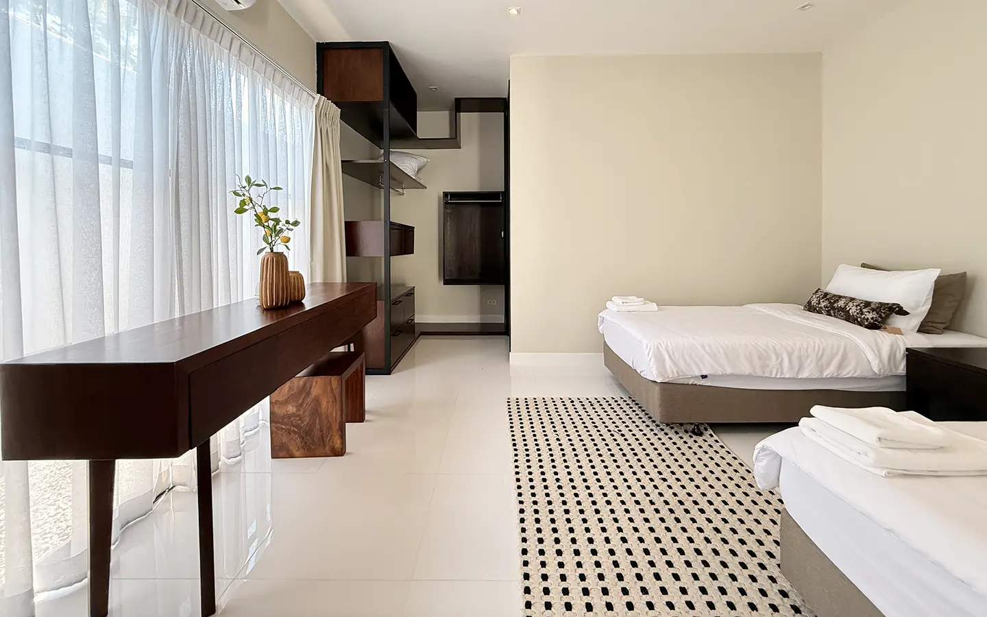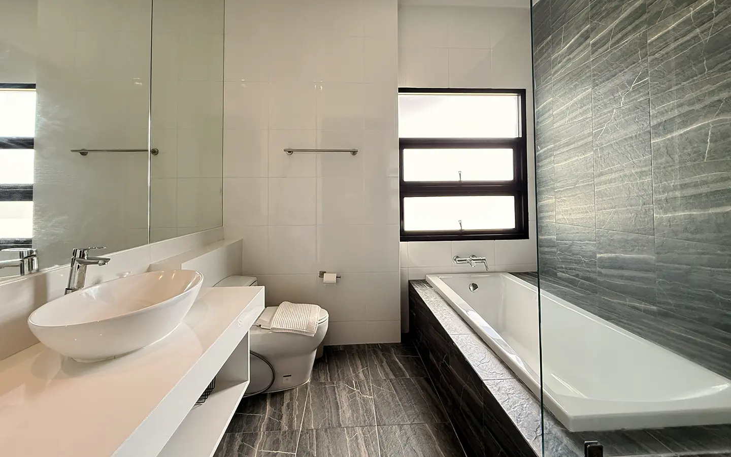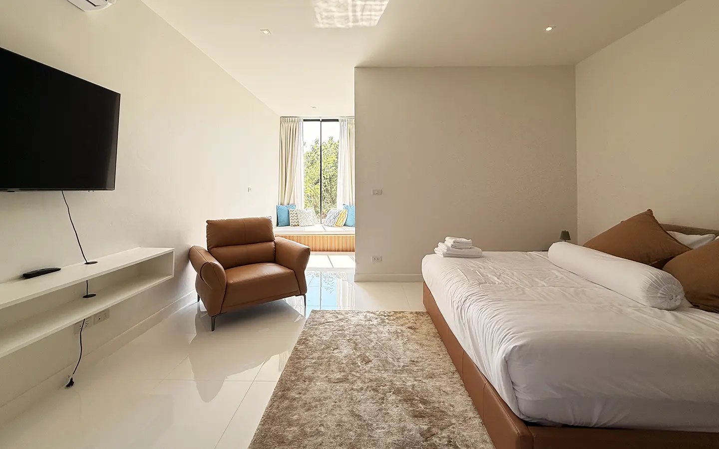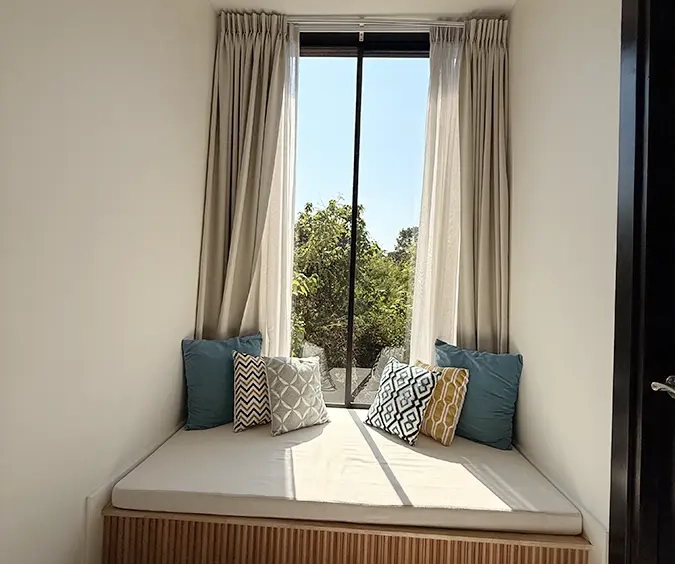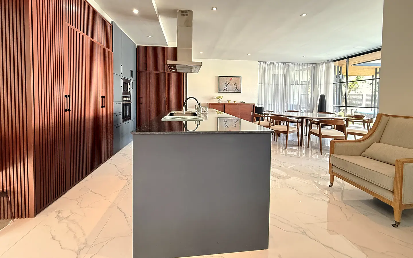The house is designed with high ceilings and extensive use of glass walls to maximize natural light and provide views of the surrounding greenery. This design helps keep the house cool and comfortable. All furniture is of high quality with stylish and modern design.