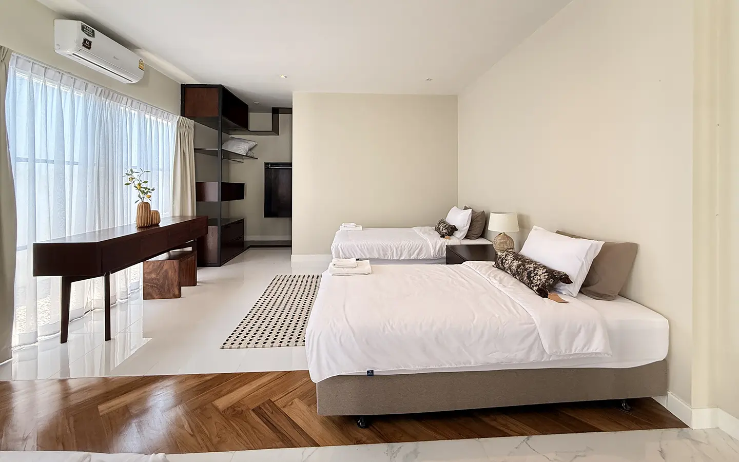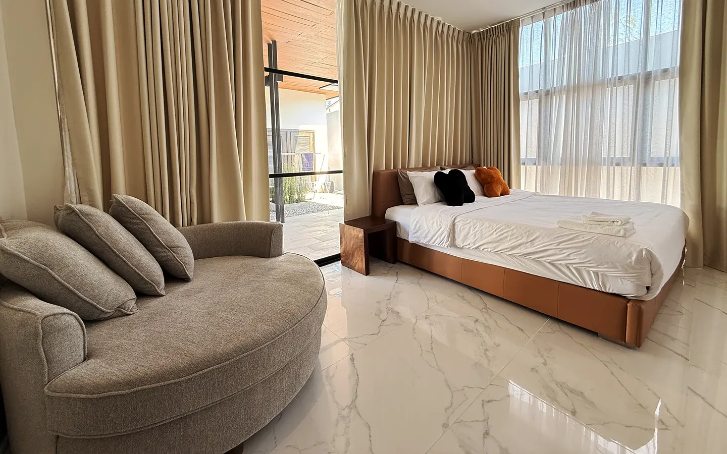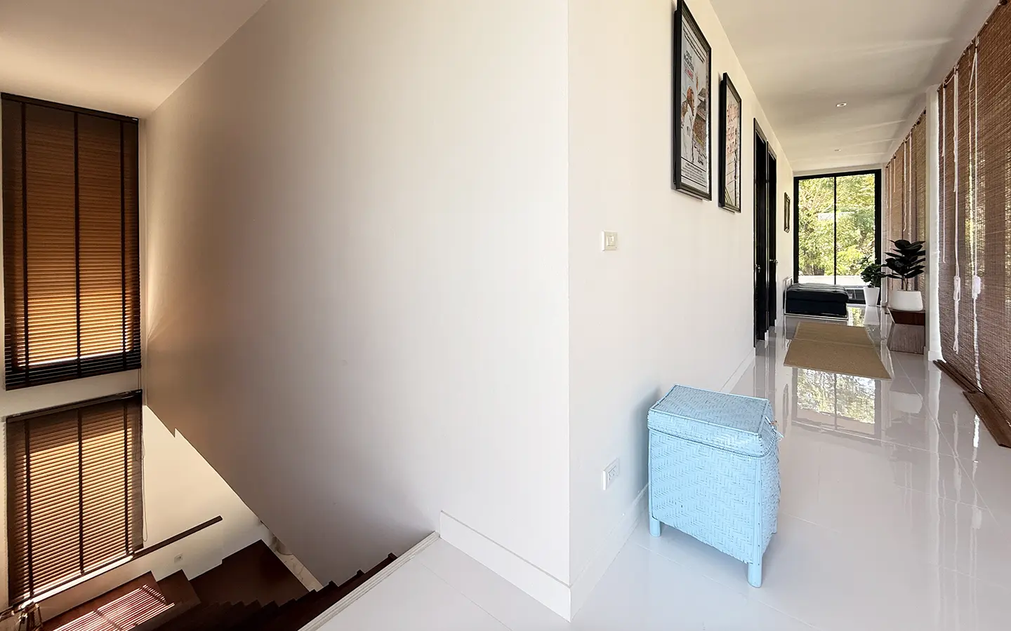 The second floor features a corridor with full glass walls, allowing abundant natural light throughout the space. There are two bedrooms on this level, each with a private en-suite bathroom equipped with a bathtub and his-and-her sinks. Both bedrooms are generously sized and include a cozy reading corner by the window, offering a comfortable and relaxing atmosphere.