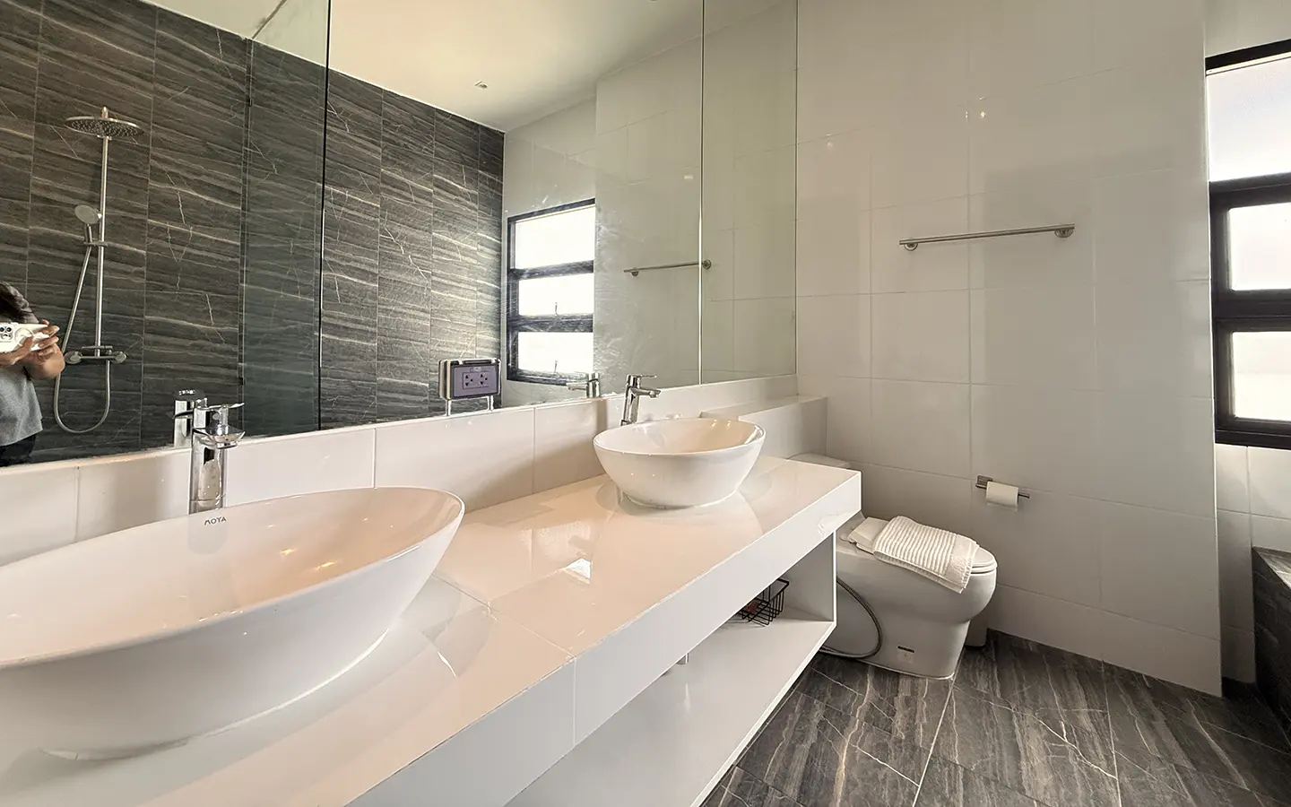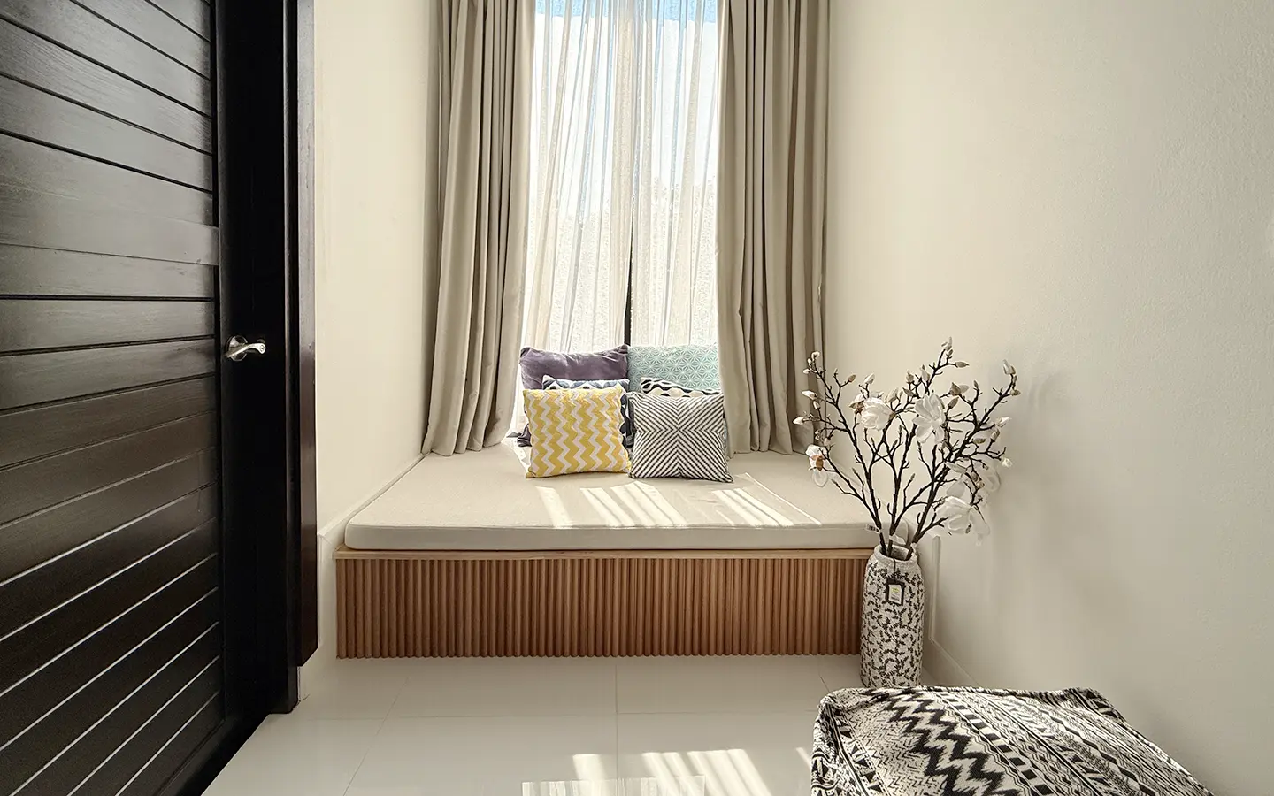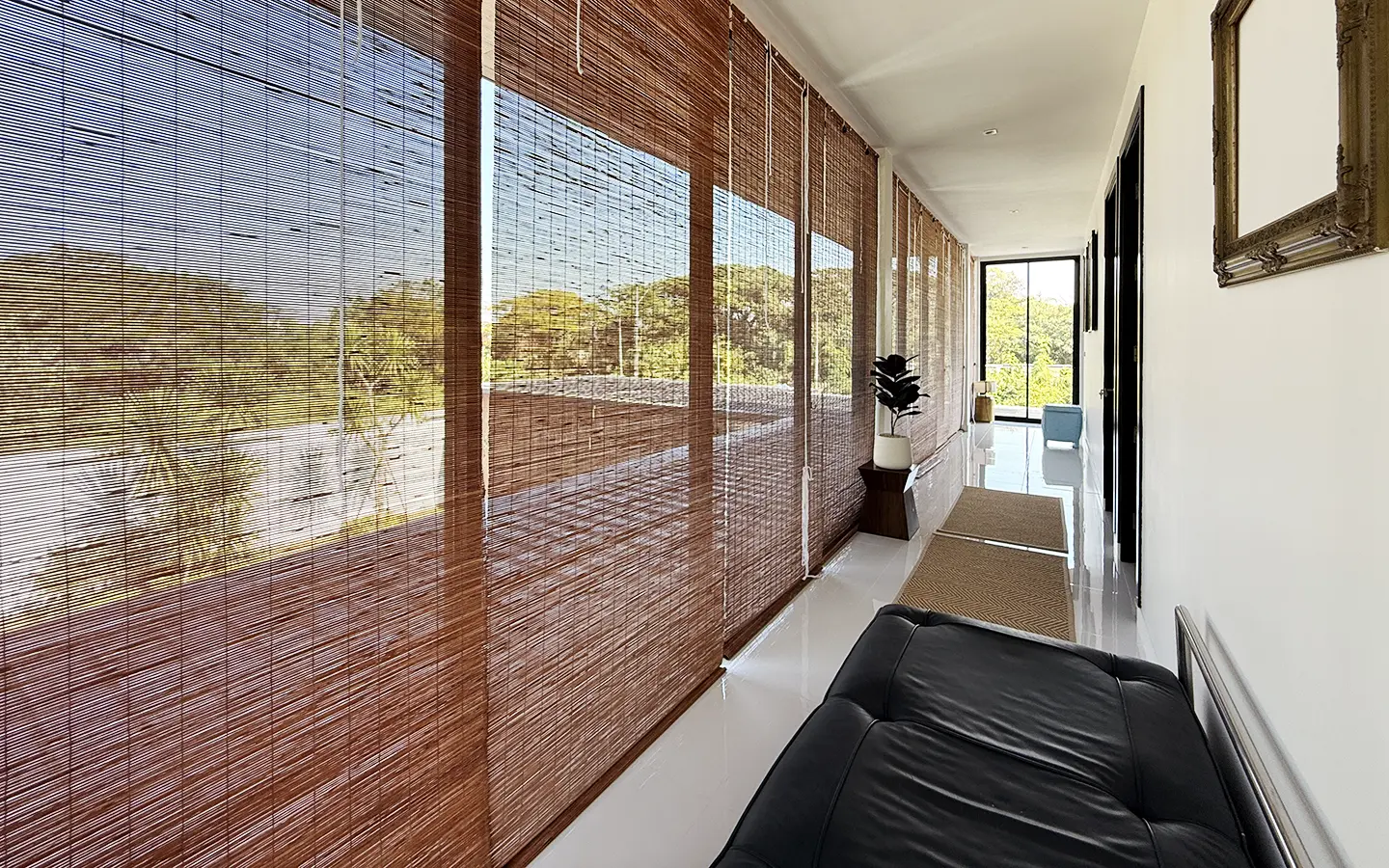 The second floor features a corridor with full glass walls, allowing abundant natural light throughout the space. There are two bedrooms on this level, each with a private en-suite bathroom equipped with a bathtub and his-and-her sinks. Both bedrooms are generously sized and include a cozy reading corner by the window, offering a comfortable and relaxing atmosphere.