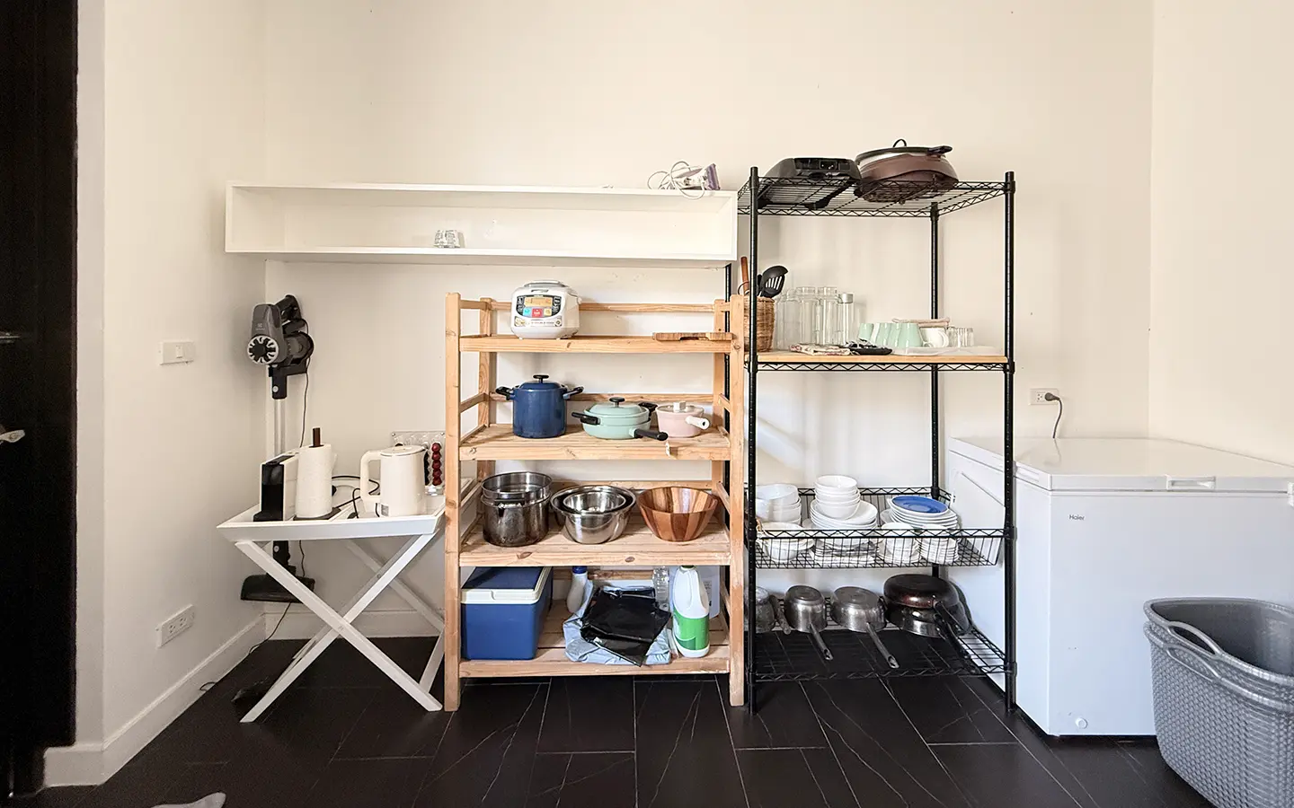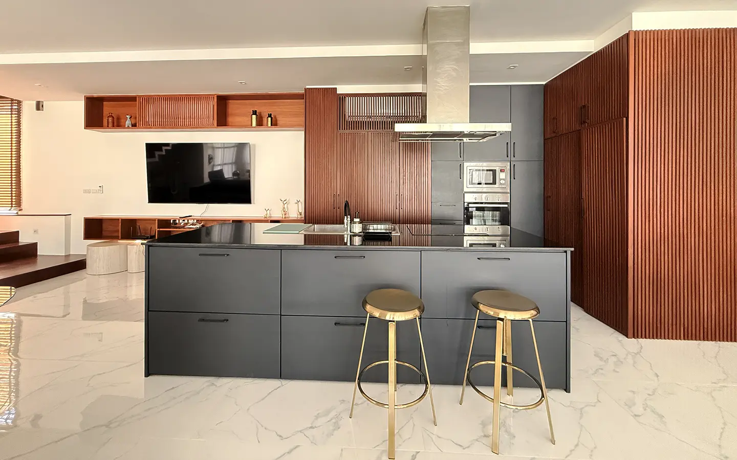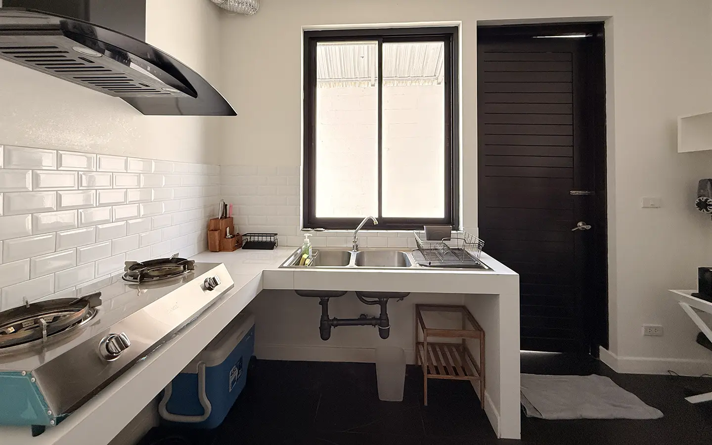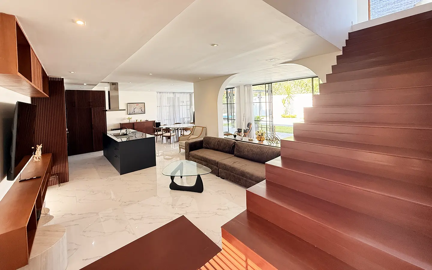 Upon entering the house, you are welcomed by a spacious open-plan living area. On the right-hand side is a European-style kitchen, dining area, and a shared bathroom. On the left-hand side is a guest bedroom with an en-suite bathroom, along with a wooden staircase leading to the second floor.