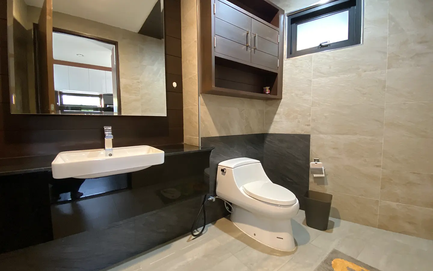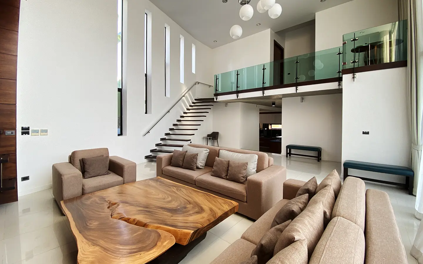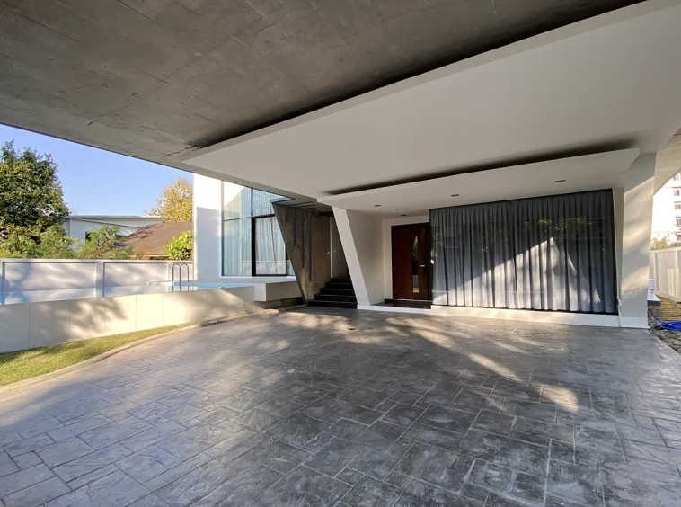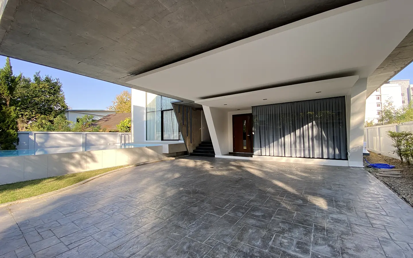 The villa is uniquely designed and built with a stamp exposed thick concrete exterior finish for energy saving. Beautiful granite tiles on the ground floor and teak wood parquet on the second floor. The living room has a 3.5-meter tall ceiling and floor-to-ceiling windows for natural light and ventilation, built-in wall unit and a beautiful sofa set with large wooden table. Split level leads to a spacious multi-purpose dining/sitting area, which can also be accessed from the carport, and a fully fitted Western kitchen with built-in appliances. A storage room and guest bathroom completed the ground floor.