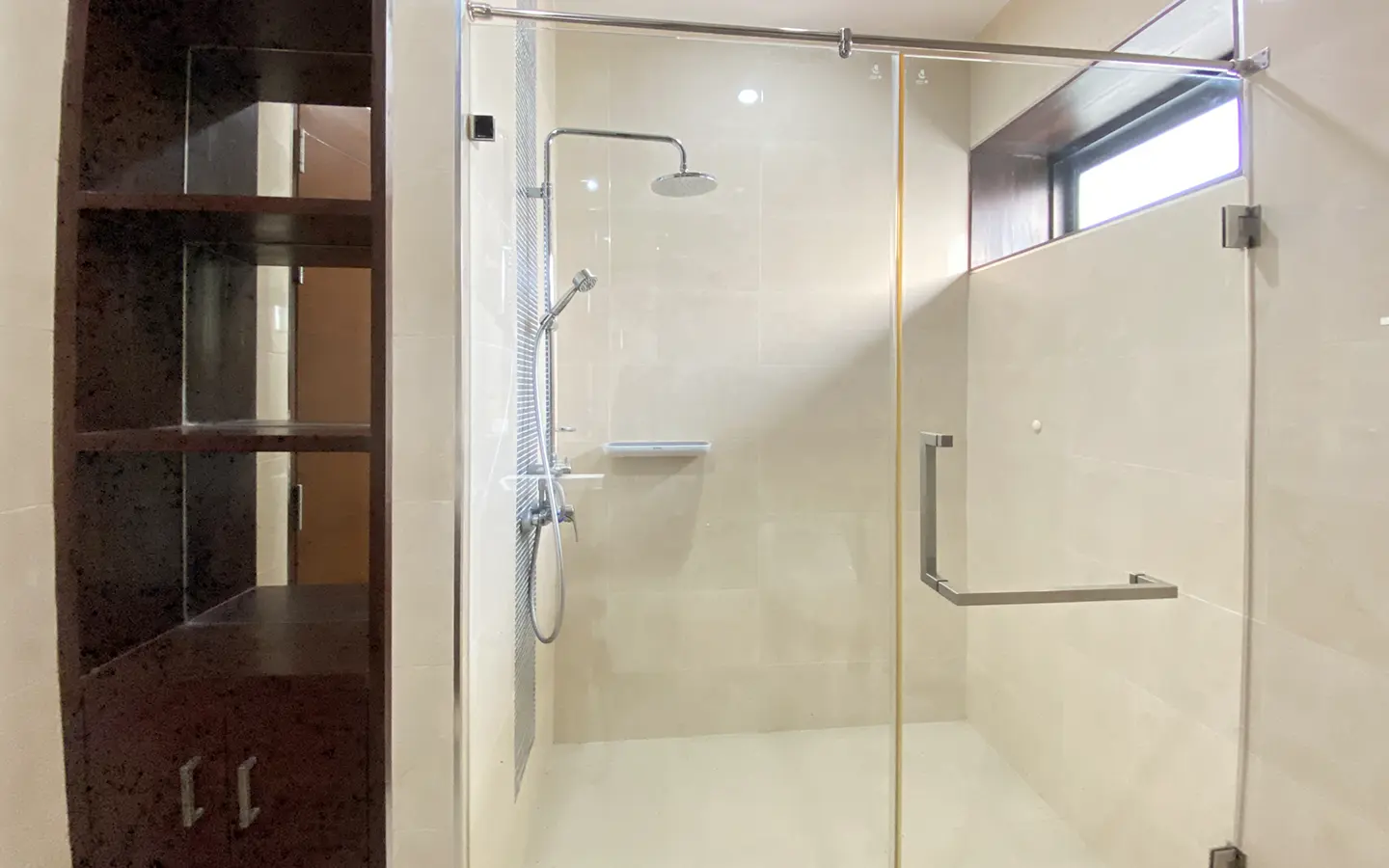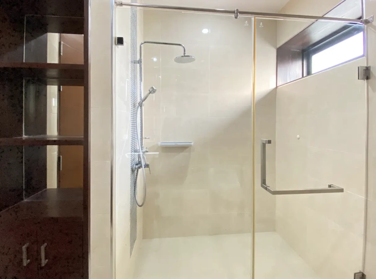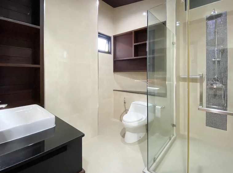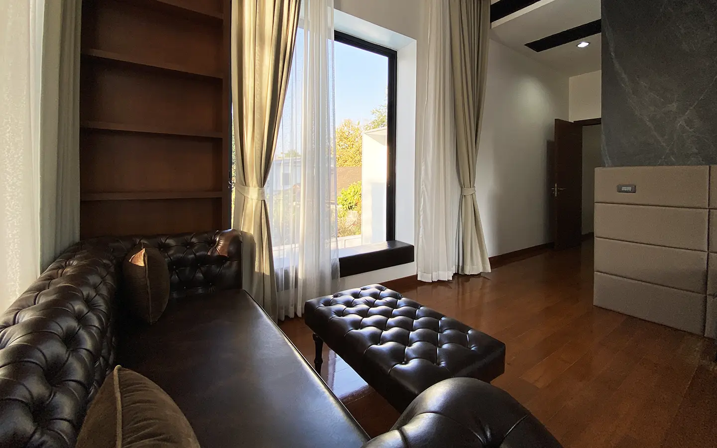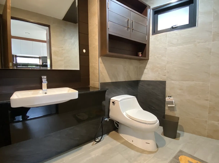 The villa is uniquely designed and built with a stamp exposed thick concrete exterior finish for energy saving. Beautiful granite tiles on the ground floor and teak wood parquet on the second floor. The living room has a 3.5-meter tall ceiling and floor-to-ceiling windows for natural light and ventilation, built-in wall unit and a beautiful sofa set with large wooden table. Split level leads to a spacious multi-purpose dining/sitting area, which can also be accessed from the carport, and a fully fitted Western kitchen with built-in appliances. A storage room and guest bathroom completed the ground floor.