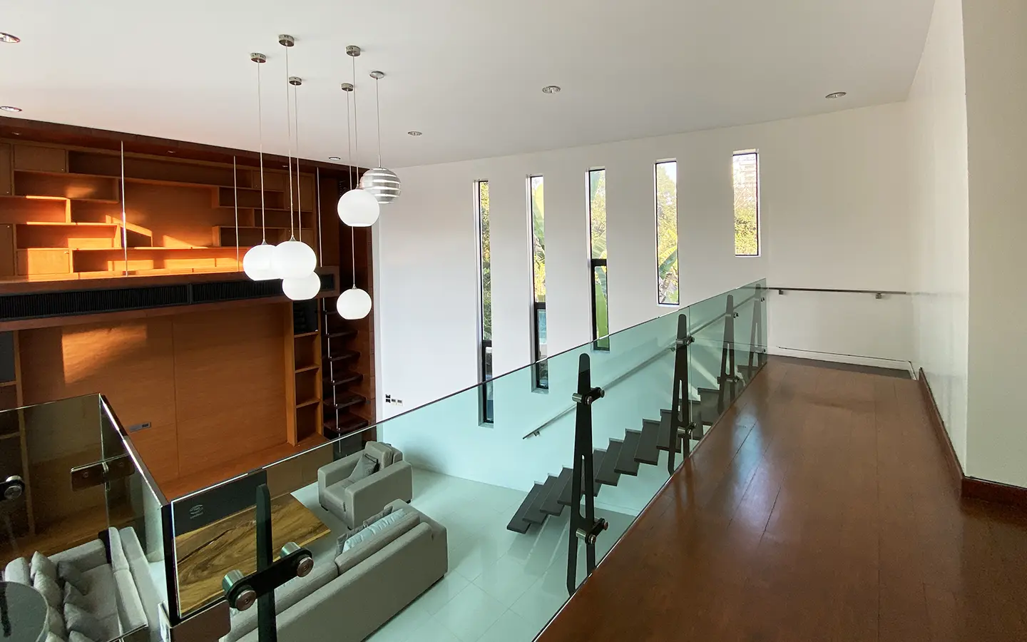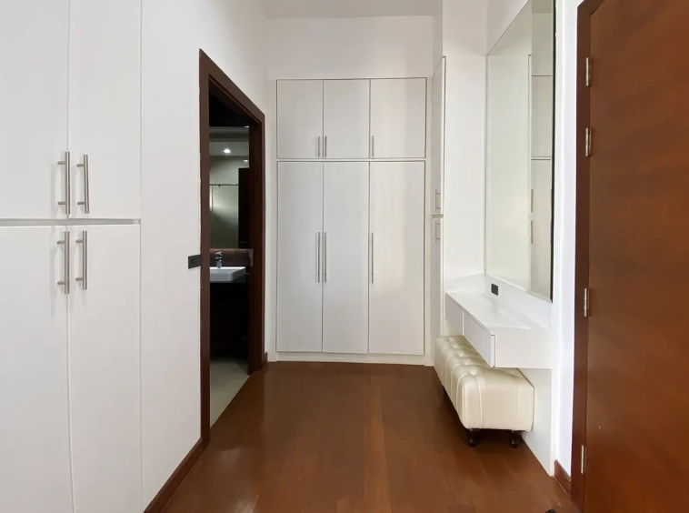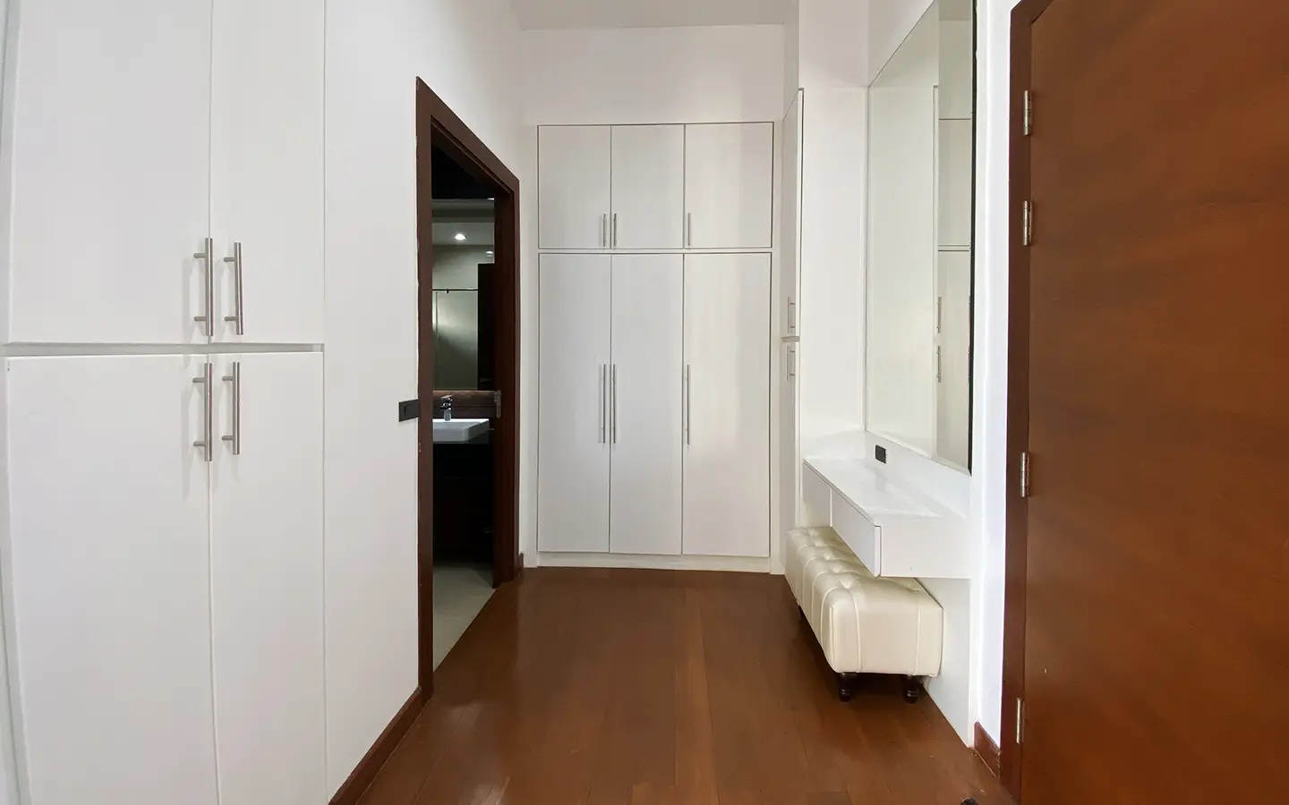 A free-standing teak wood staircase leads to the second floor, where there are 3 beautiful bathrooms, all en suite and with built-in furniture. All have large windows for good natural light and are stylishly furnished.