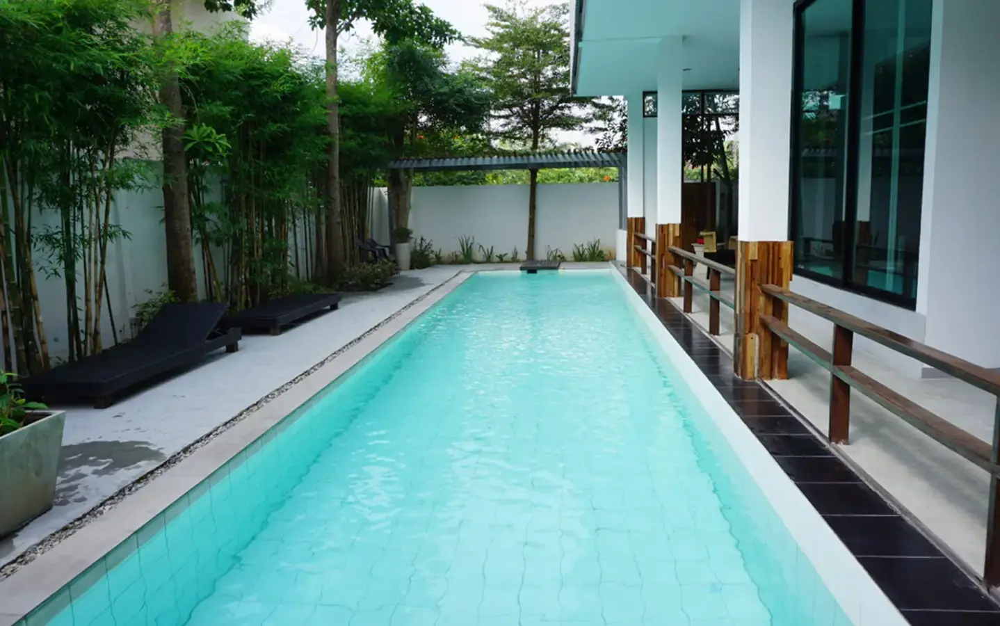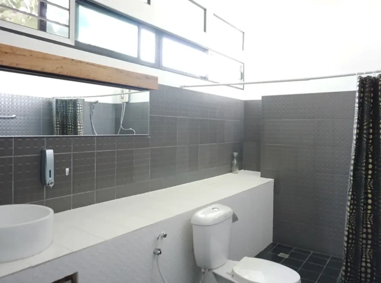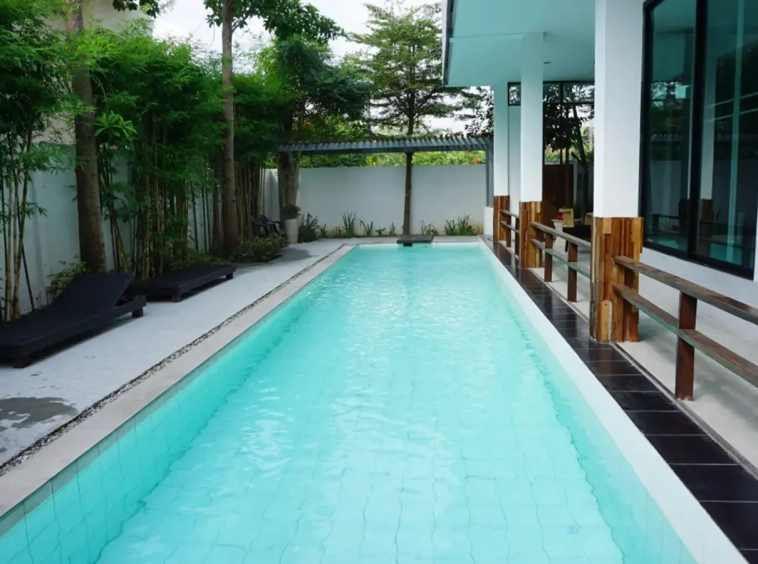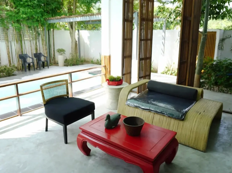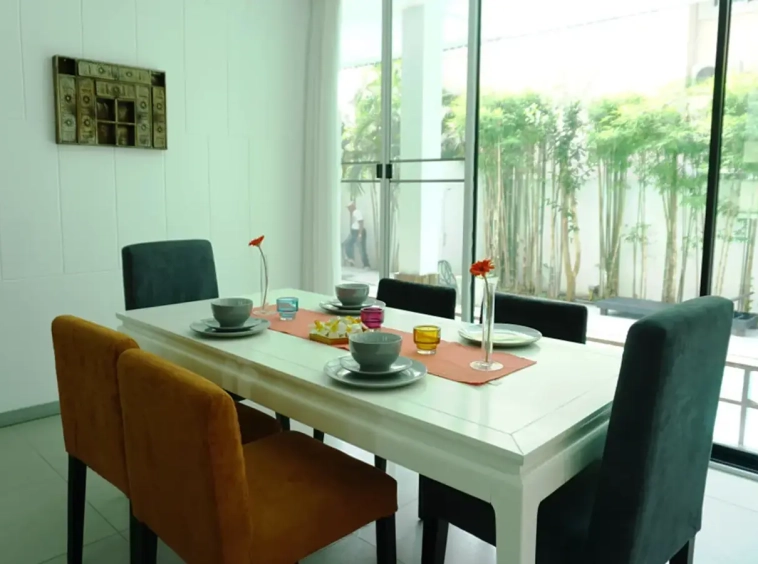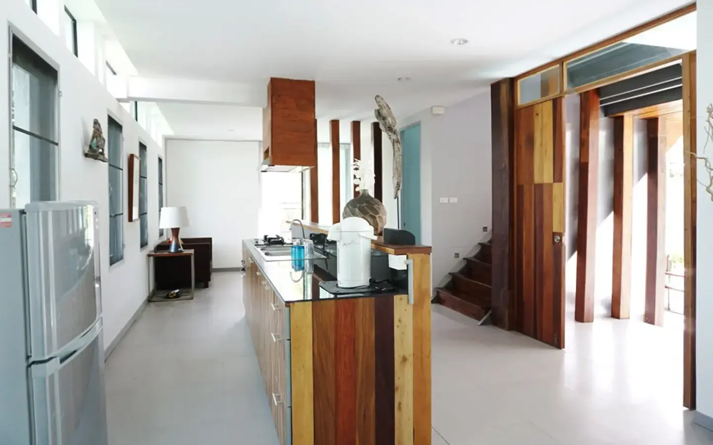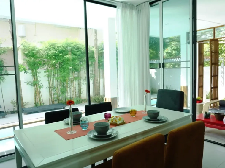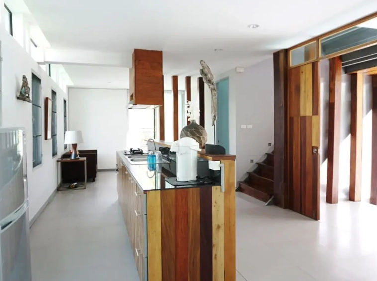 This house has a good design and fits comfortably into a rectangular piece of land and make good use of the available space. On the first floor, entering via a custom made front door to the house, you will notice a wooden counter which has a Western Style kitchen with stove, hood, oven complete with cabinets and drawers, on the right-hand side, there is a living space which can be utilized as an office, and a spacious storage room with built-in shelves. On the left-hand side, there is a dining area which has sliding doors to offer access to the swimming pool and outside sitting area. The house has high ceilings and large glazed sliding doors which allows plenty of light and gives it that airy feeling.
