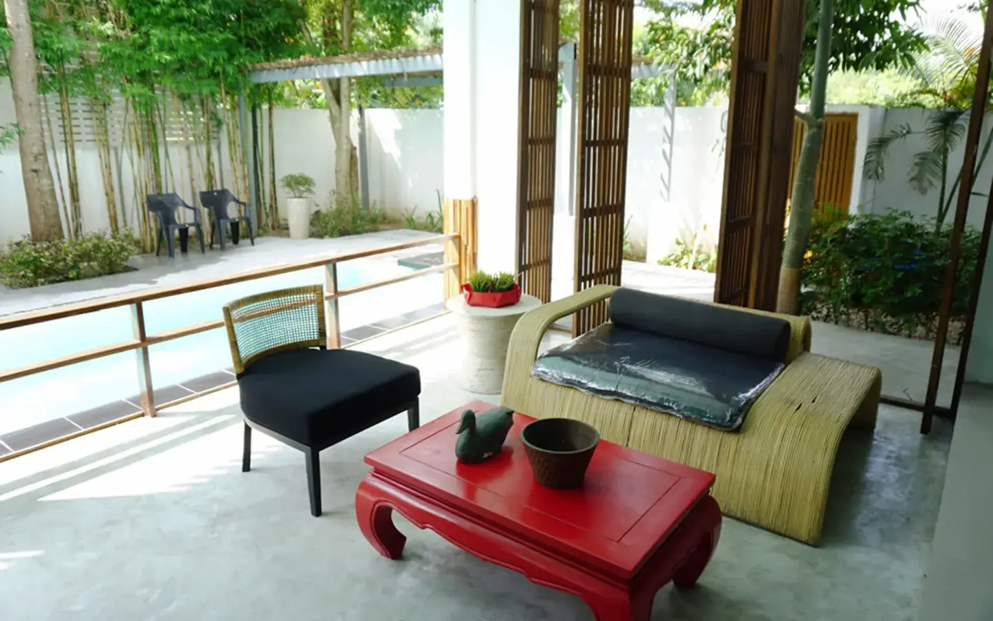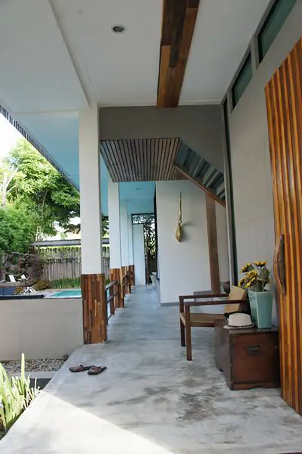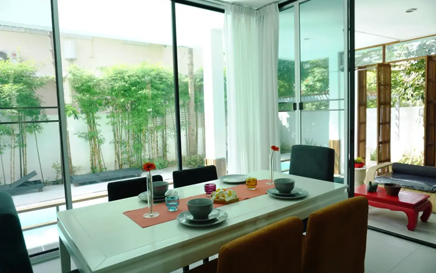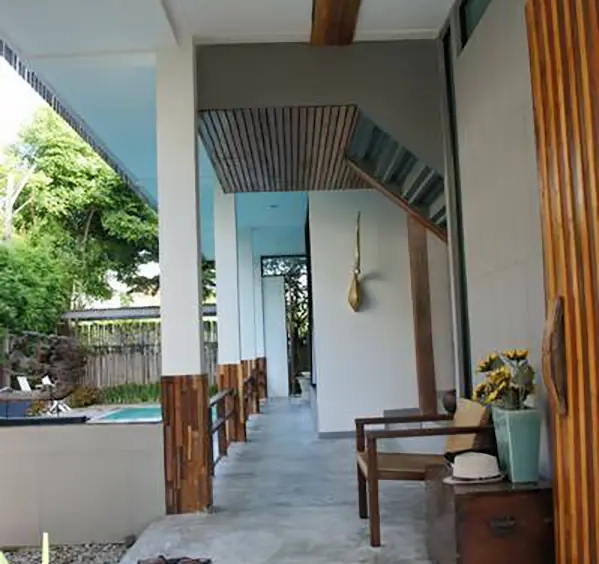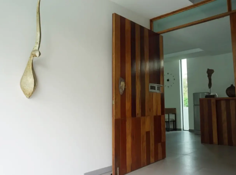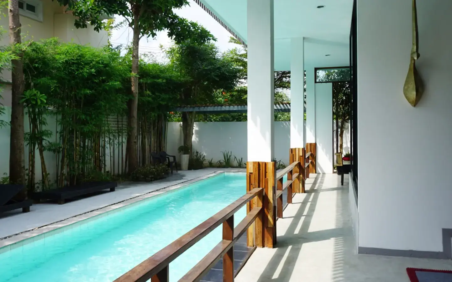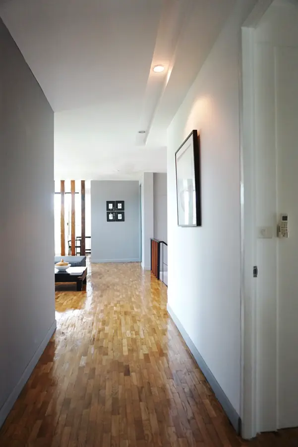 This house has a good design and fits comfortably into a rectangular piece of land and make good use of the available space. On the first floor, entering via a custom made front door to the house, you will notice a wooden counter which has a Western Style kitchen with stove, hood, oven complete with cabinets and drawers, on the right-hand side, there is a living space which can be utilized as an office, and a spacious storage room with built-in shelves. On the left-hand side, there is a dining area which has sliding doors to offer access to the swimming pool and outside sitting area. The house has high ceilings and large glazed sliding doors which allows plenty of light and gives it that airy feeling.