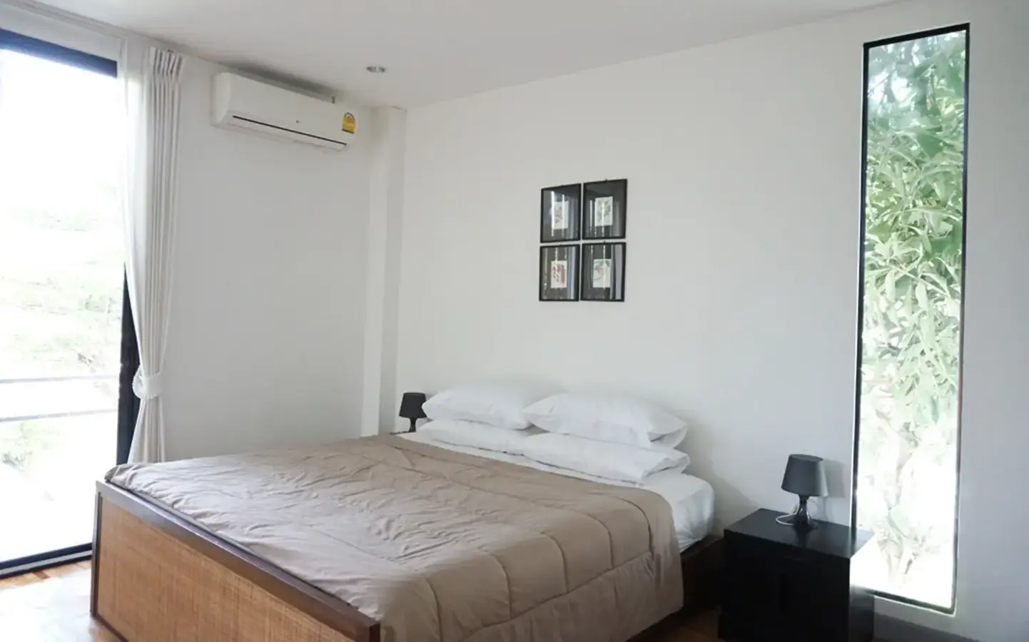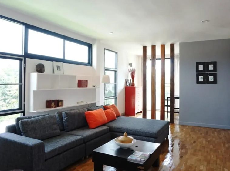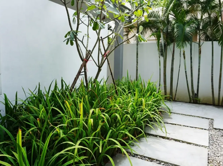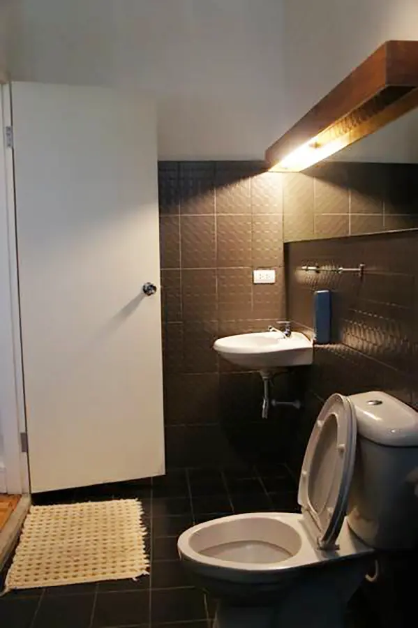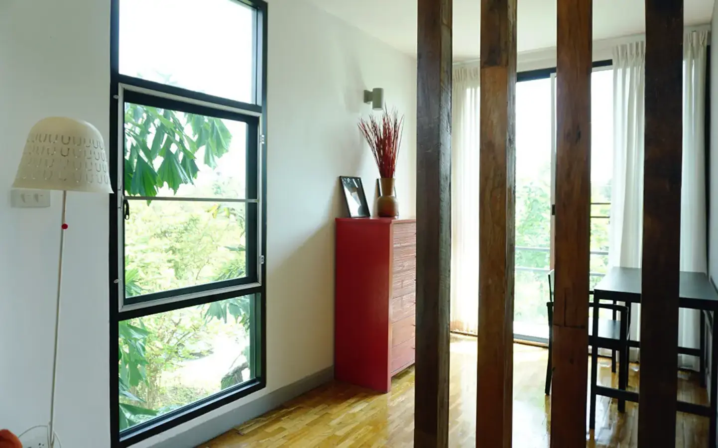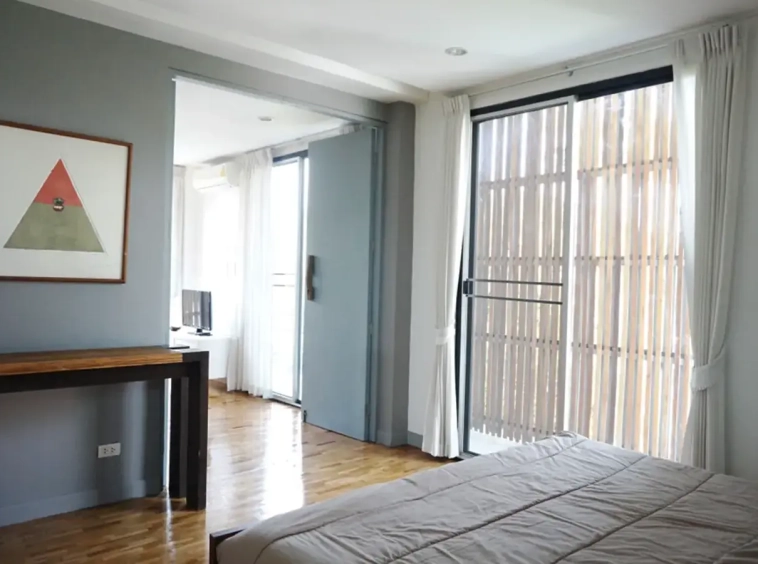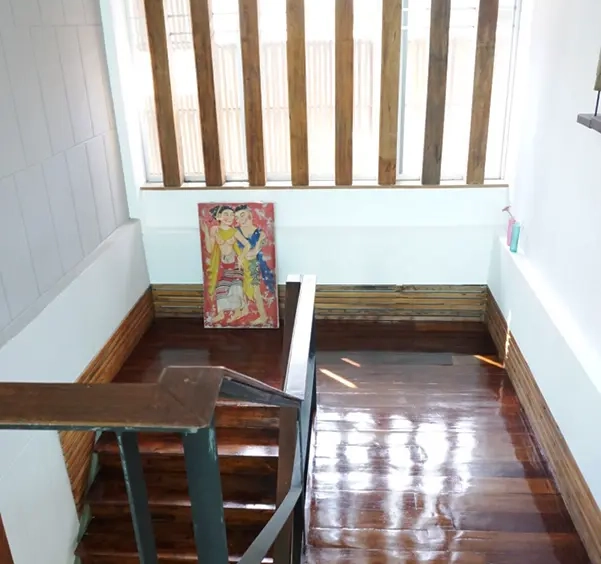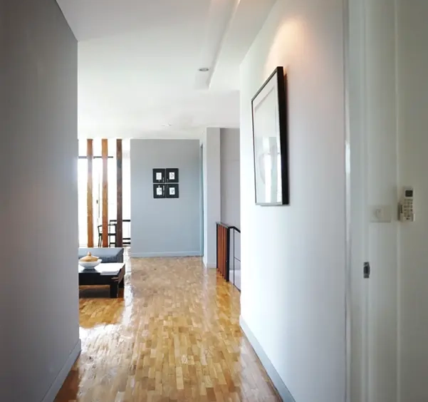 This house has a good design and fits comfortably into a rectangular piece of land and make good use of the available space. On the first floor, entering via a custom made front door to the house, you will notice a wooden counter which has a Western Style kitchen with stove, hood, oven complete with cabinets and drawers, on the right-hand side, there is a living space which can be utilized as an office, and a spacious storage room with built-in shelves. On the left-hand side, there is a dining area which has sliding doors to offer access to the swimming pool and outside sitting area. The house has high ceilings and large glazed sliding doors which allows plenty of light and gives it that airy feeling.