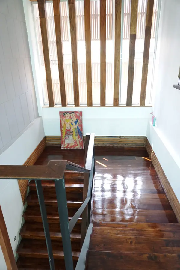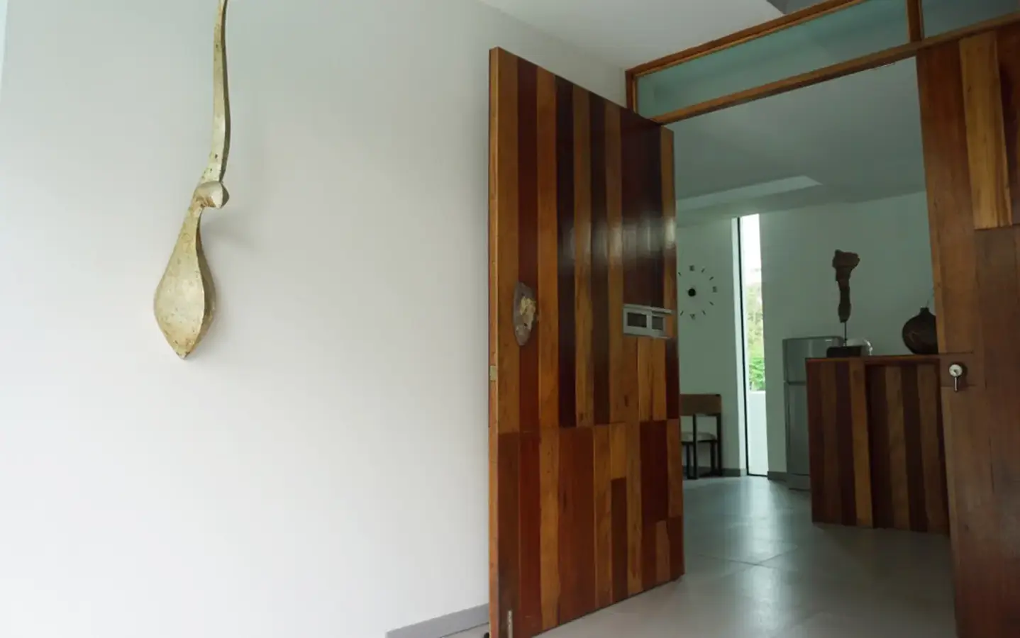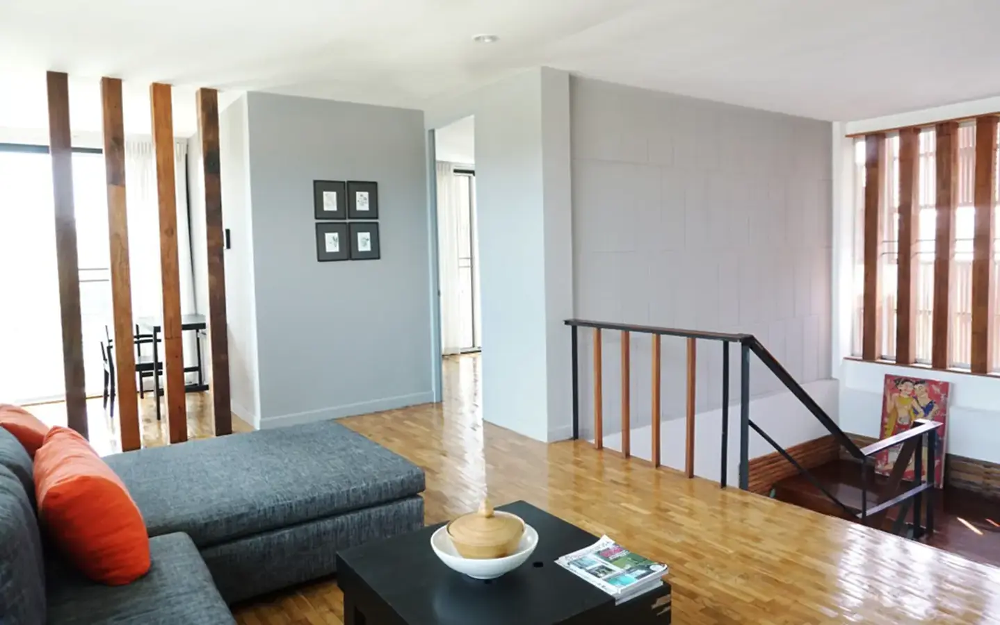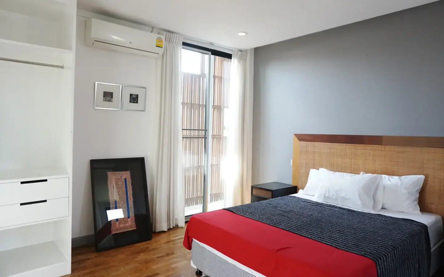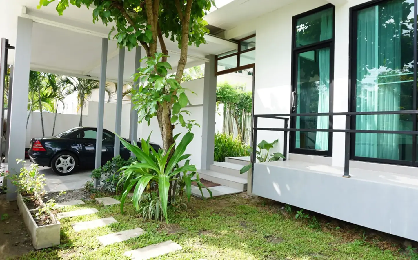 This house has a good design and fits comfortably into a rectangular piece of land and make good use of the available space. On the first floor, entering via a custom made front door to the house, you will notice a wooden counter which has a Western Style kitchen with stove, hood, oven complete with cabinets and drawers, on the right-hand side, there is a living space which can be utilized as an office, and a spacious storage room with built-in shelves. On the left-hand side, there is a dining area which has sliding doors to offer access to the swimming pool and outside sitting area. The house has high ceilings and large glazed sliding doors which allows plenty of light and gives it that airy feeling.