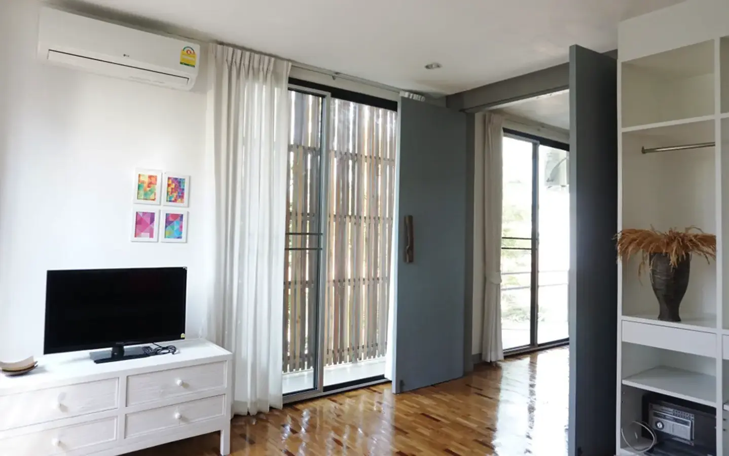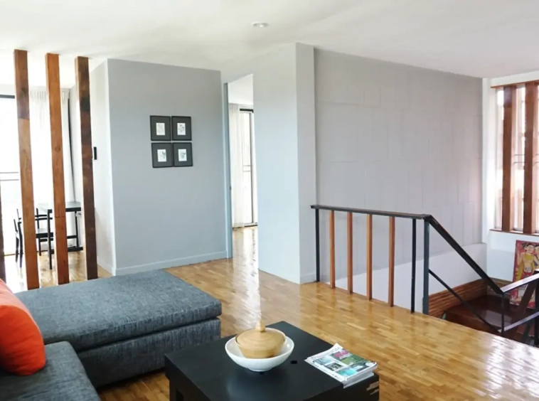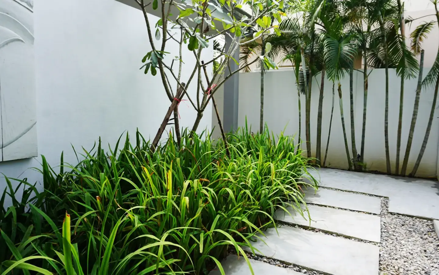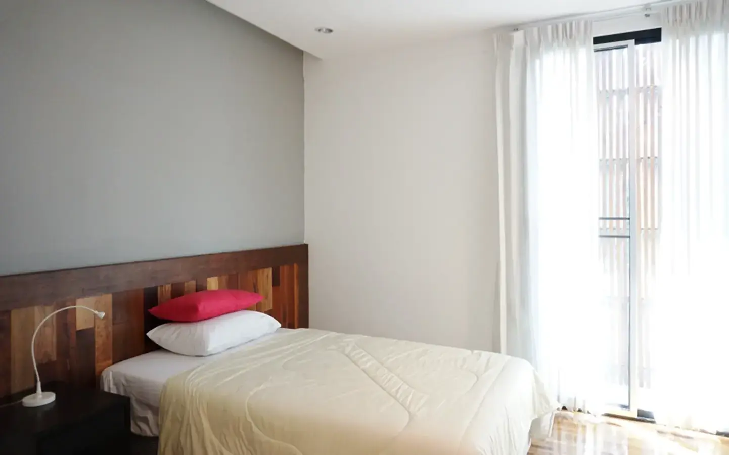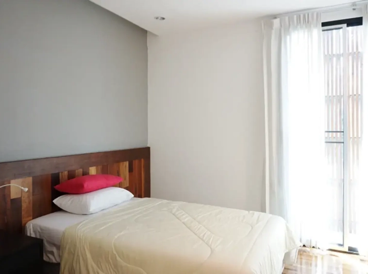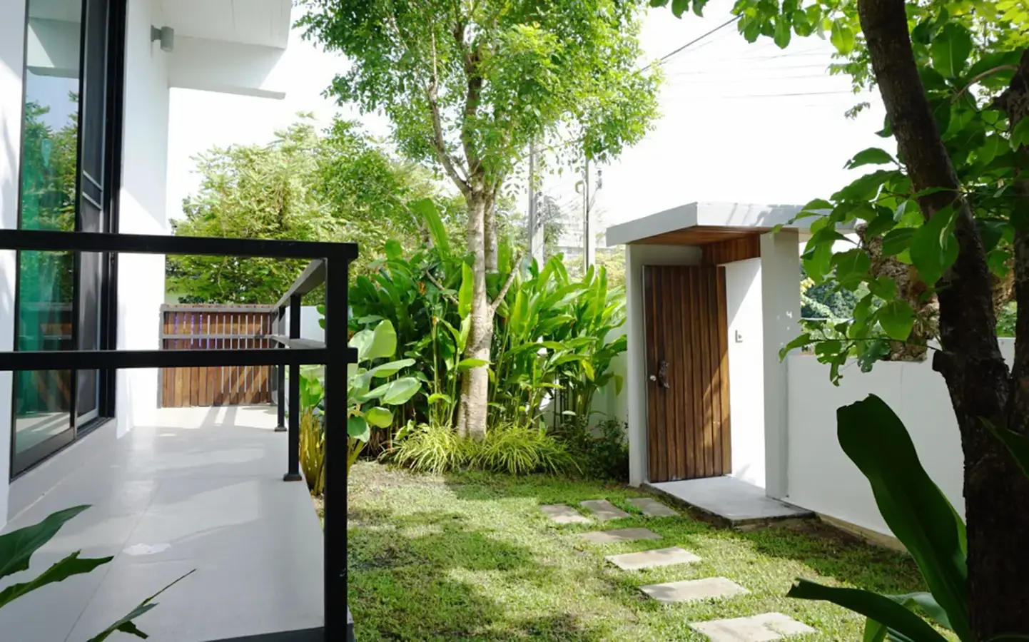 This house has a good design and fits comfortably into a rectangular piece of land and make good use of the available space. On the first floor, entering via a custom made front door to the house, you will notice a wooden counter which has a Western Style kitchen with stove, hood, oven complete with cabinets and drawers, on the right-hand side, there is a living space which can be utilized as an office, and a spacious storage room with built-in shelves. On the left-hand side, there is a dining area which has sliding doors to offer access to the swimming pool and outside sitting area. The house has high ceilings and large glazed sliding doors which allows plenty of light and gives it that airy feeling.