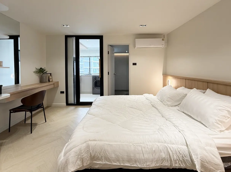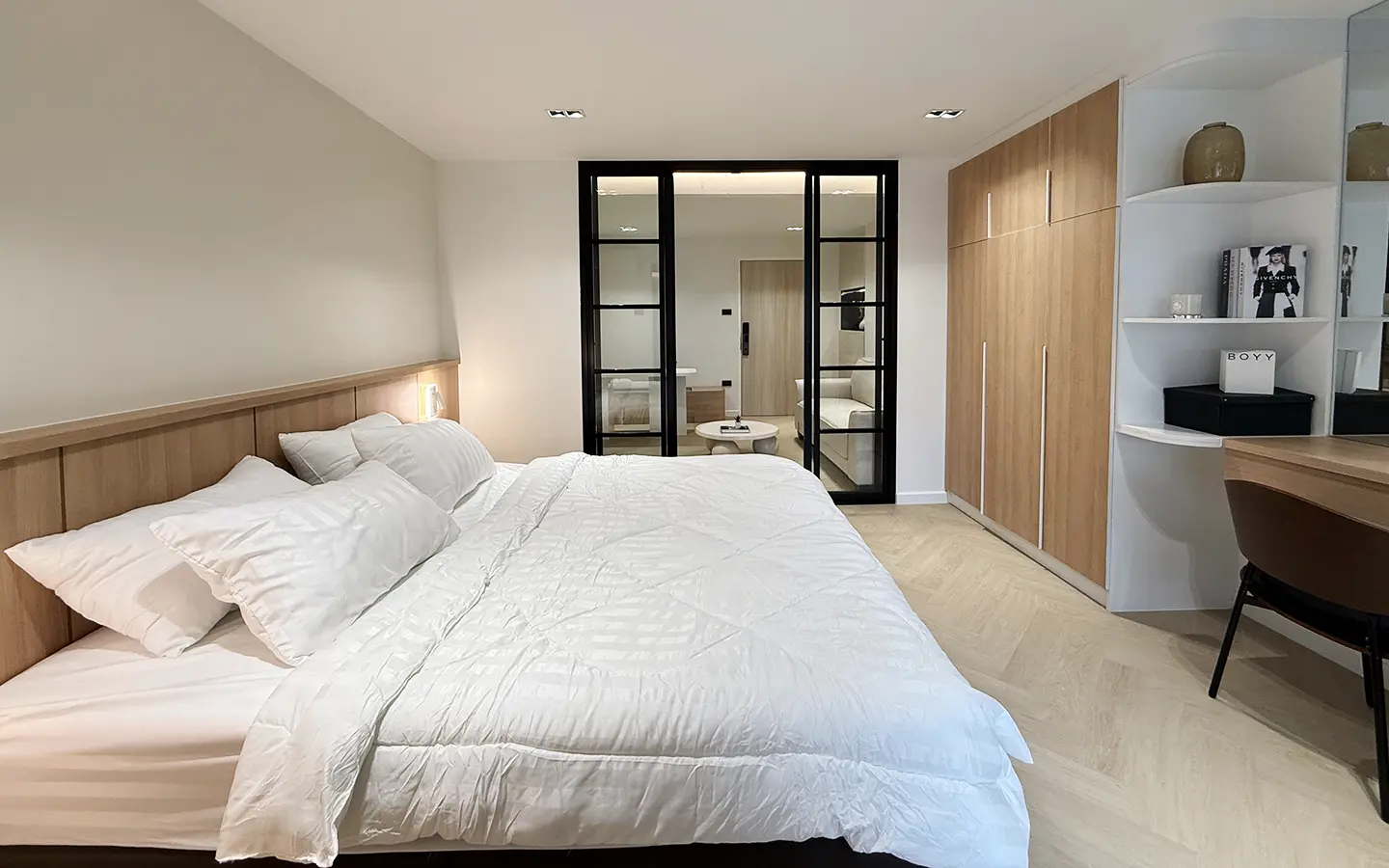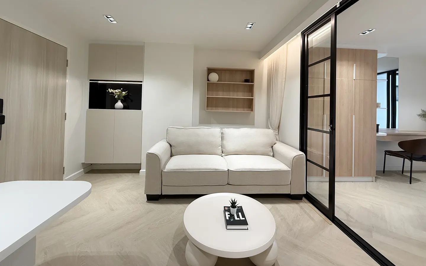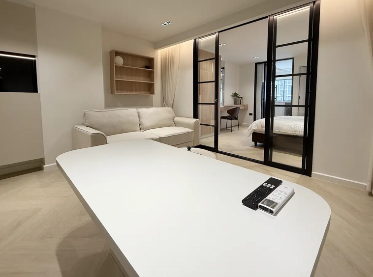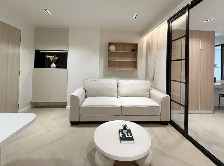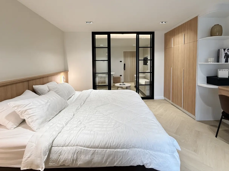 As you enter, you’ll find a comfortable sofa, built-in cabinets, and a cozy seating area perfect for working or entertaining guests. A sliding door separates the living room from the bedroom, which features an ensuite bathroom that’s spacious and well-designed.