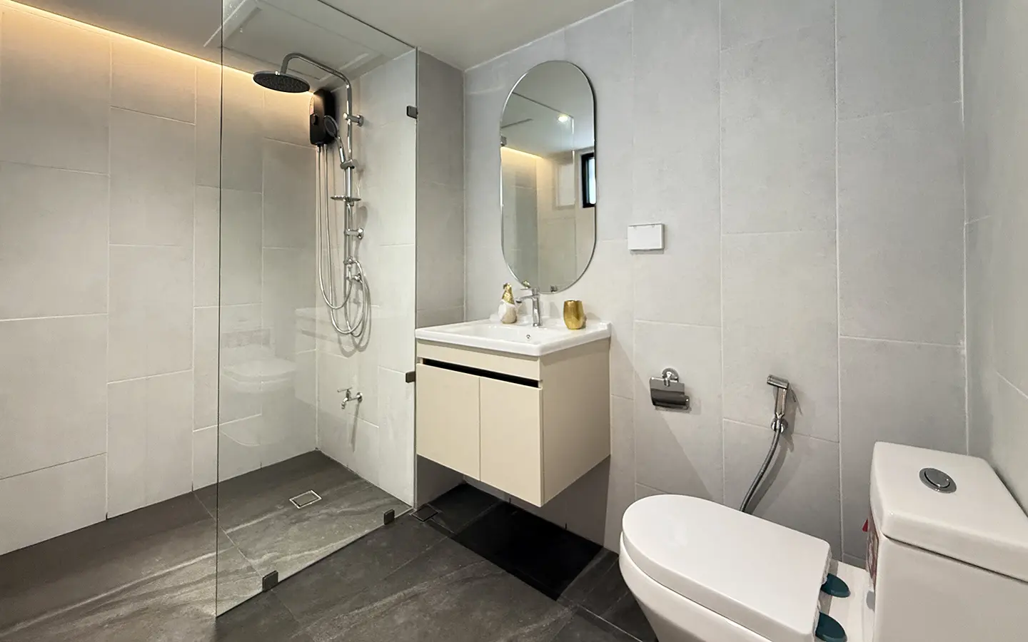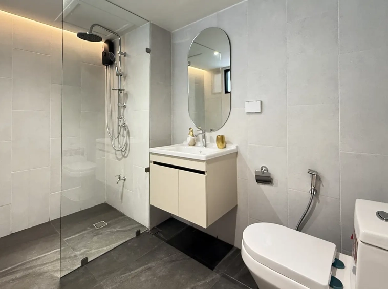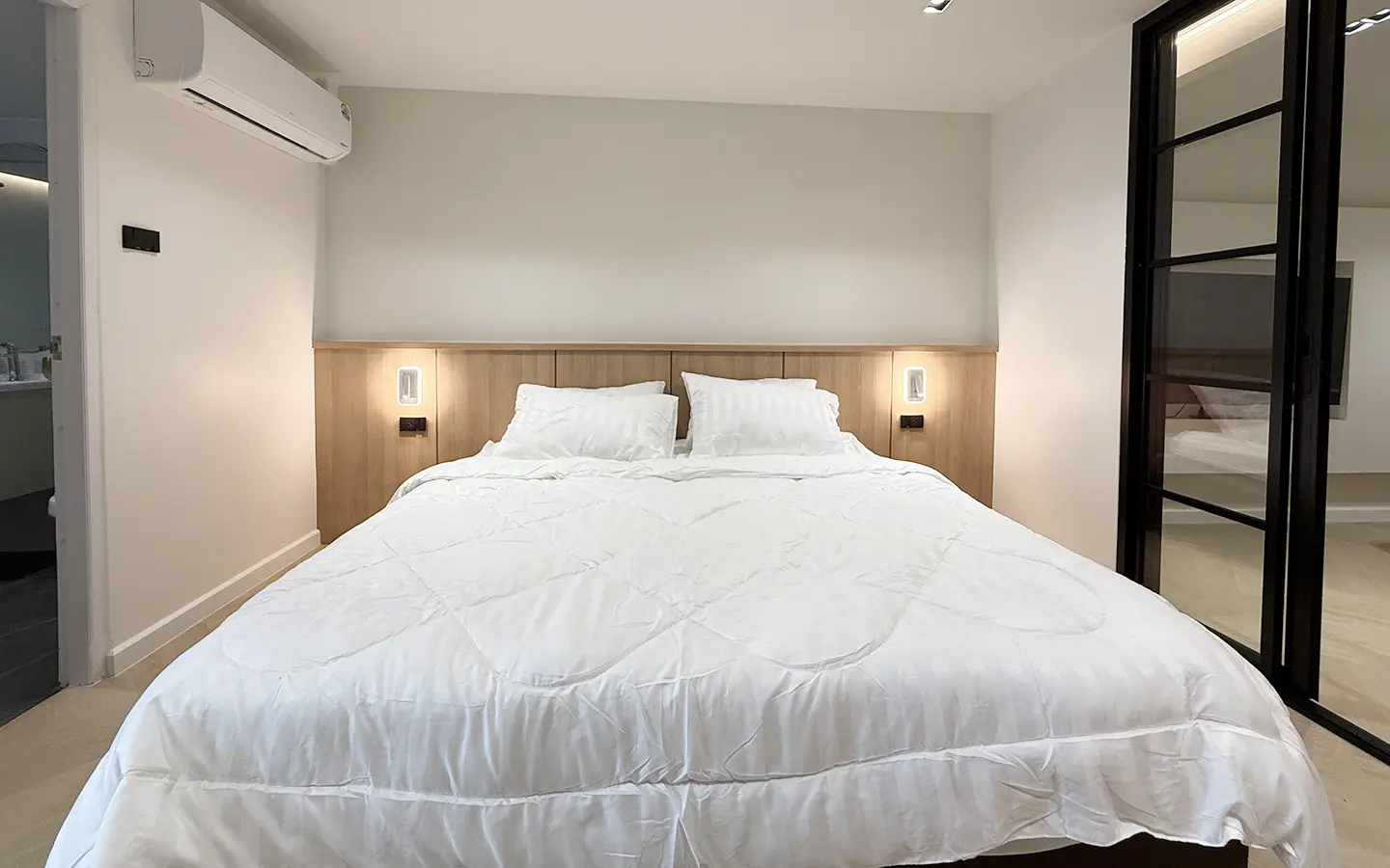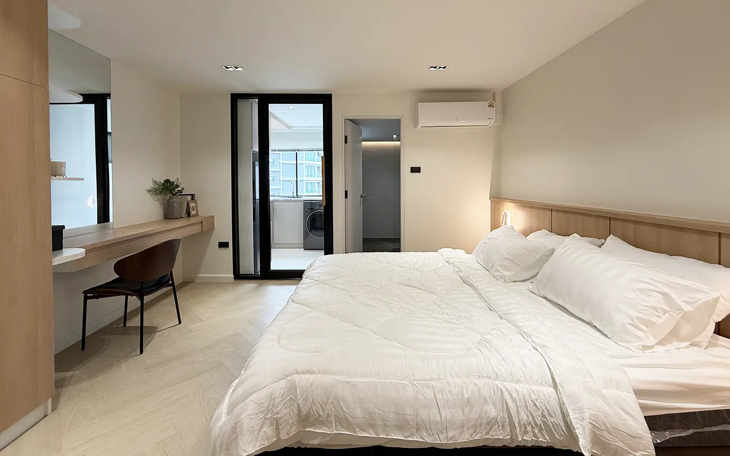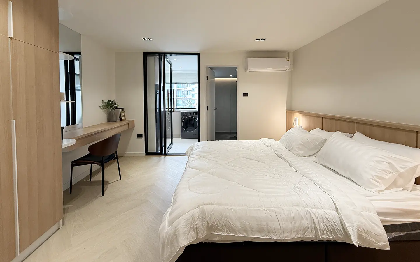 As you enter, you’ll find a comfortable sofa, built-in cabinets, and a cozy seating area perfect for working or entertaining guests. A sliding door separates the living room from the bedroom, which features an ensuite bathroom that’s spacious and well-designed.