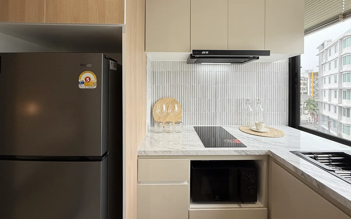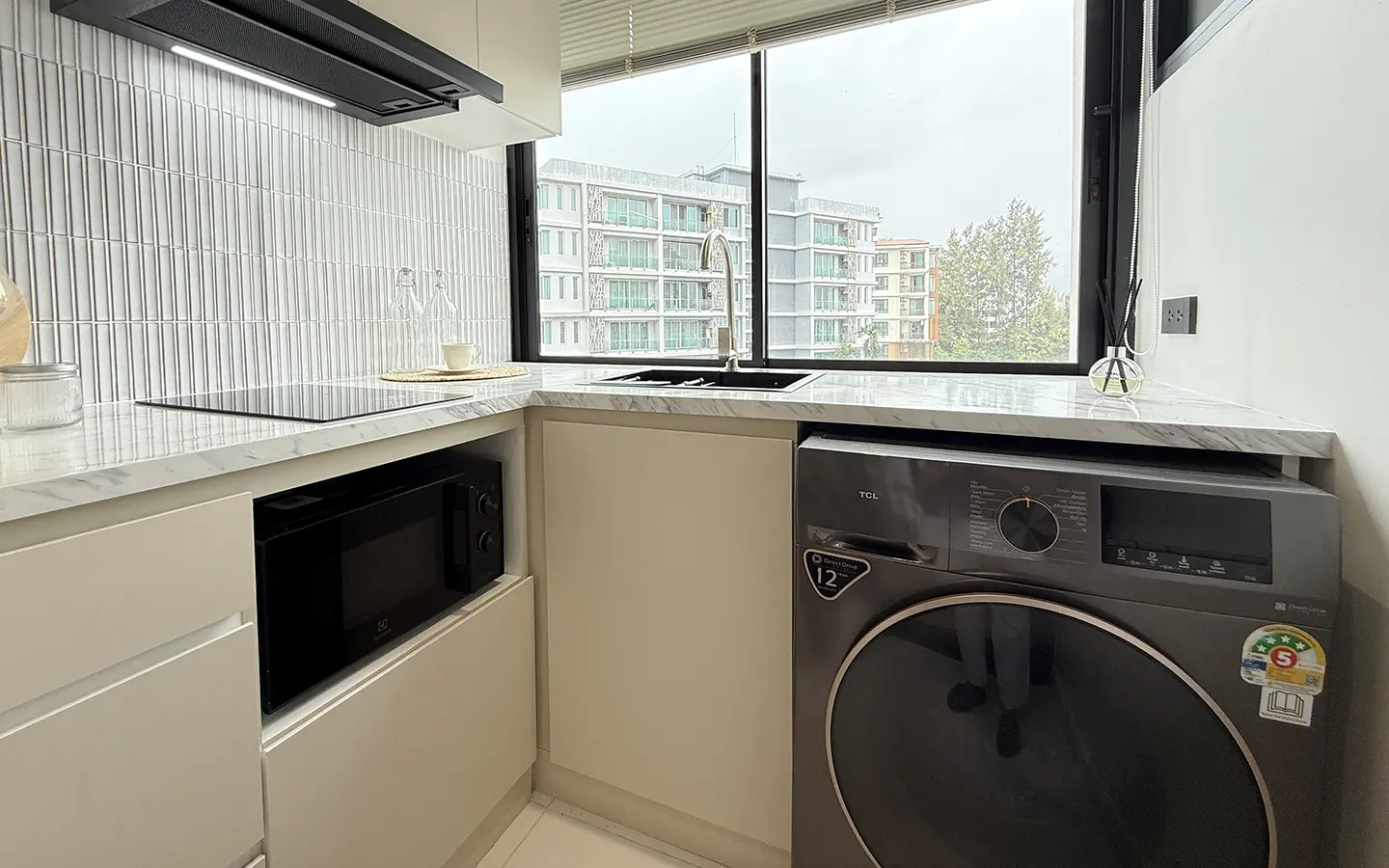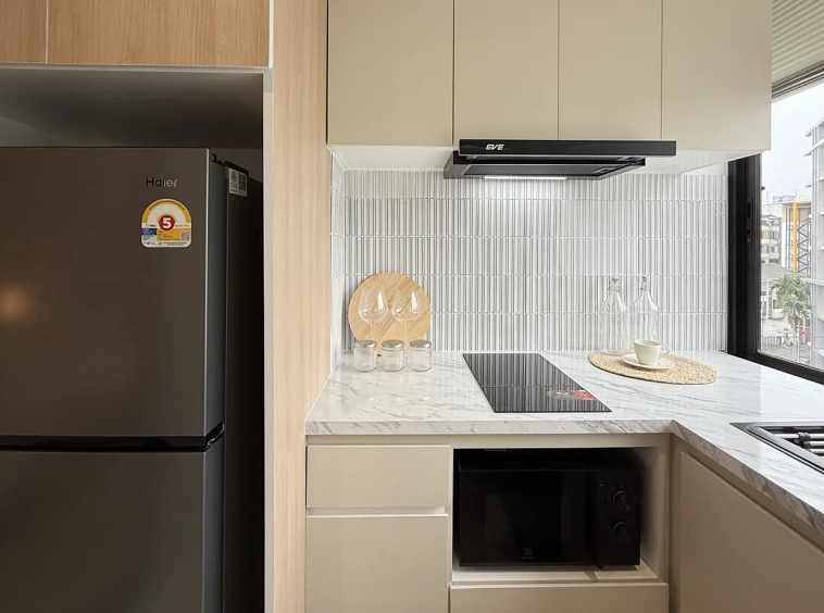 The Western-style kitchen comes with built-in cabinets at a comfortable height for European standards and includes a large window where you can enjoy both mountain and city views.