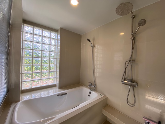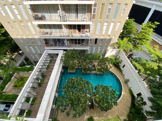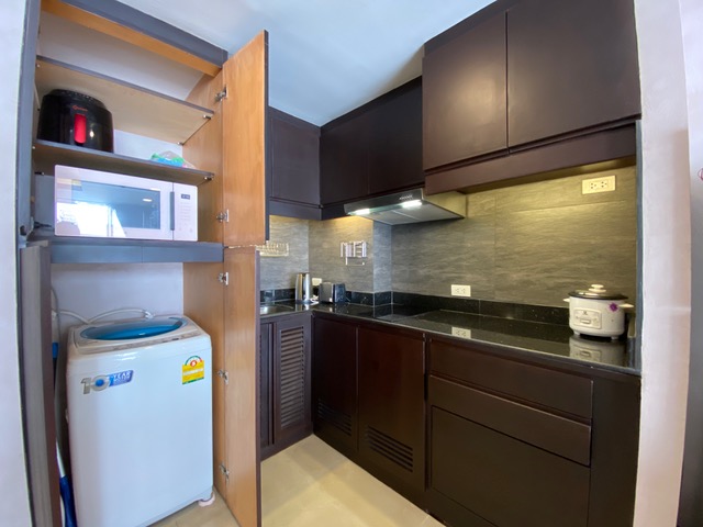 Located on the 7th floor, the unit has a fitted Western kitchen with a washing machine nicely hidden in the cupboard. The dining and sitting area is spacious, has a tall ceiling and comes with a built-in wall unit and a glass door through to the terrace which overlooks the swimming pool and the garden below as well as a green area. There is also a guest bathroom. The bedroom has a fitted closet and desk unit and is ensuite with a large bathroom equipped with a bathtub and separate shower. The bedroom also has access to the terrace.