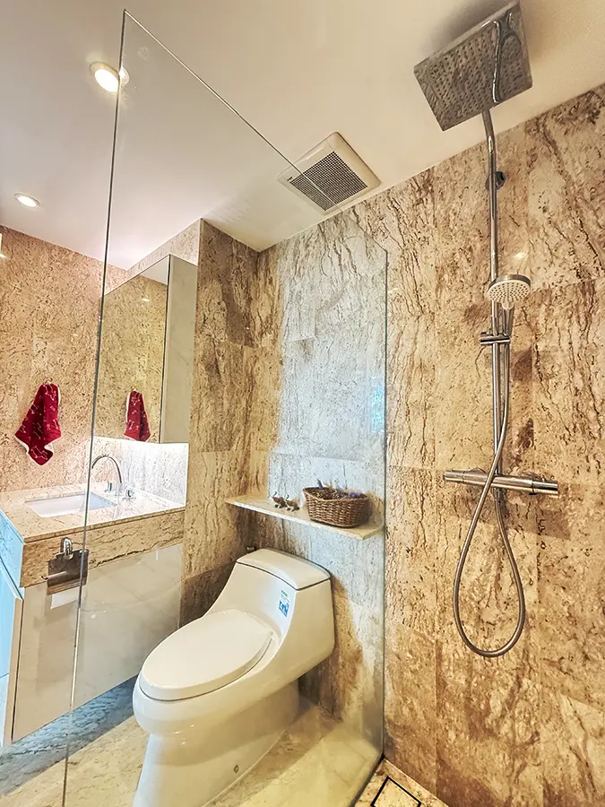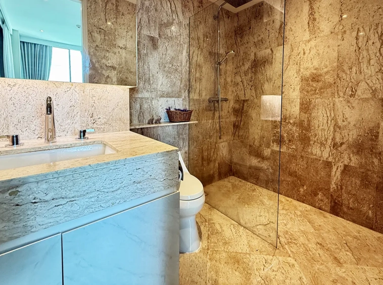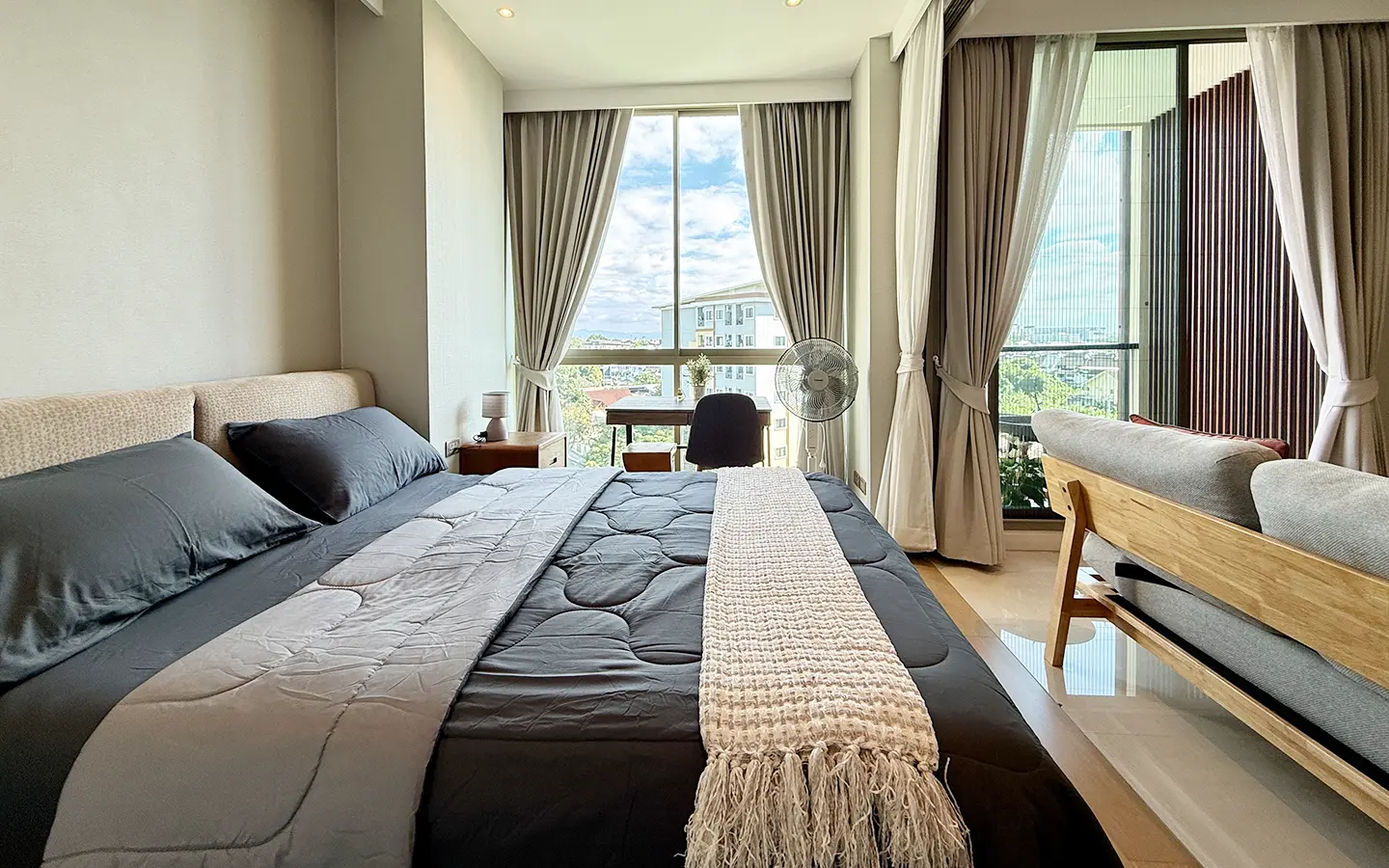 Inside the bedroom, there is a cozy corner perfect for a desk and chair, allowing you to work while enjoying views through the large windows. The room also features a built-in wardrobe and an en-suite bathroom finished with elegant marble. All furniture is included. The project is known for its premium materials, thoughtful design, and efficient layout.