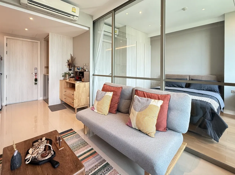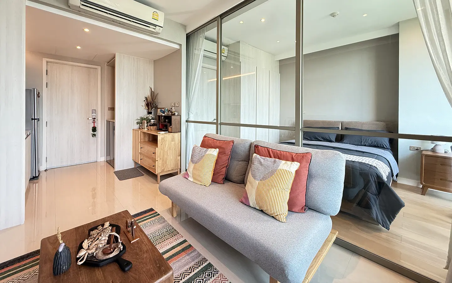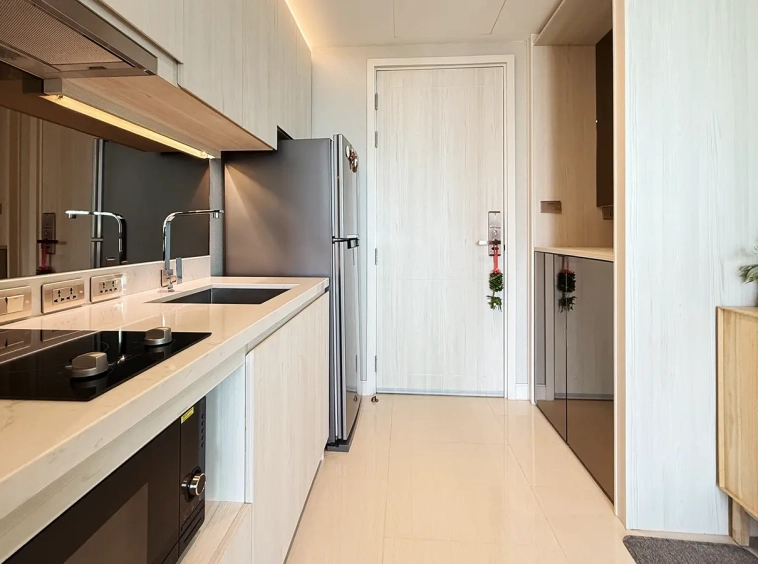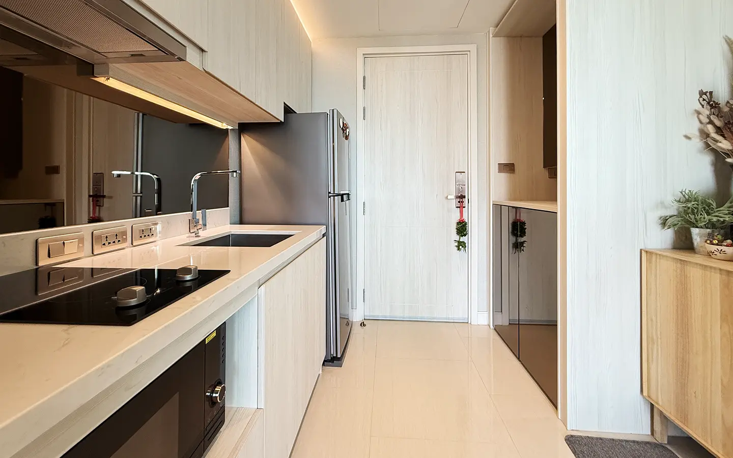 The unit is very well maintained, and the furniture is almost brand new. Upon entering, you will find a well-equipped kitchen with ample cabinet space on the right. To the left, there is a built-in shoe cabinet and a washing machine. The living area is bright and comfortable, with a sliding door separating it from the bedroom to create a sense of privacy. The balcony is accessible from the living room, offering a lovely spot to enjoy the view with a cup of coffee.