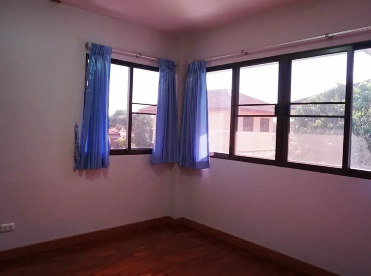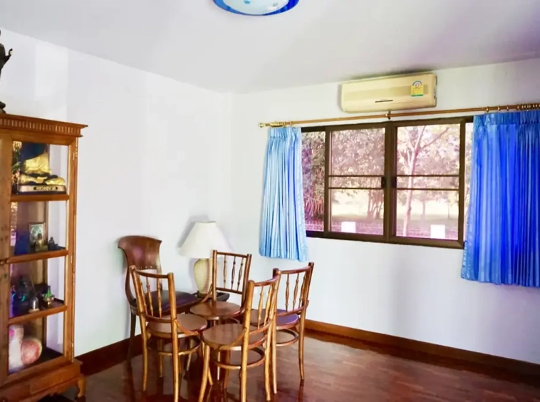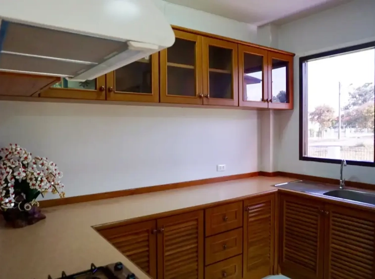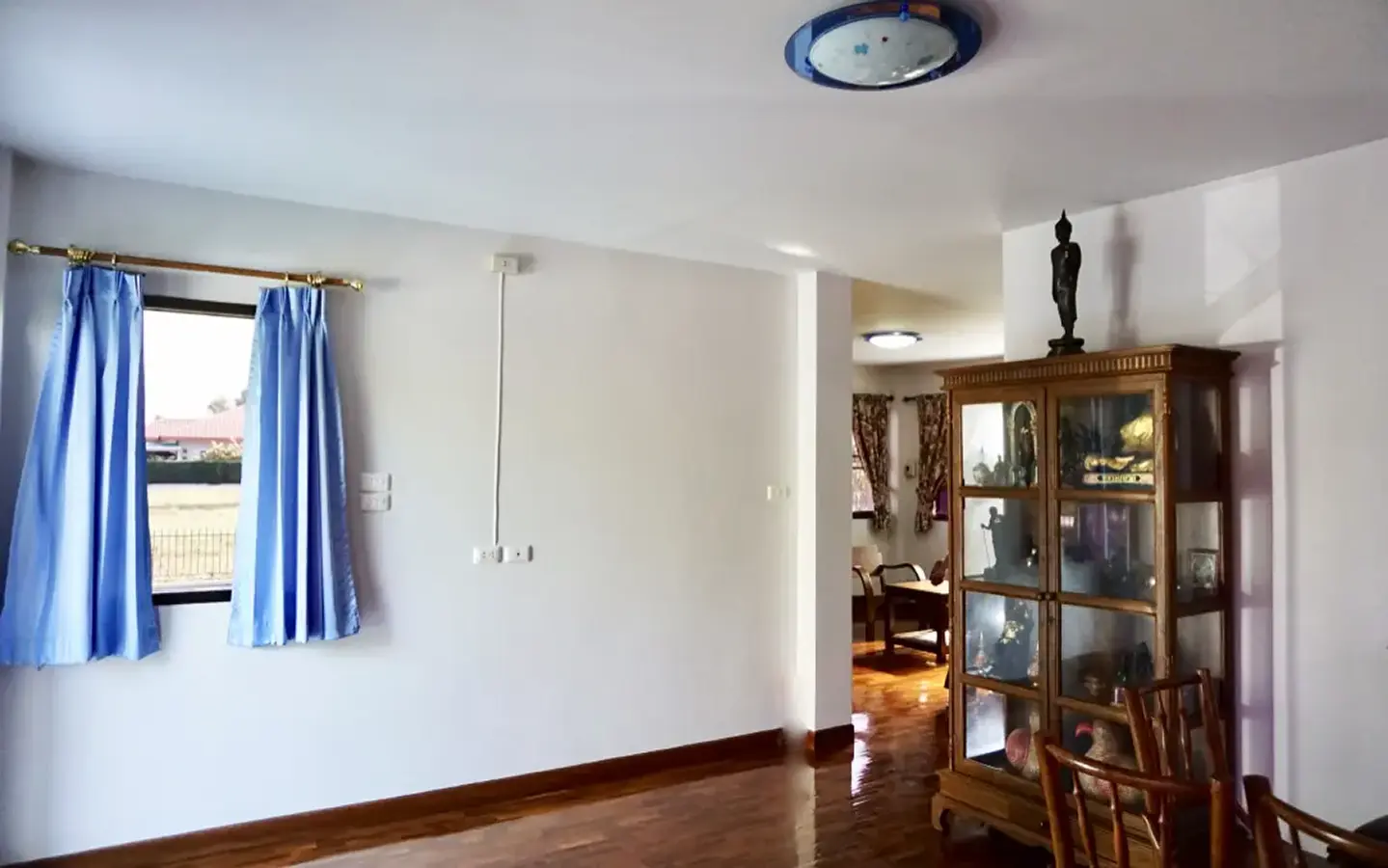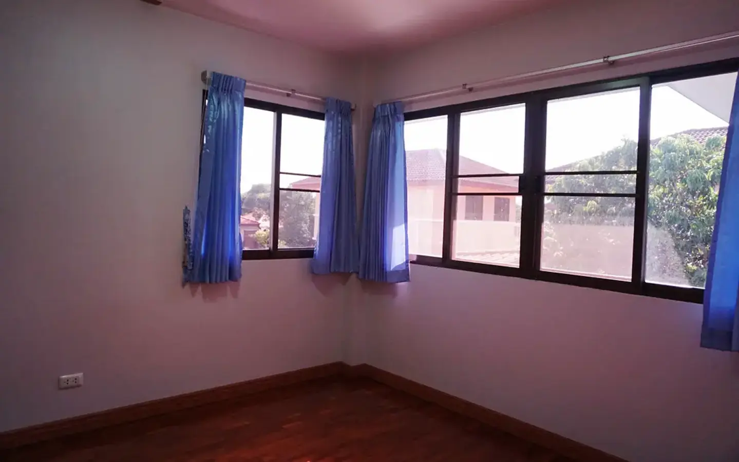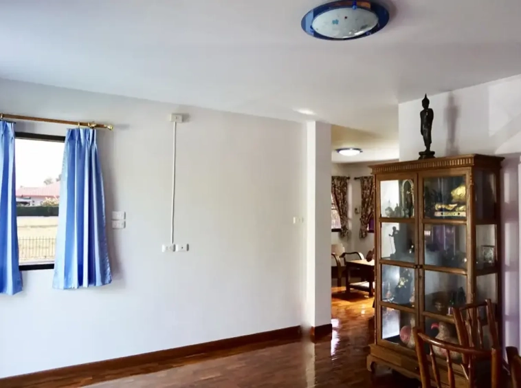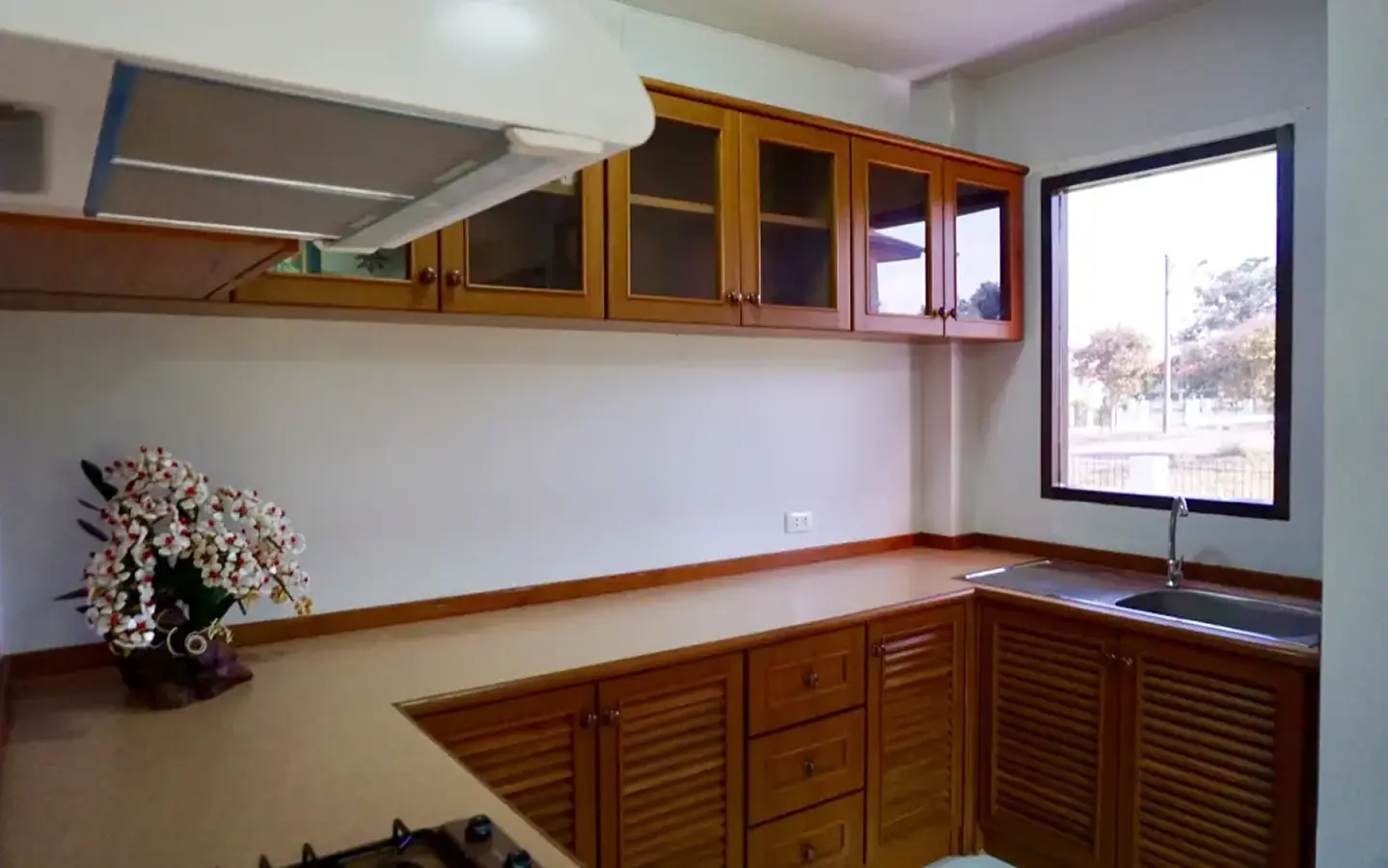 The house is on a corner unit offering beautiful large lawn garden with some trees. Inside, the floor is all polished wood parquet, the living area has some nice teak wood furniture, then the all builtin teak wood Western kitchen with access to the washing area or possible Thai kitchen at the rear. Dining area then the guest bathroom, storage room and a study that can be turned into the fourth bedroom are needed.
