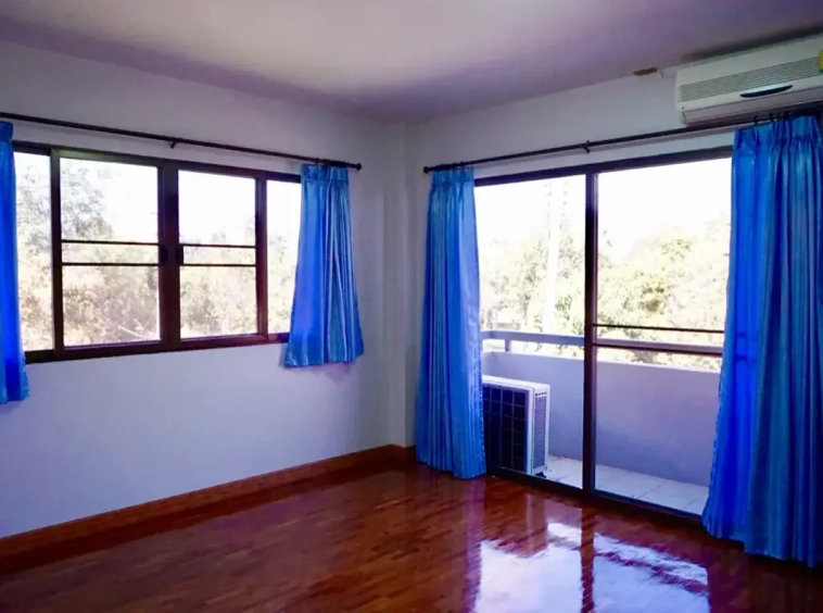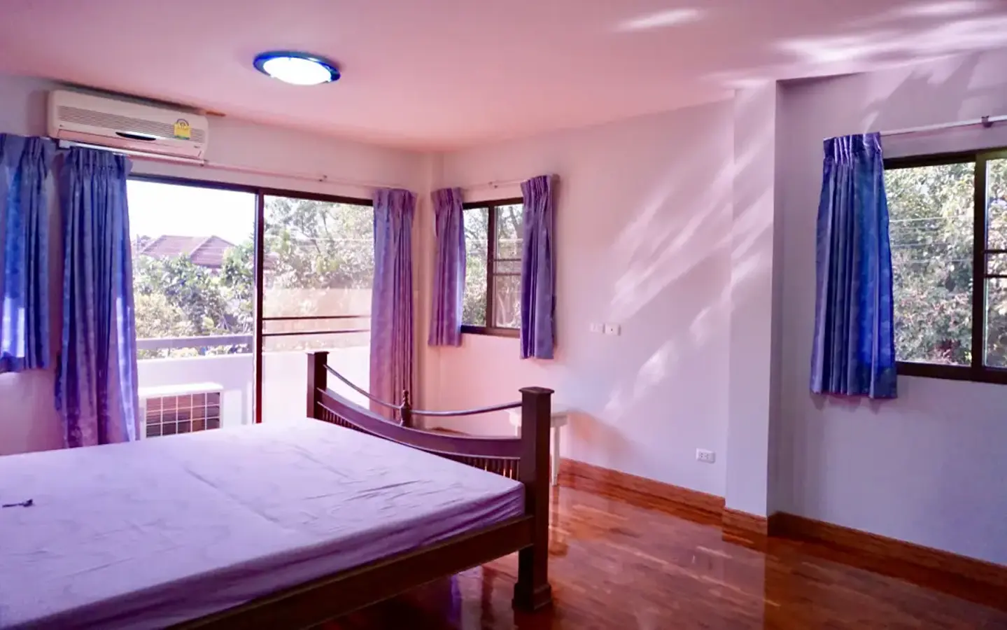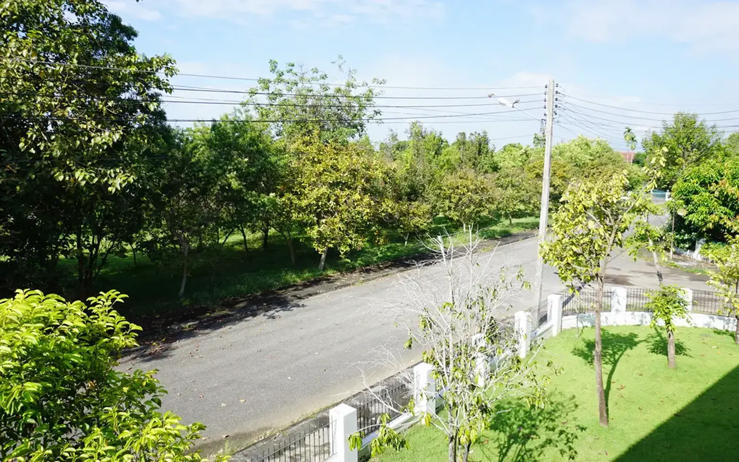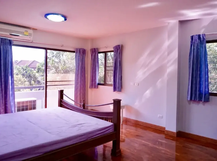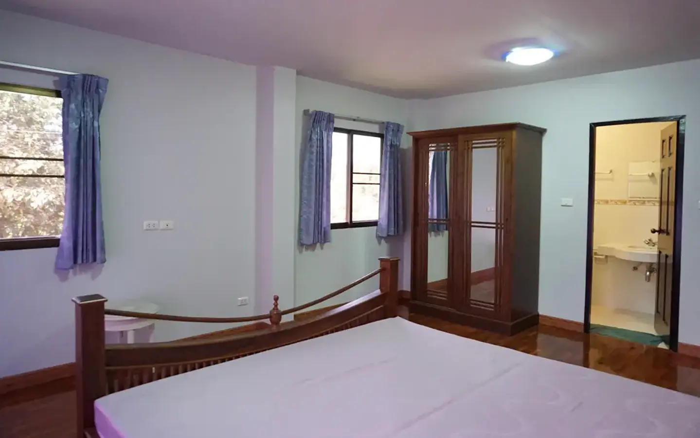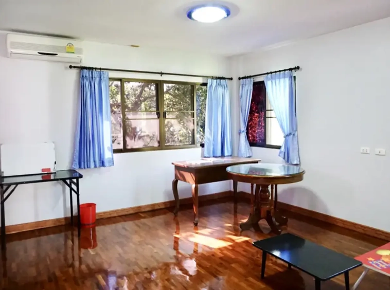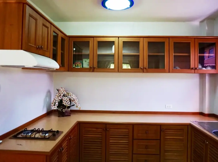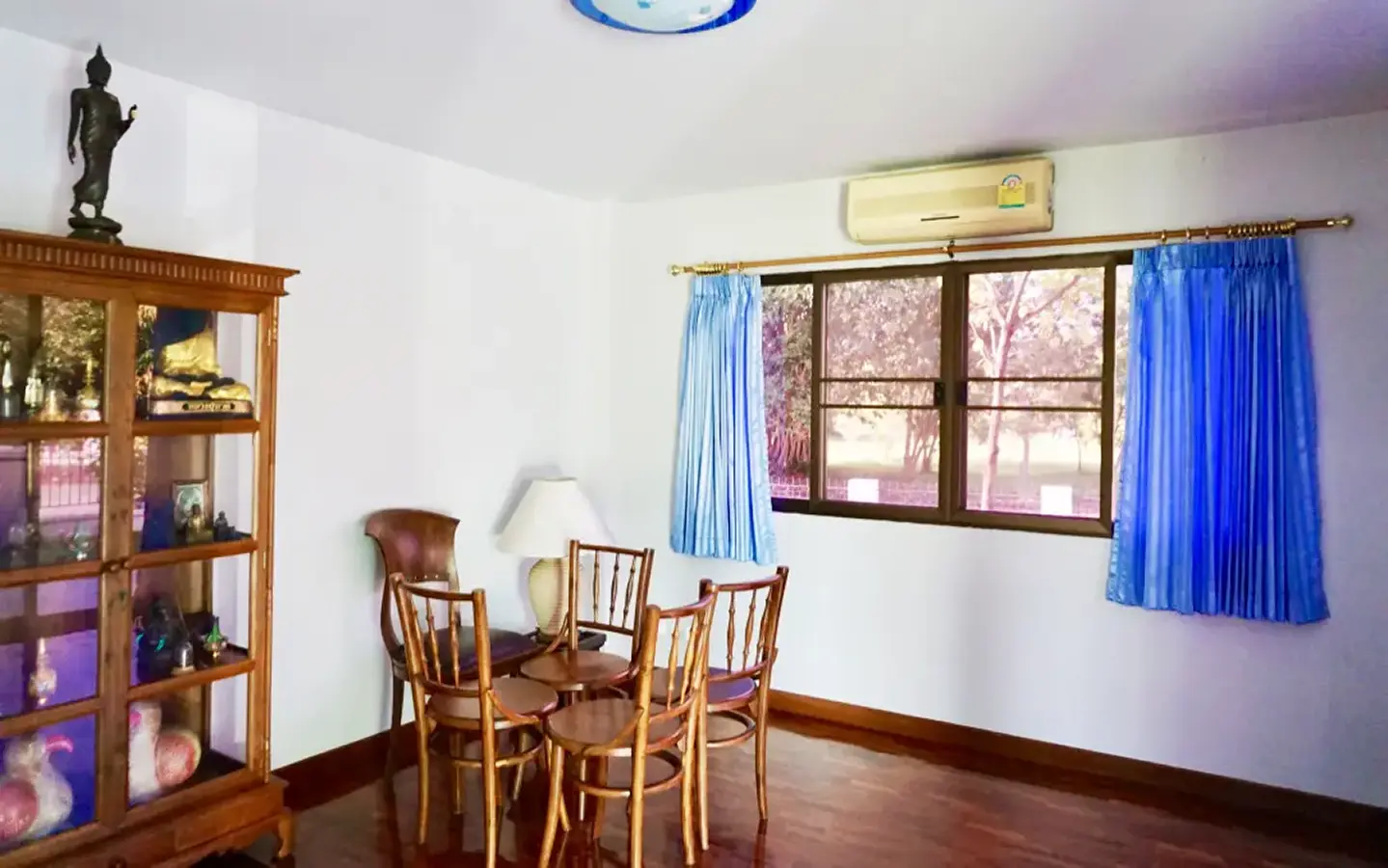 The house is on a corner unit offering beautiful large lawn garden with some trees. Inside, the floor is all polished wood parquet, the living area has some nice teak wood furniture, then the all builtin teak wood Western kitchen with access to the washing area or possible Thai kitchen at the rear. Dining area then the guest bathroom, storage room and a study that can be turned into the fourth bedroom are needed.