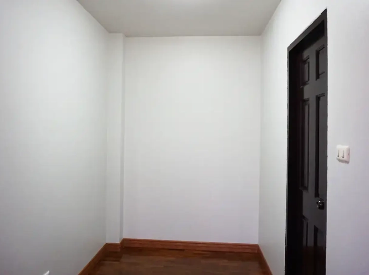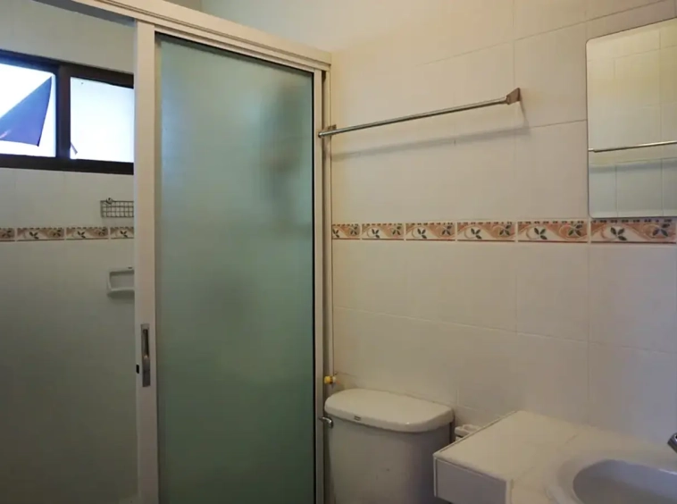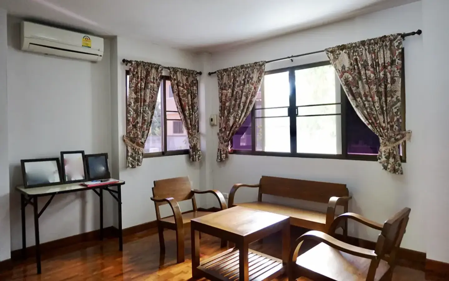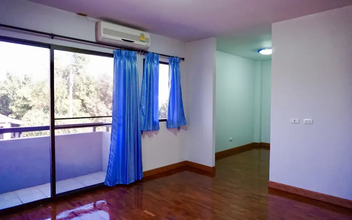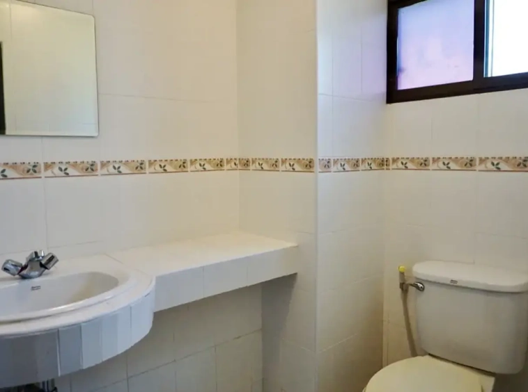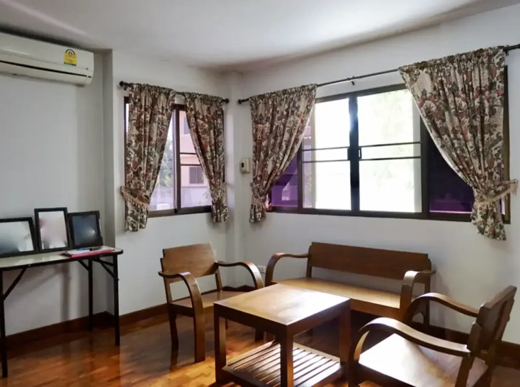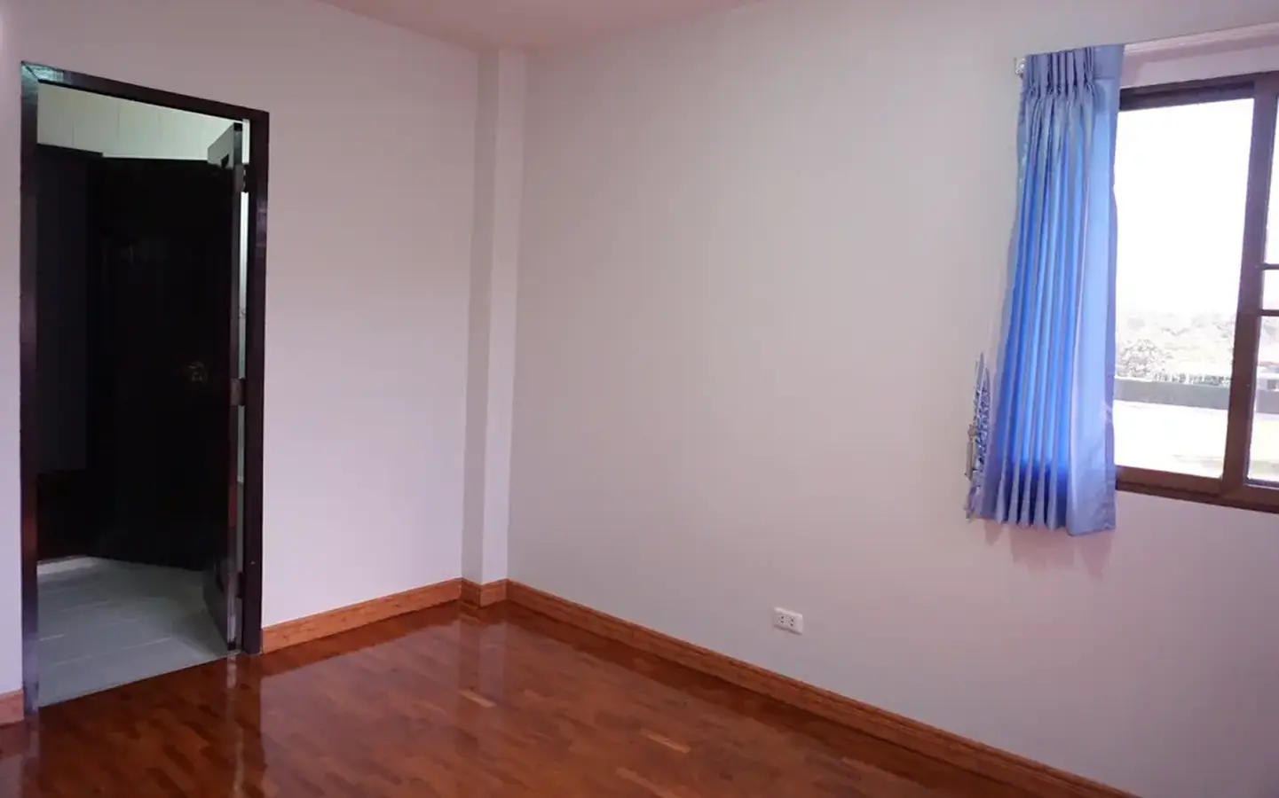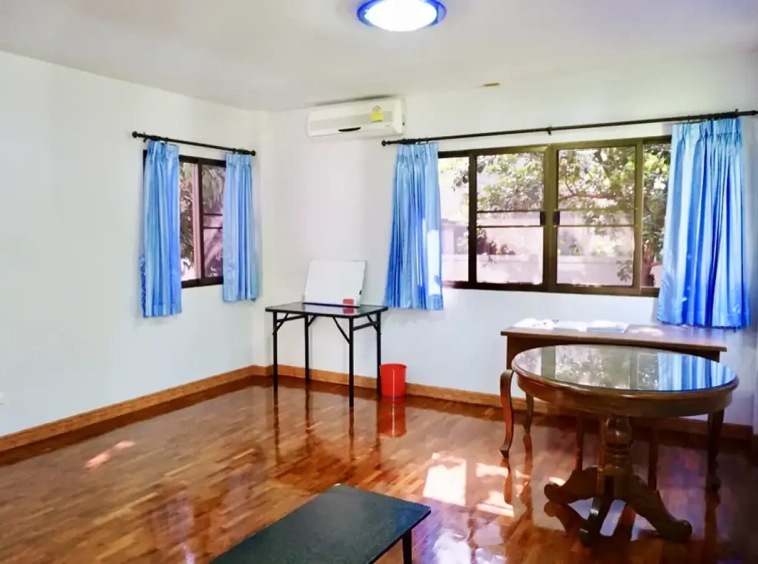 The house is on a corner unit offering beautiful large lawn garden with some trees. Inside, the floor is all polished wood parquet, the living area has some nice teak wood furniture, then the all builtin teak wood Western kitchen with access to the washing area or possible Thai kitchen at the rear. Dining area then the guest bathroom, storage room and a study that can be turned into the fourth bedroom are needed.