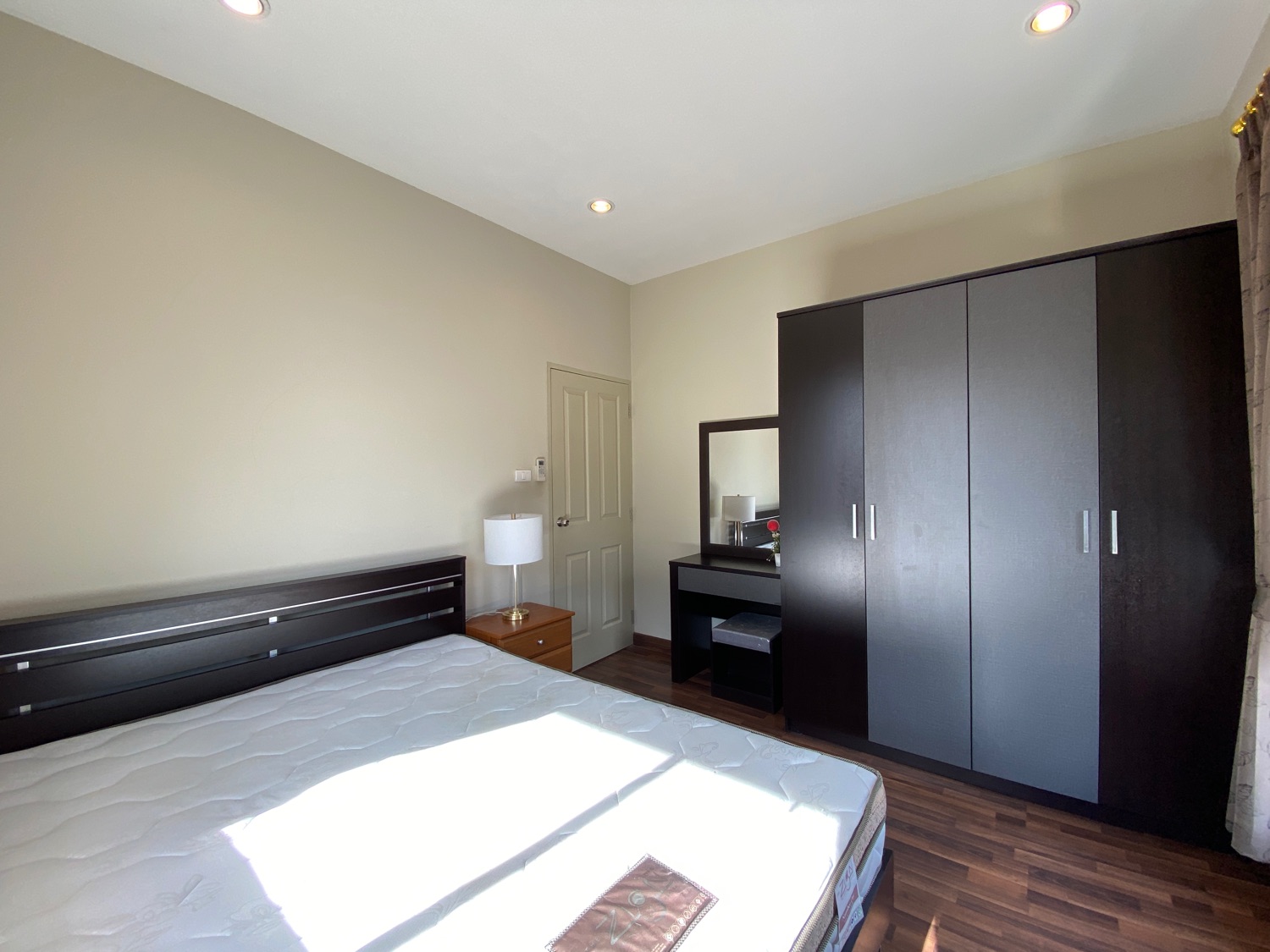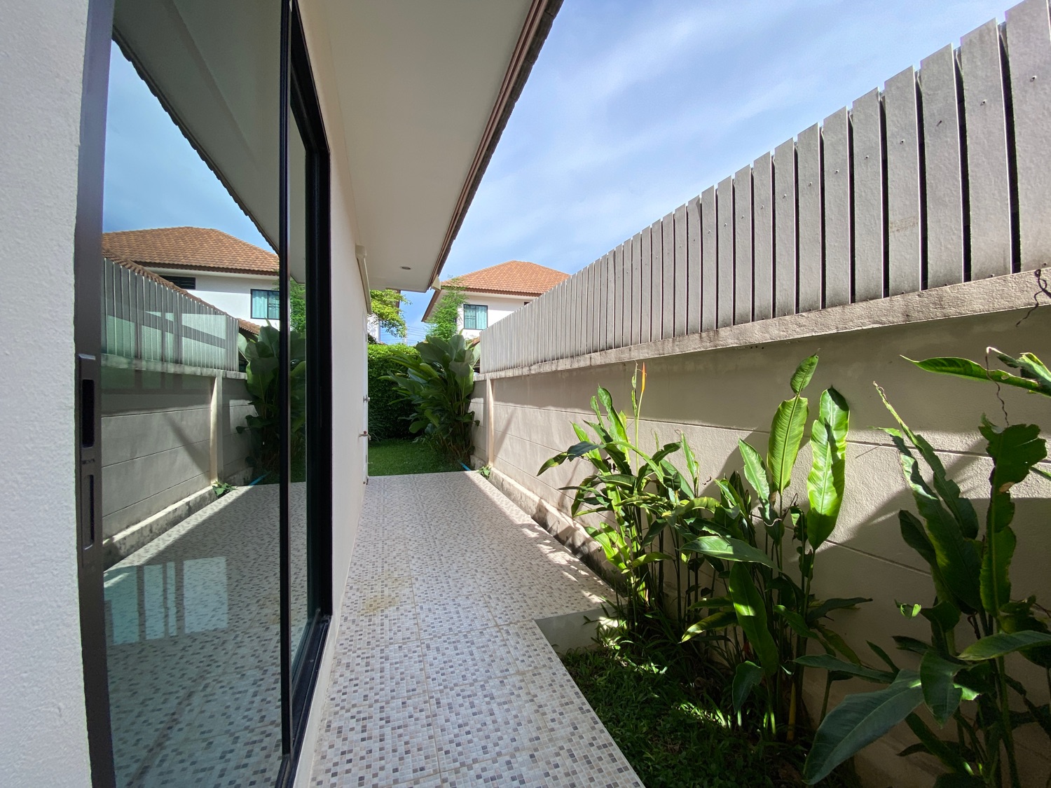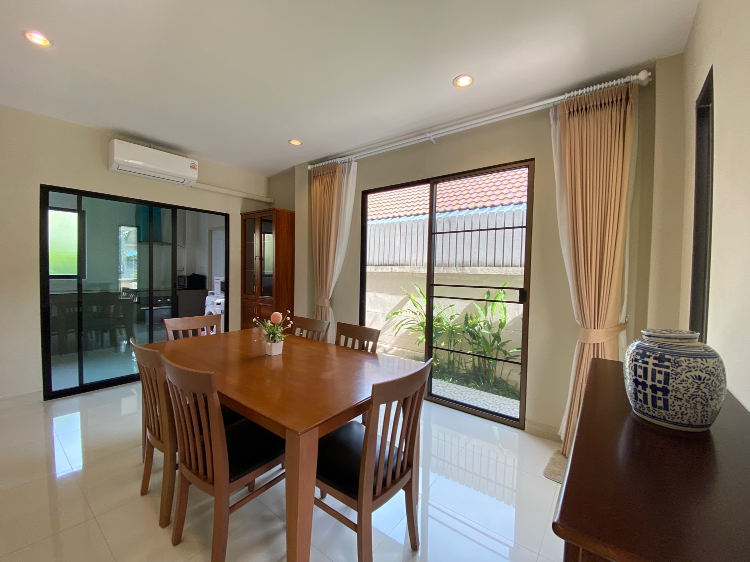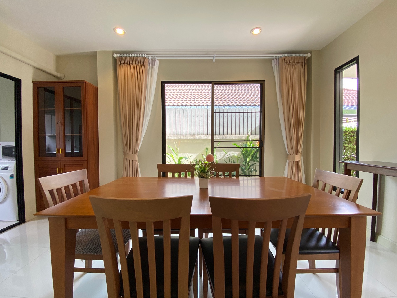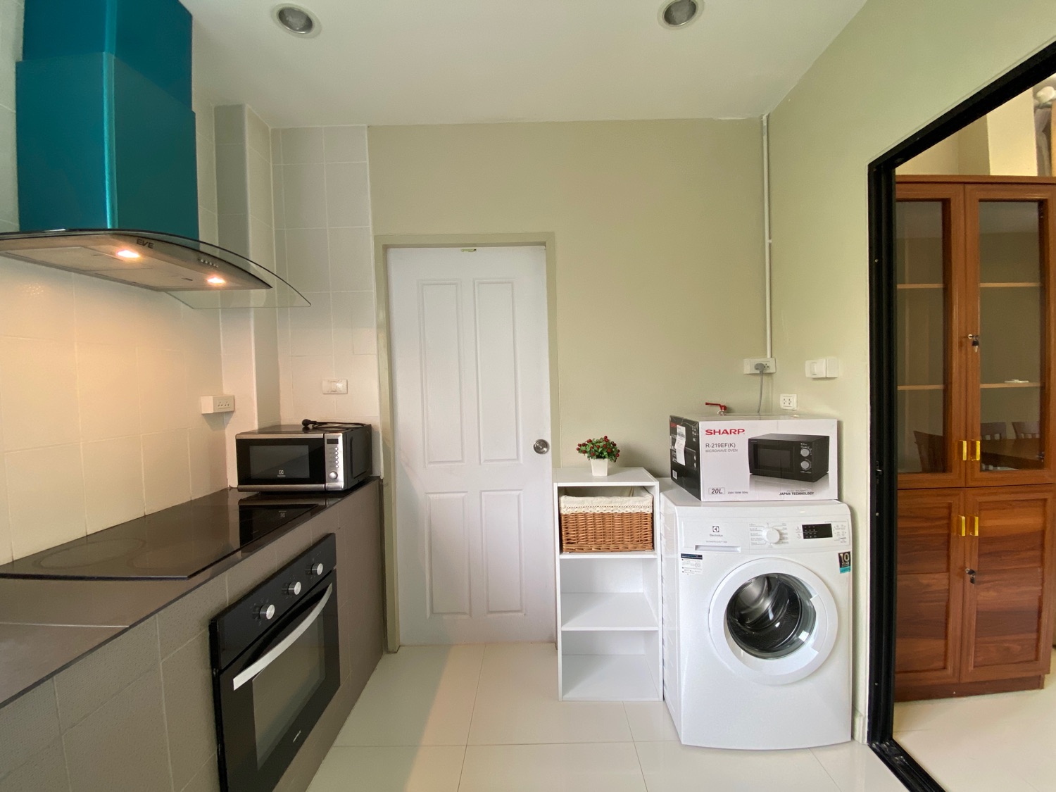 This house is located in a quiet gated project which only has 43 houses. It takes approximately 10 minutes from Central Festival Shopping Mall, Bangkok Hospital, Big C Extra Supermarket and Makro. There is a living, a guest bathroom, a dining, and a Western kitchen which has a brand-new oven, refrigerator, microwave and washing machine. There is access to the balcony and has seating area to enjoy an outdoor space. The second floor - there are 3 bedrooms, a master bedroom comes with an en-suite bathroom and another 2 bedrooms with a shared bathroom. This house is a good condition, rather new and good layout. It is airy and has a lot of natural light. The garden has a good space and is easy to take care of. There is one covered car park and there is a storage space outside by the car park. This project offers 24-hour security, a common swimming pool and a gym.