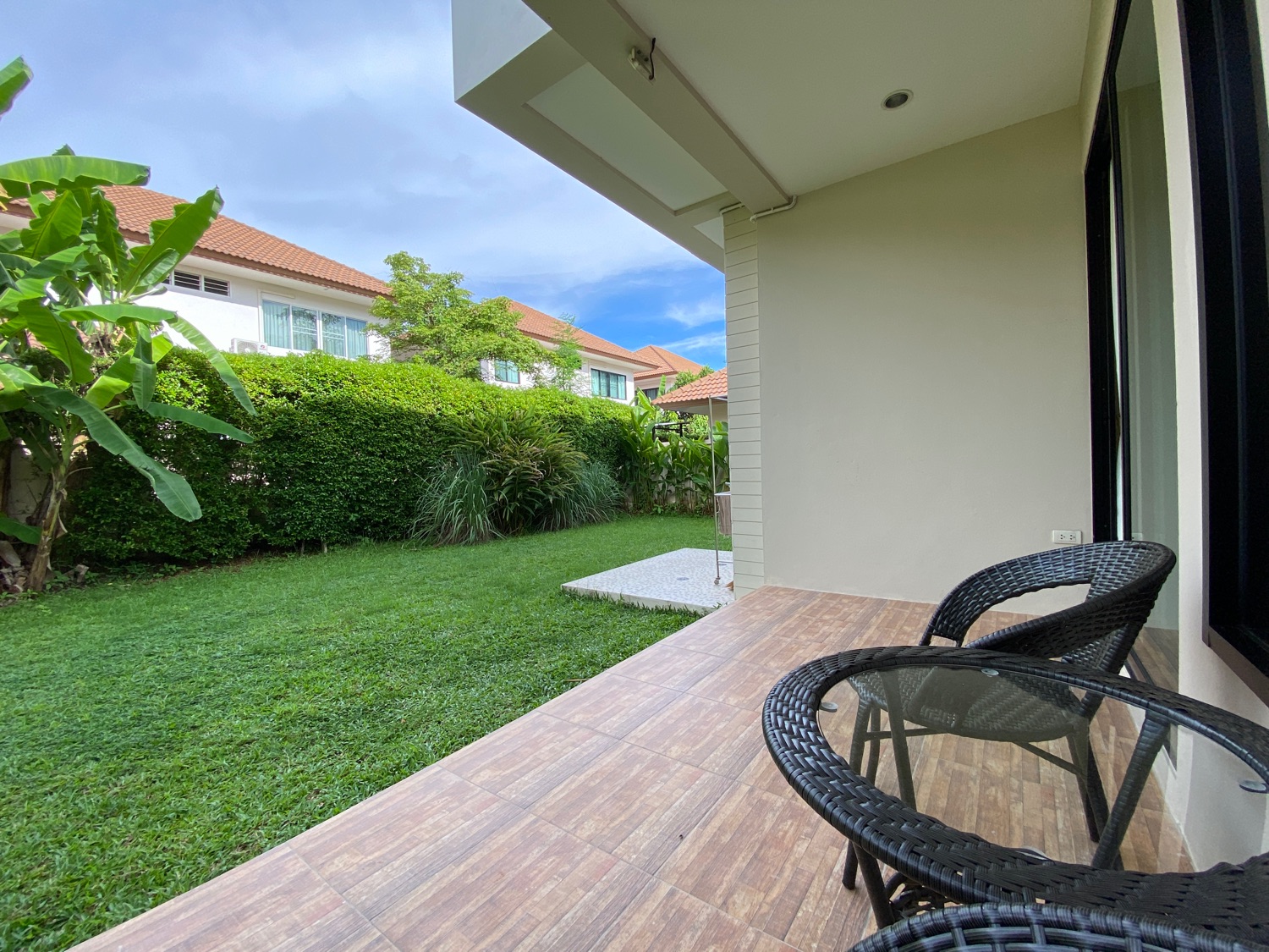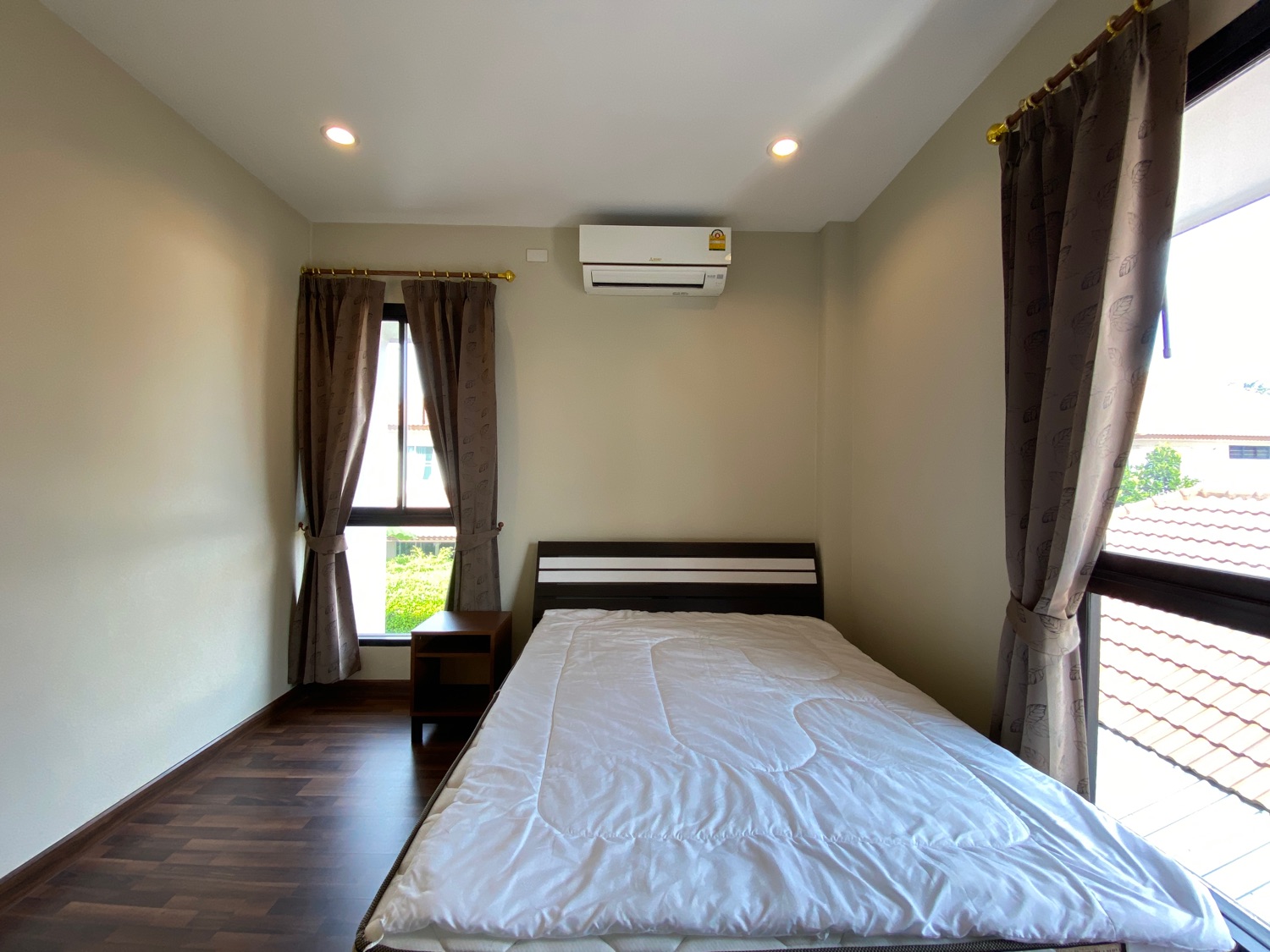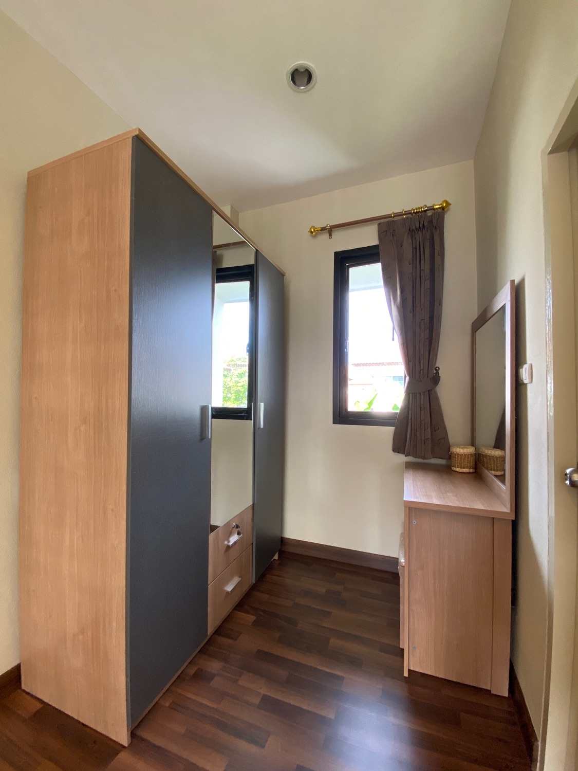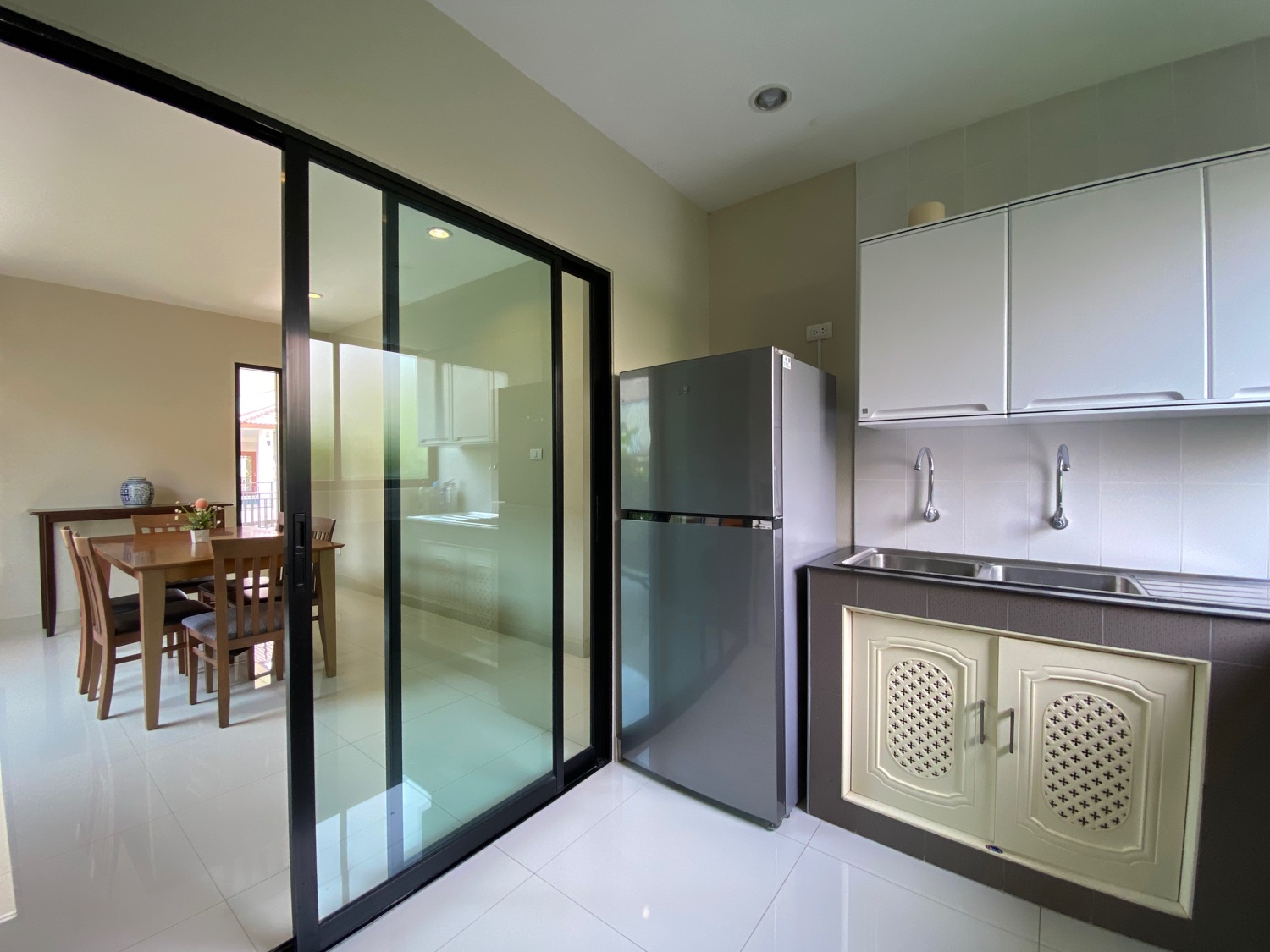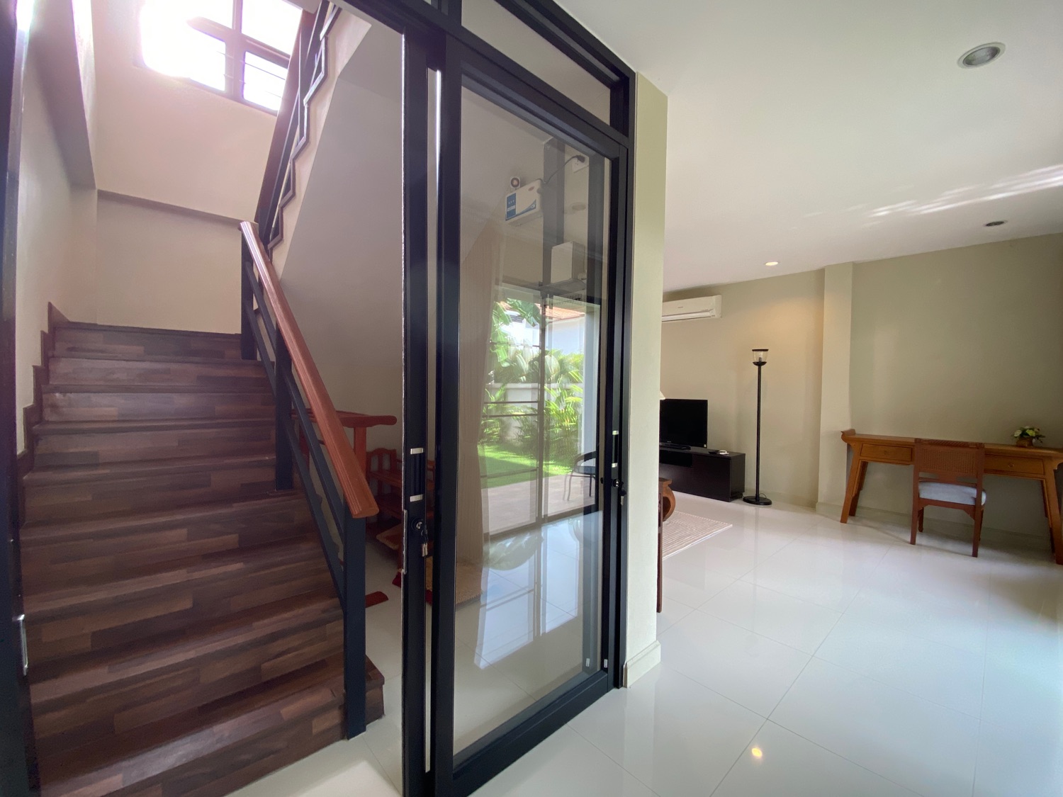 This house is located in a quiet gated project which only has 43 houses. It takes approximately 10 minutes from Central Festival Shopping Mall, Bangkok Hospital, Big C Extra Supermarket and Makro. There is a living, a guest bathroom, a dining, and a Western kitchen which has a brand-new oven, refrigerator, microwave and washing machine. There is access to the balcony and has seating area to enjoy an outdoor space. The second floor - there are 3 bedrooms, a master bedroom comes with an en-suite bathroom and another 2 bedrooms with a shared bathroom. This house is a good condition, rather new and good layout. It is airy and has a lot of natural light. The garden has a good space and is easy to take care of. There is one covered car park and there is a storage space outside by the car park. This project offers 24-hour security, a common swimming pool and a gym.