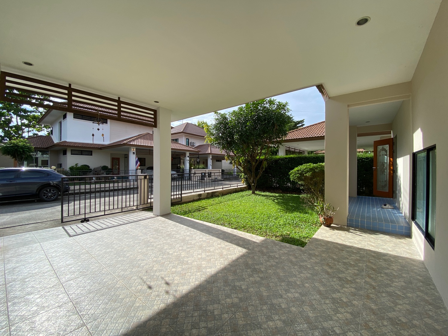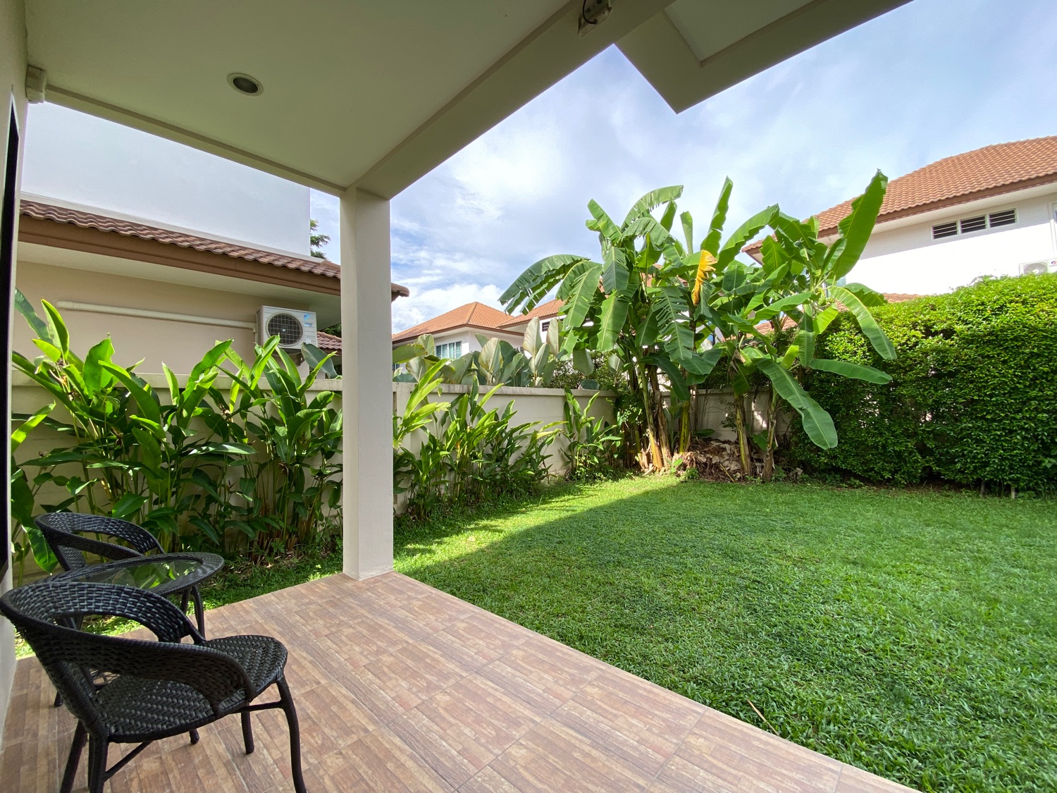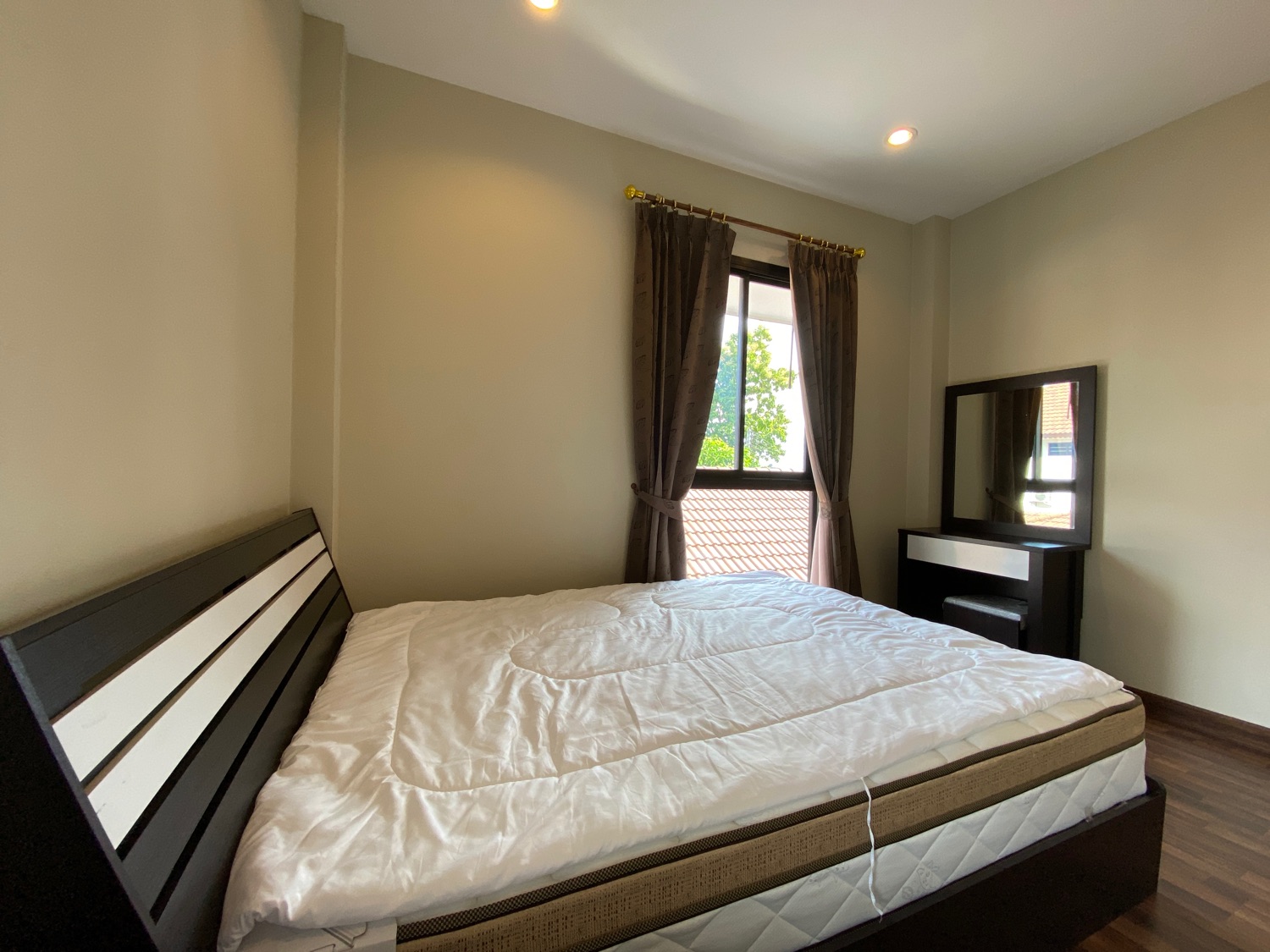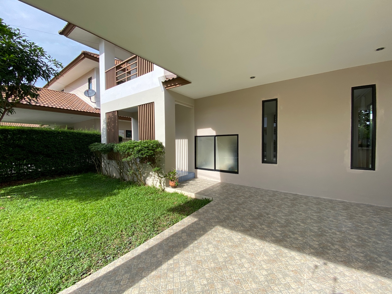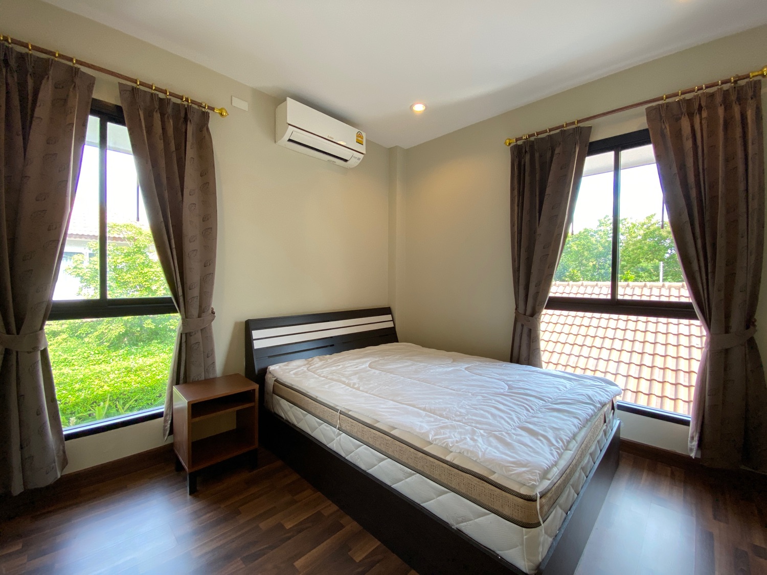 This house is located in a quiet gated project which only has 43 houses. It takes approximately 10 minutes from Central Festival Shopping Mall, Bangkok Hospital, Big C Extra Supermarket and Makro. There is a living, a guest bathroom, a dining, and a Western kitchen which has a brand-new oven, refrigerator, microwave and washing machine. There is access to the balcony and has seating area to enjoy an outdoor space. The second floor - there are 3 bedrooms, a master bedroom comes with an en-suite bathroom and another 2 bedrooms with a shared bathroom. This house is a good condition, rather new and good layout. It is airy and has a lot of natural light. The garden has a good space and is easy to take care of. There is one covered car park and there is a storage space outside by the car park. This project offers 24-hour security, a common swimming pool and a gym.