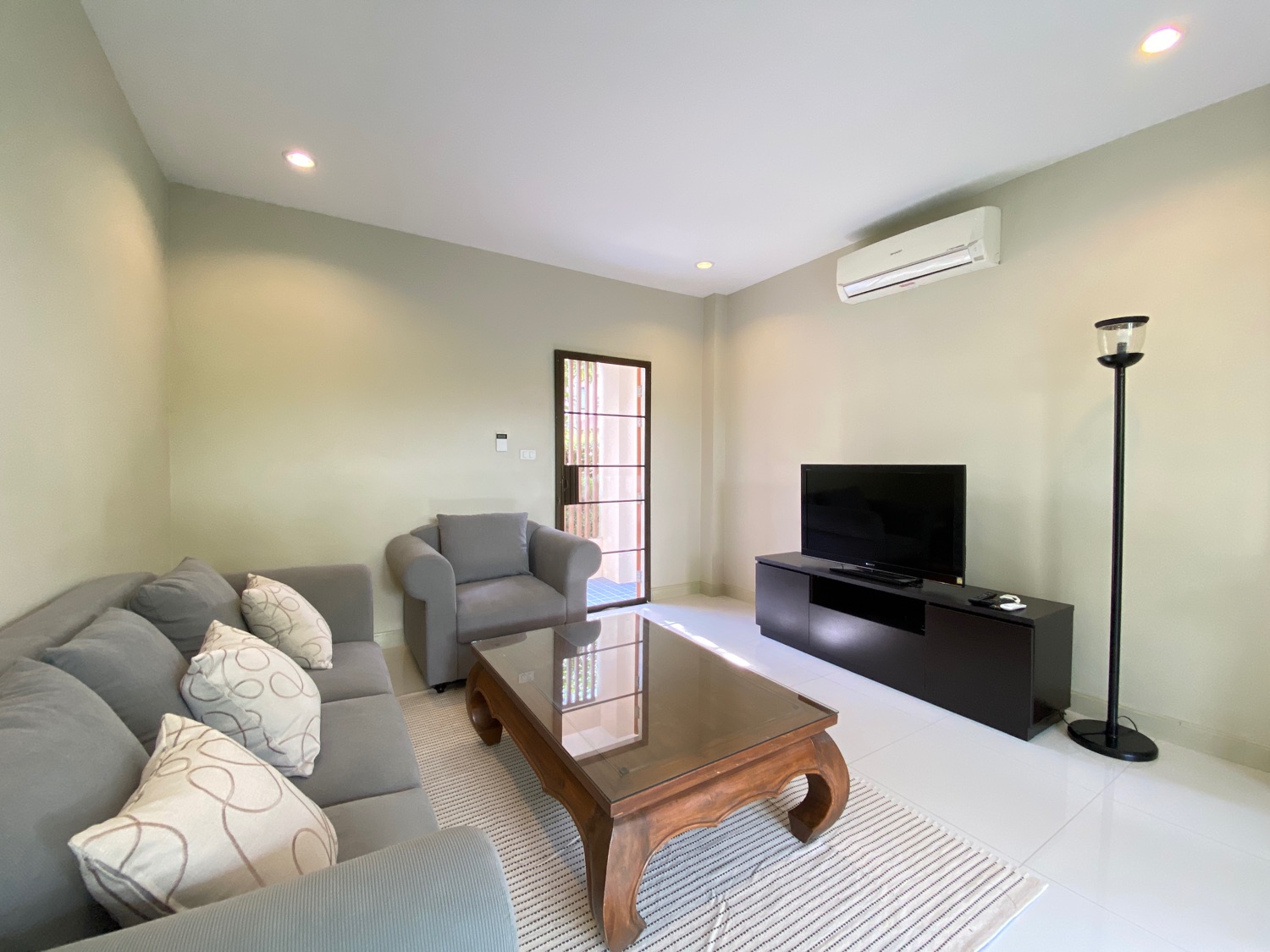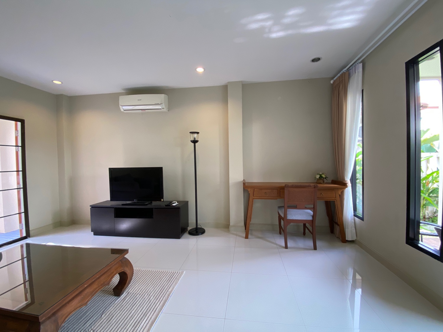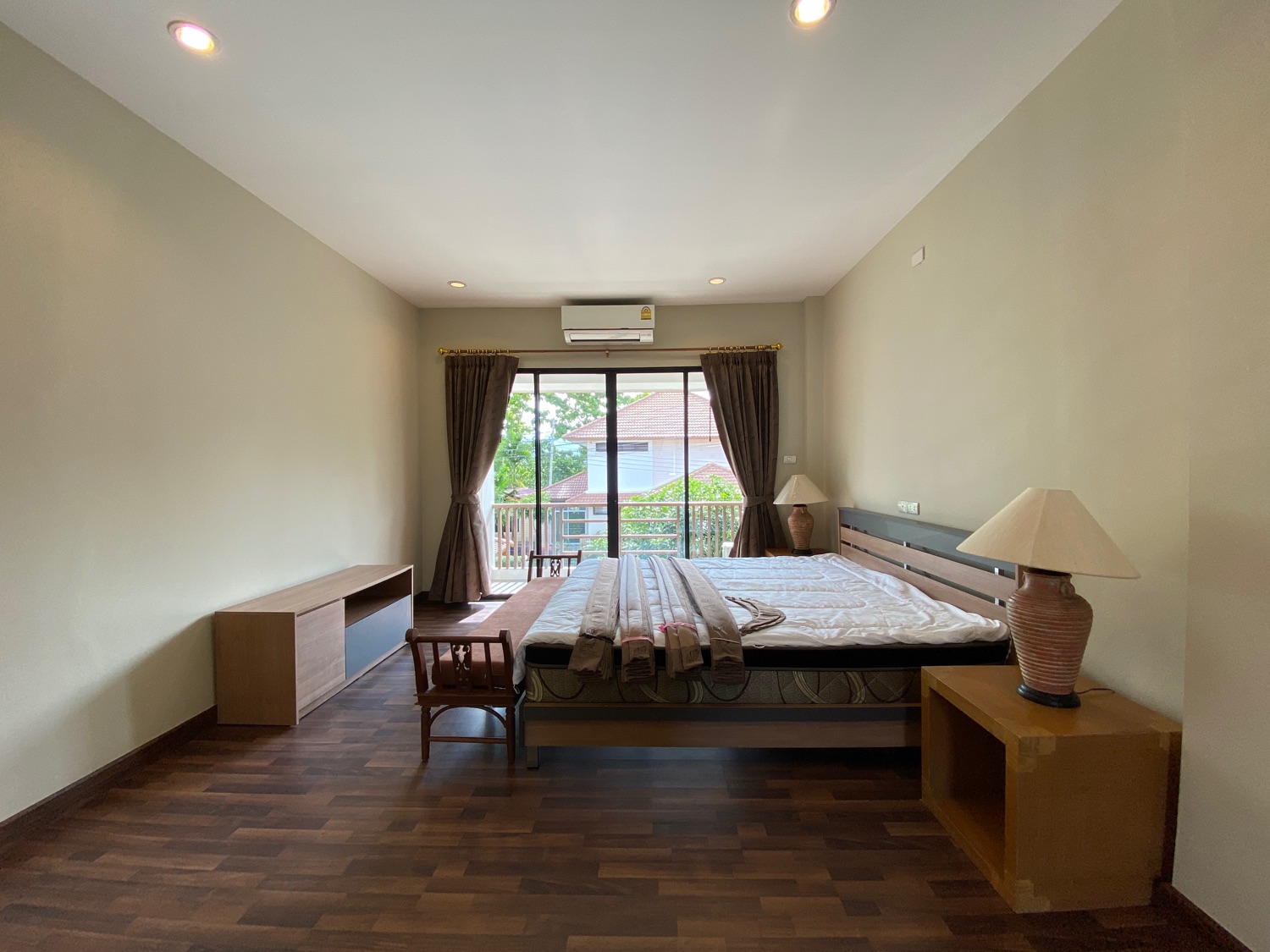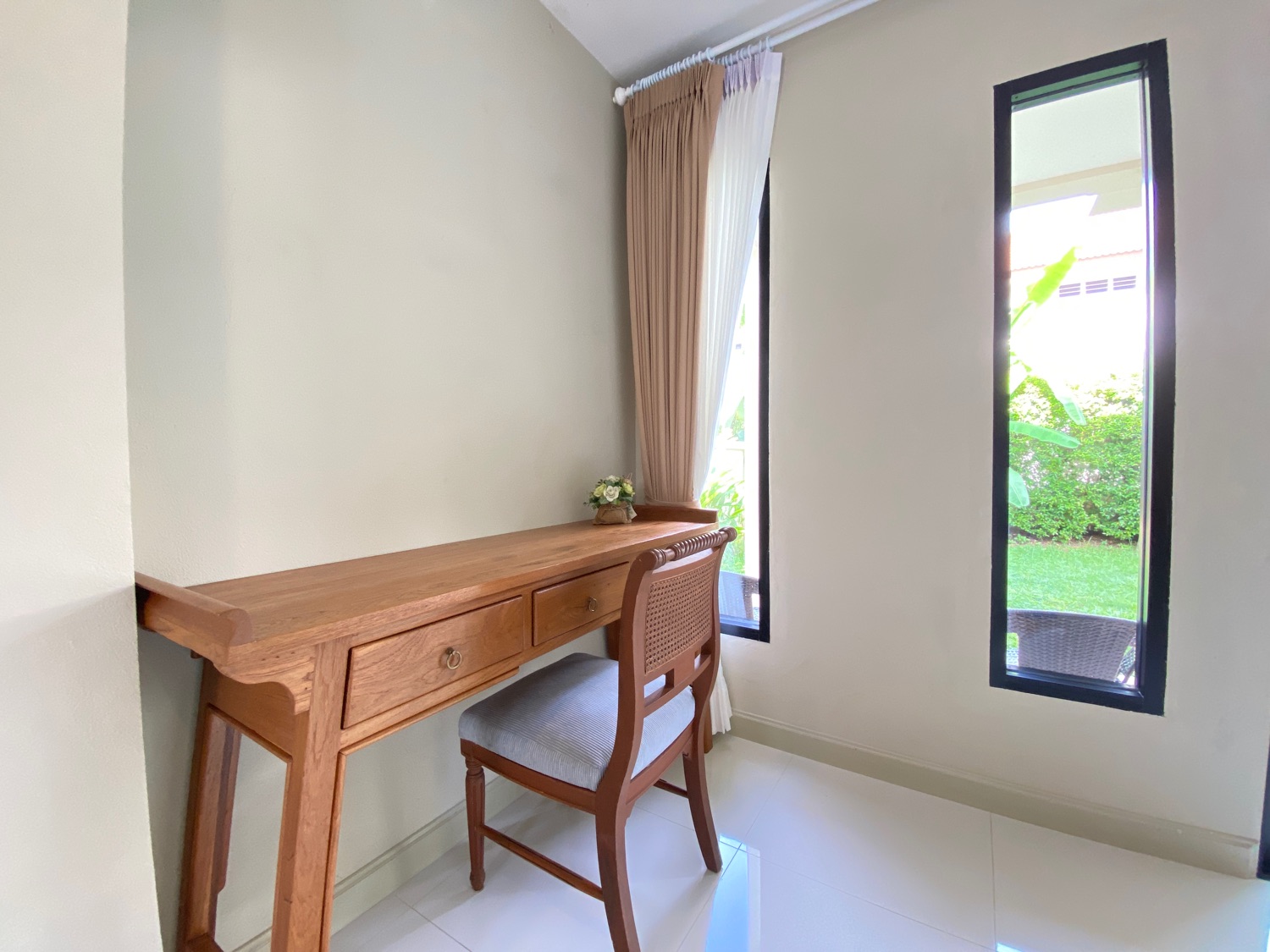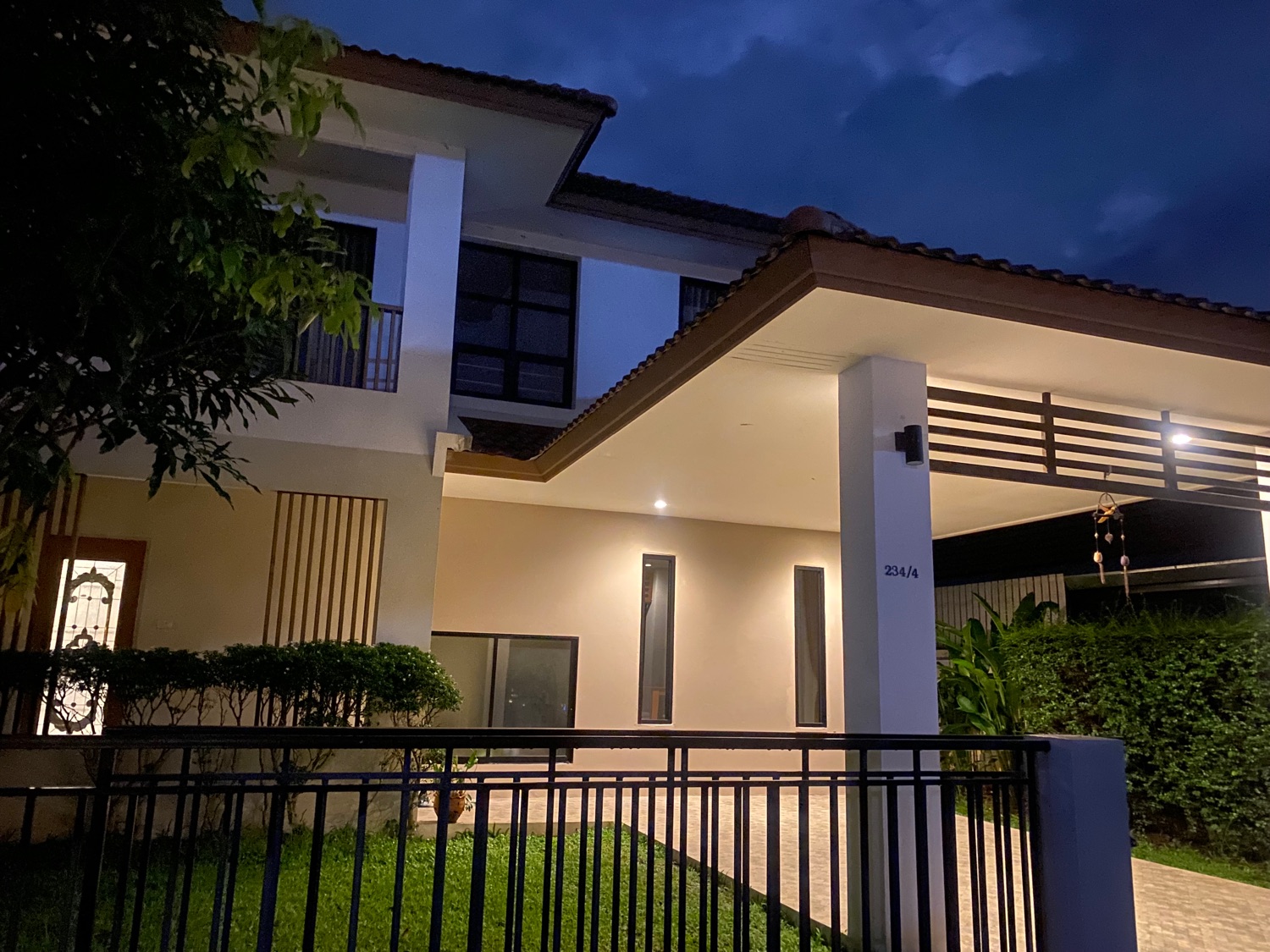 This house is located in a quiet gated project which only has 43 houses. It takes approximately 10 minutes from Central Festival Shopping Mall, Bangkok Hospital, Big C Extra Supermarket and Makro. There is a living, a guest bathroom, a dining, and a Western kitchen which has a brand-new oven, refrigerator, microwave and washing machine. There is access to the balcony and has seating area to enjoy an outdoor space. The second floor - there are 3 bedrooms, a master bedroom comes with an en-suite bathroom and another 2 bedrooms with a shared bathroom. This house is a good condition, rather new and good layout. It is airy and has a lot of natural light. The garden has a good space and is easy to take care of. There is one covered car park and there is a storage space outside by the car park. This project offers 24-hour security, a common swimming pool and a gym.