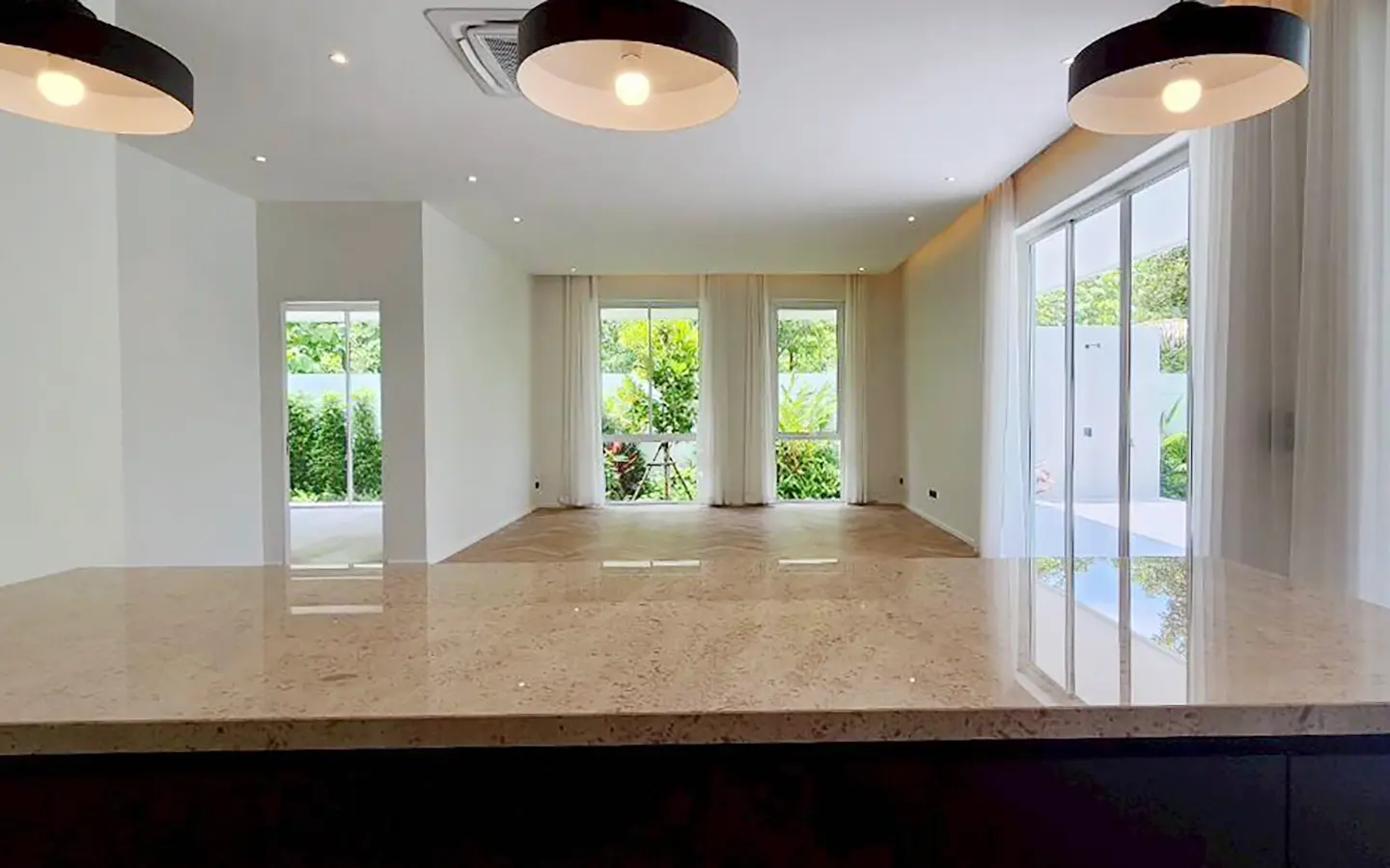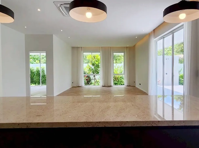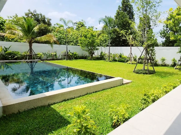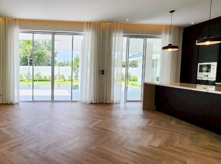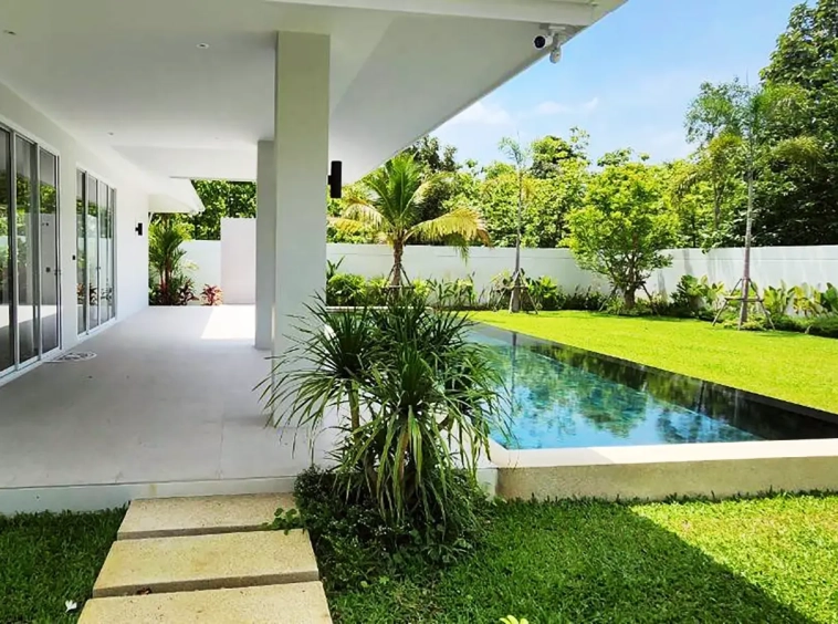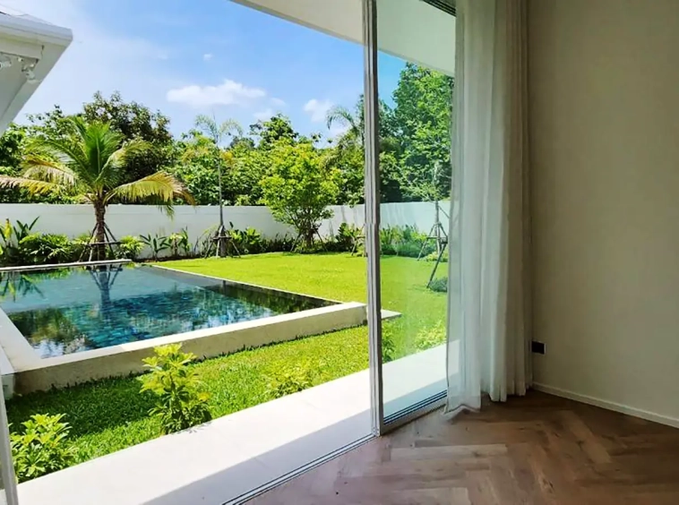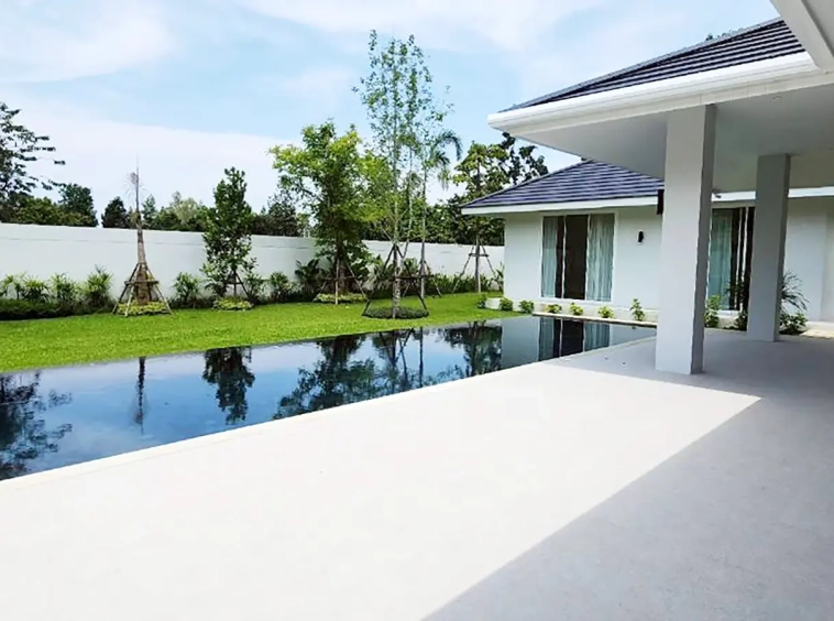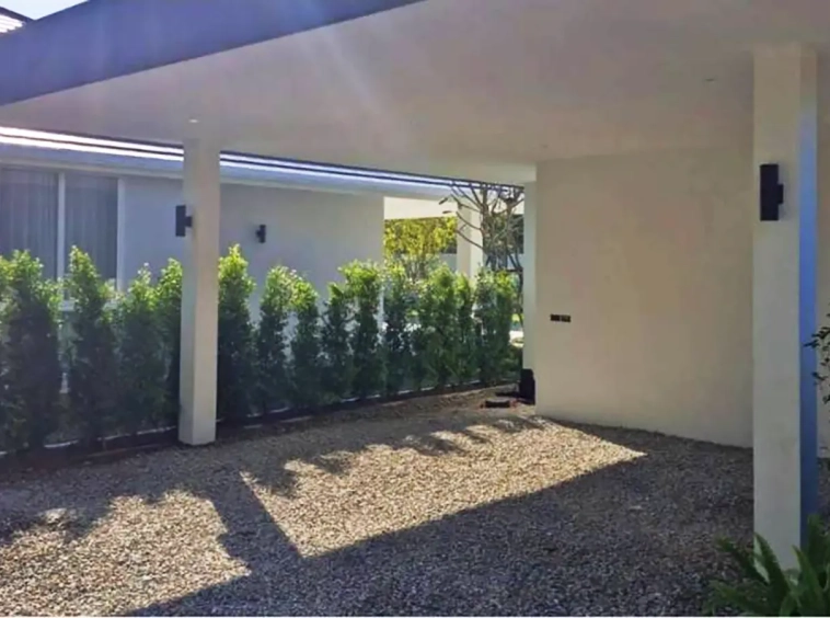 Stunning 5-bedroom, 3-bathroom pool villa just entered the market and will not be available for long. The villa is situated in a tranquil and affluent neighbourhood in Namprae, Hang Dong, near some of the best international schools in Chiang Mai. The Residence is situated on almost 1,000 sqm of land, which is secured by a perimeter wall, an electric gate, and a CCTV system. The floor space was deliberately spread across 3 structures, whereas the master bedroom ensuite and 2 kids’ bedrooms with aare located in the main house, where a large living room and high-end kitchen form the centre guest bathroom living piece. The 2nd structure is the pool house which can serve various purposes depending on your needs, it could become the 4th and 5th bedroom, or two home offices or a combination thereof. Could also be used as a guest bedroom with living area, a granny flat, or a gym. The pool house also boasts a small yet fully functional bathroom. The carport forms the 3rd structure on the property and can hold 2 large-sized cars and conveniently has a storage/laundry room included.