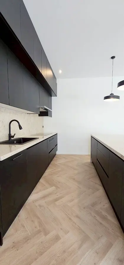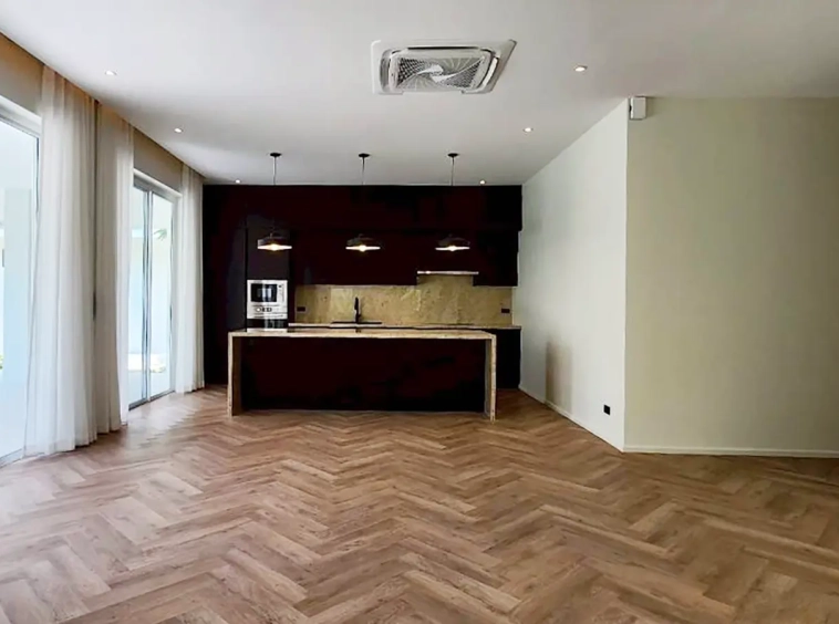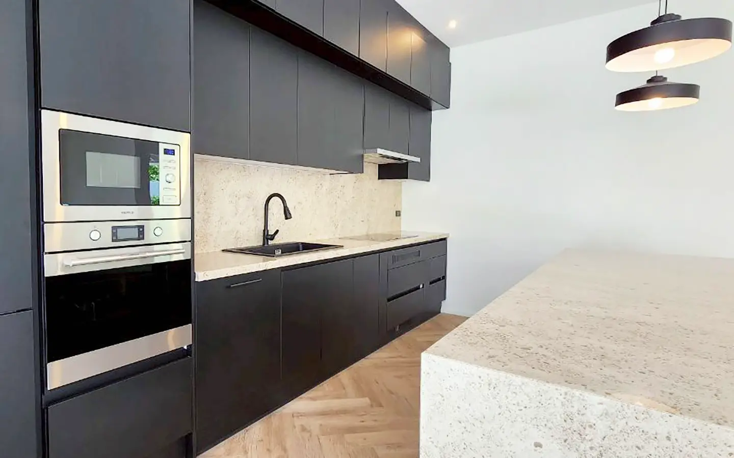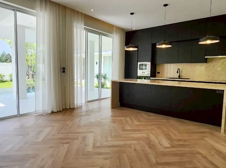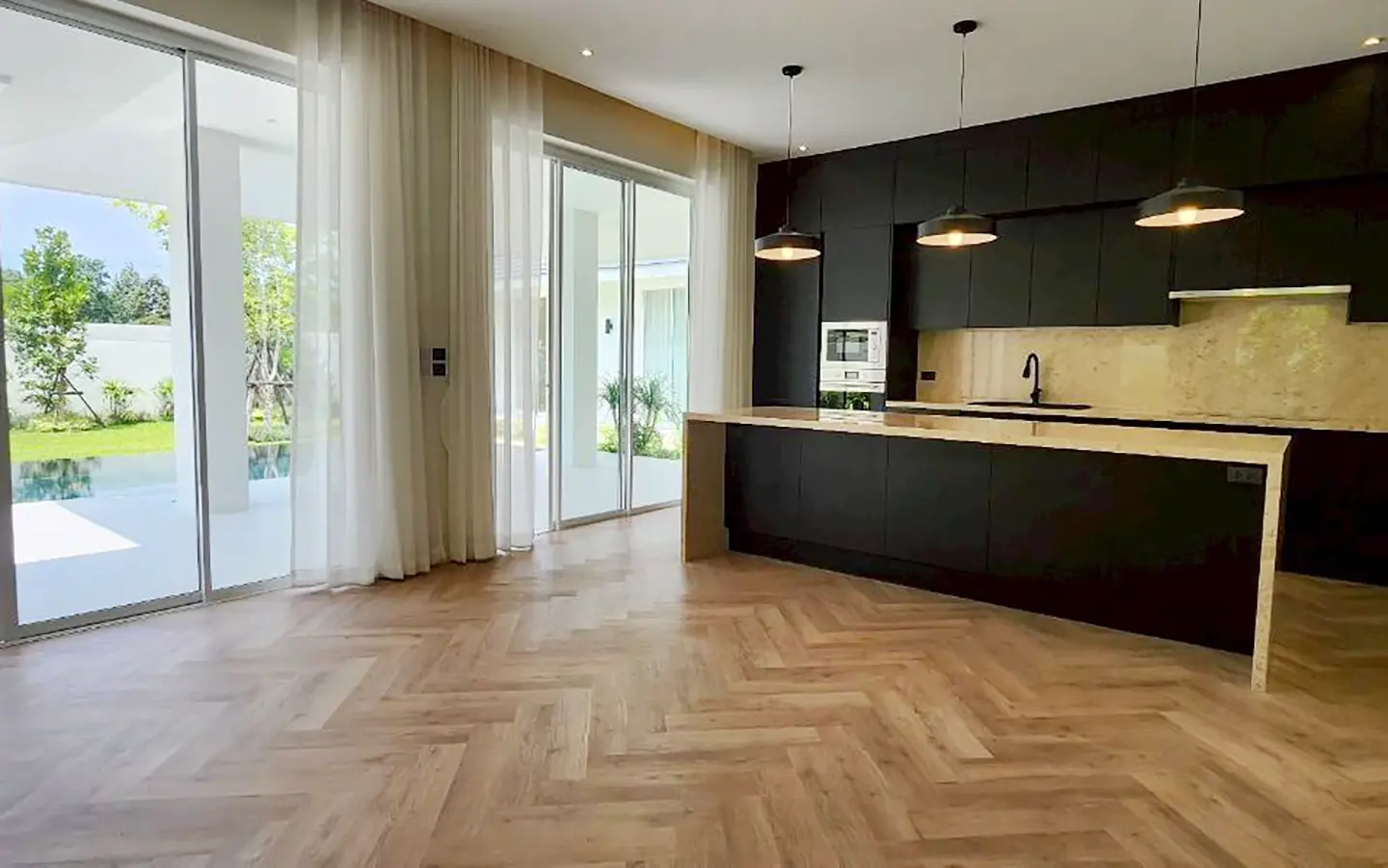 The entire living space indoors boasts a modern, high quality SPC flooring in fishbone wood design. The kitchen is state of the art with high-end finishes and appliances. Cabinets are in mat black with Italian marble countertop and backsplash. Kitchen appliances include a built-in fridge, freezer, dishwasher, oven, microwave, hood and oversized induction stove.