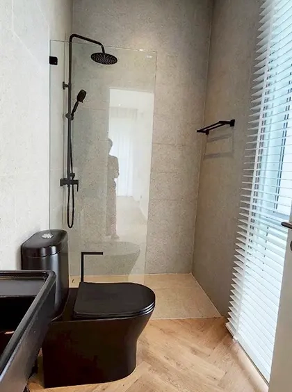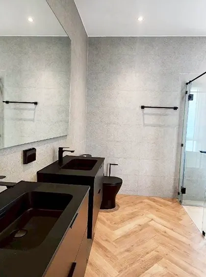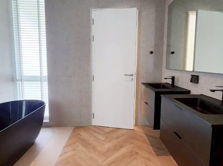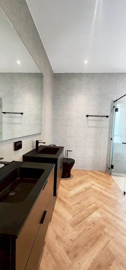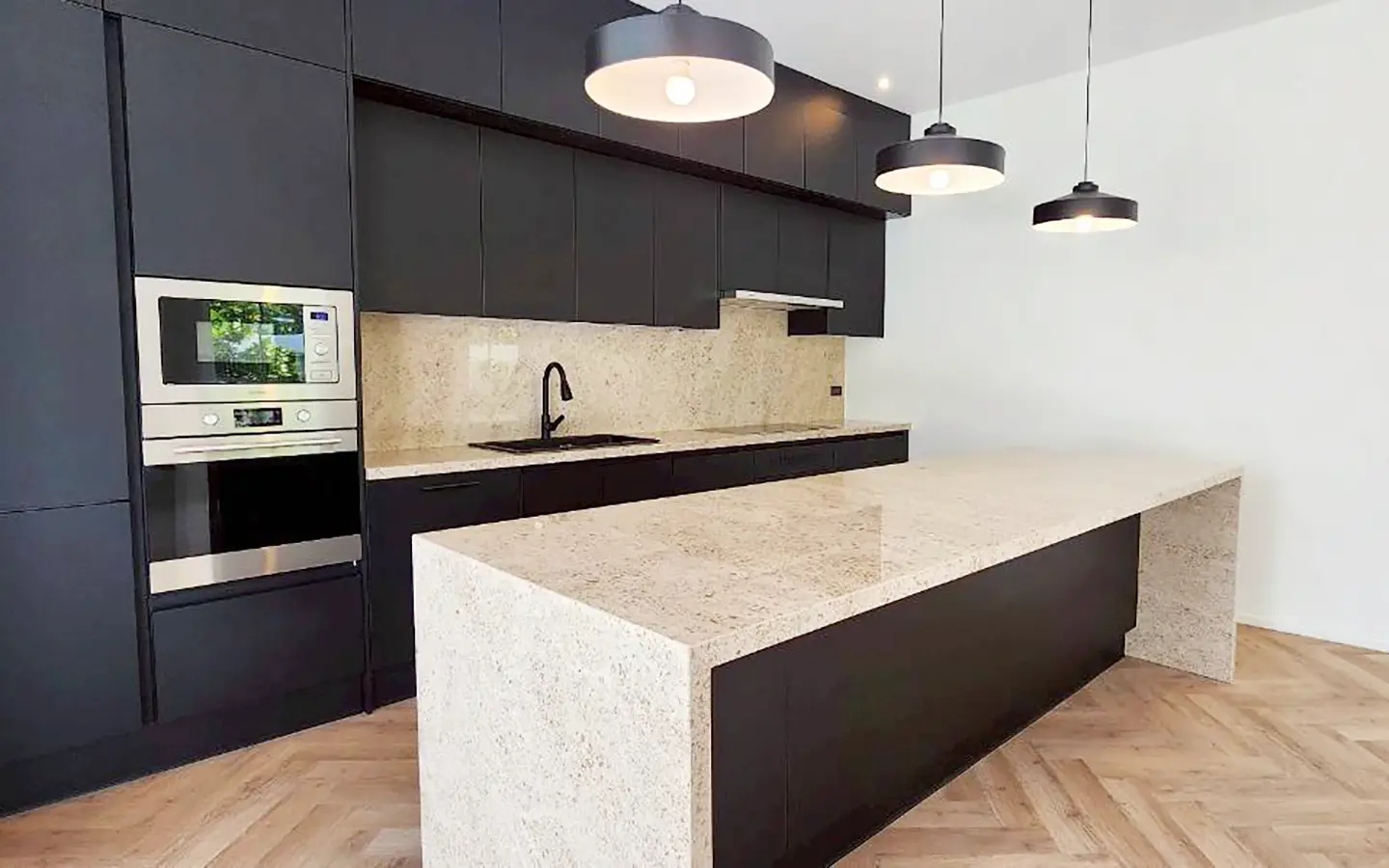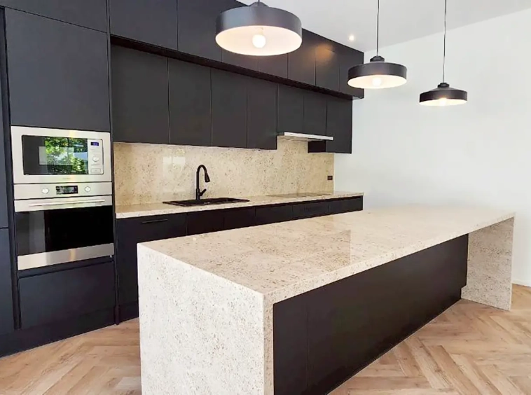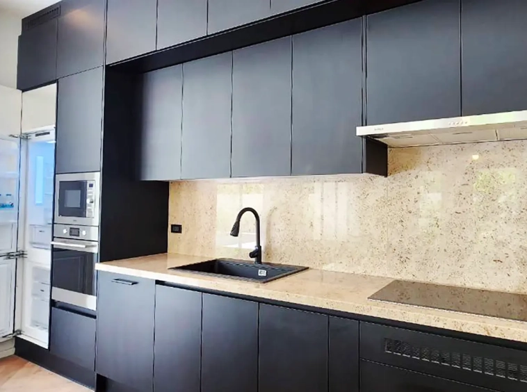 The entire living space indoors boasts a modern, high quality SPC flooring in fishbone wood design. The kitchen is state of the art with high-end finishes and appliances. Cabinets are in mat black with Italian marble countertop and backsplash. Kitchen appliances include a built-in fridge, freezer, dishwasher, oven, microwave, hood and oversized induction stove.