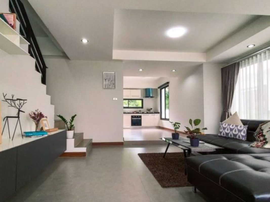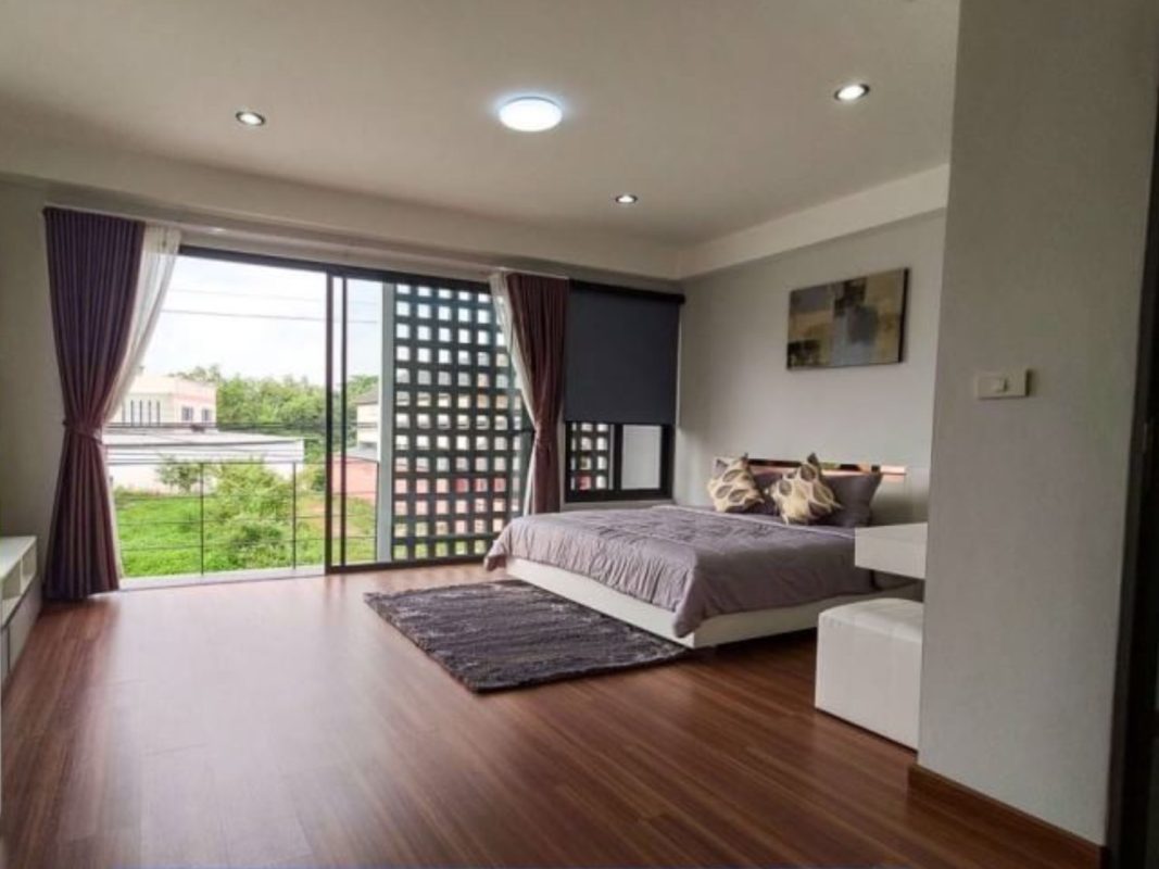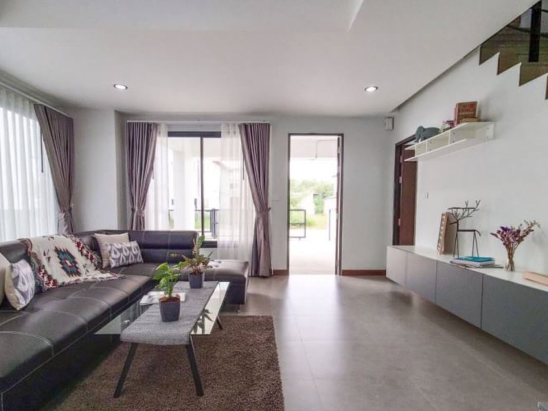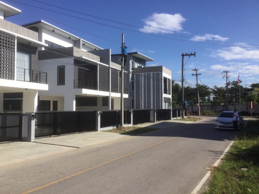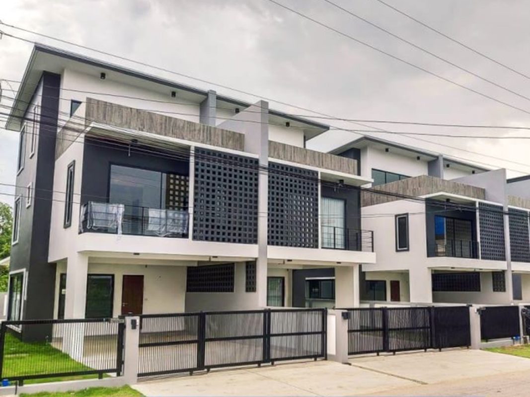 Brand new 6 townhouse project for sale in San Kamphaeng area of Chiang Mai. Located on the new San Kamphaeng just off the Outer Ringroad it is easy, less than 20 minutes, to get to the Superhighway and to Chiang Mai city center. It is also convenient to connect to Lamphun and other parts of Chiang Mai. About 25-30 minutes to reach the airport. The 3 storey townhouses are situated on a private road, each one having an 8-meter wide road frontage and occupying about 55-57Sqw. All have their parking for 2 cars, large terraces and backyard gardens. Each unit consists of 3 bedrooms, 4 bathrooms, a Western kitchen, large entertainment/theater room. The exterior is modern, the interior has pleasant earth-tone colors. The rooms are spacious, ceilings are high and many large glass windows provide good natural lighting. The project covers over 3 rais of land and is perfect for investment, whether to sell or lease out for holiday homes or as a retirement home. Great opportunity for long-term investment!